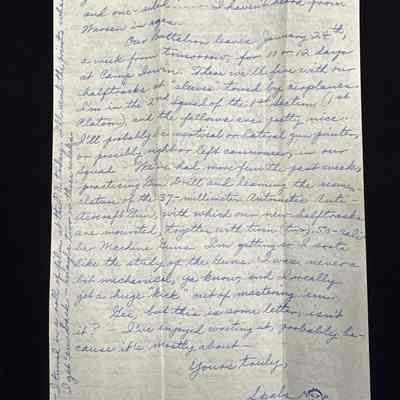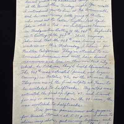 Our Battalion leaves January 24th, a week from tomorrow, for 10 or 12 days at Camp Irwin. There we'll fire with our halftracks at "sleeves" towed by airplanes. I'm in the 2nd Squad of the 1st Section (1st Platoon), and the fellows are pretty nice. I'll probably be vertical or lateral gun pointer, or possible right or left cannoneer, in our Squad. - We've had more fun the past week, practicing Gun Drill and learning the nomenclature of the 37-millimeter Automatic Anti Aircraft Gun, with which our new halftracks are mounted, together with twin (two) .50-caliber Machine Guns. I'm getting so I sorta like the study of the Guns, I was never a bit mechanical, ya know, and I really get a huge "kick" out of mastering "em.