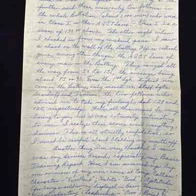 When I went down to Battalion Personnel to change my bond deduction a couple weeks ago (I told ya about this in my last letter) I saw some very interesting things in my Service Record, and learned some interesting things from Cpl. Charlie Bement, our Battery Clerk. When Charlie saw my AGCT score of 135, he said it was the highest in our Battery - B. He further said there were only ten fellows in the whole Battalion (about 1,000 men) who were in Class I on their AGCT Score. -Class I is a score of 130 or above. The other night when I checked in from my weekend pass I saw a chart on the wall of the Battery Office which gave, among other things, the AGCT Score of every man in the battery. They ranged all the way from 50 to 131, the average being about 85 or 90. Even the 1st Sgt., highest non-com in the Battery, only scored 104. Staff Sgts. Deardorff and Tunison, the two fellows who advised me to take my furlough, had 128 and 125, respectively. Well, all this must be very boring to you, but it was extremely interesting to me. I realize these scores aren't everything, however. This is all strictly confidential, so I must be careful about blabbing my mouth off.