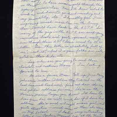 This letter is four pages, front and back, written in blue ink on very thin, plain stationery. The pages are folded in half and then thirds. The letter was mailed in an Air Mail envelope with red and blue hash marks along the outside edge.Dimensions