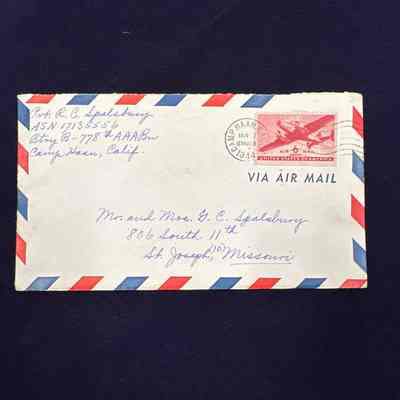 Letter Home from Pvt. R. C. Spalsbury, ASN 17135556, Btry B - 778th AAA Bn, Camp Haan, Calif. to his parents Mr. and Mrs. G. C. Spalsbury, 806 South 11th, St. Joseph (10), Missouri. Post Marked JAN 17, 1944, 11:30 AM, Camp Haan, Calif., 6 cents Air Mail stampDescription