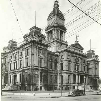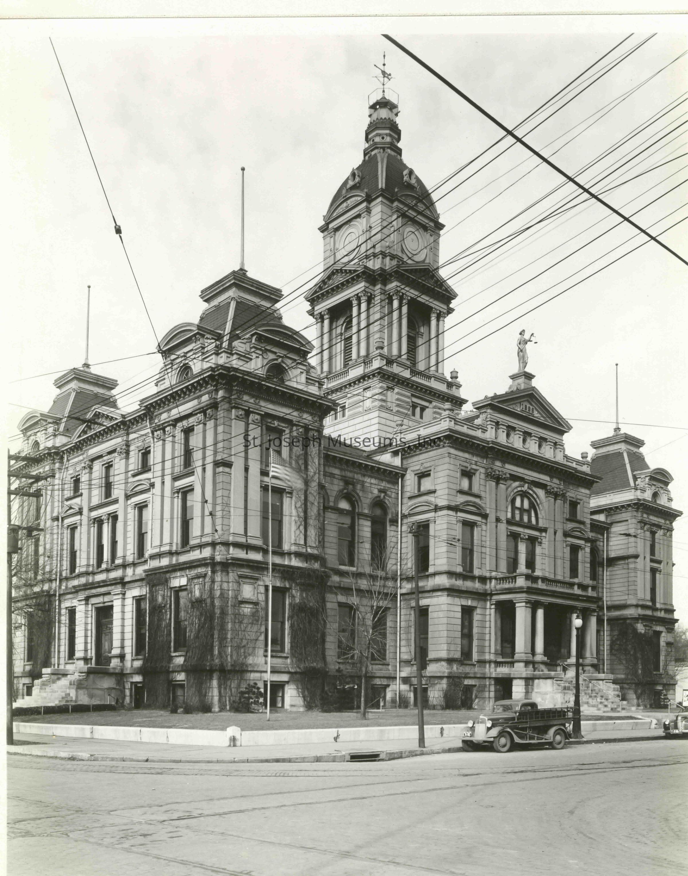 "The historic court house on South Pearl Street was perhaps the most famous landmark in Council Bluffs for almost ninety years. Construction of the court house and the Squirrel Cage Jail began in 1885 and was completed in 1888, replacing the original court house, which dated to 1868. The new court house included an 11-foot-tall statue of Lady Justice. She was placed on a platform 74 feet above the sidewalk for some 90 years. The statue is now displayed in the lobby of the current 1978 court house. The ground for the new modern facility was broken in February 1975 and the building was dedicated November 20, 1977.