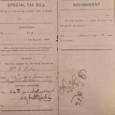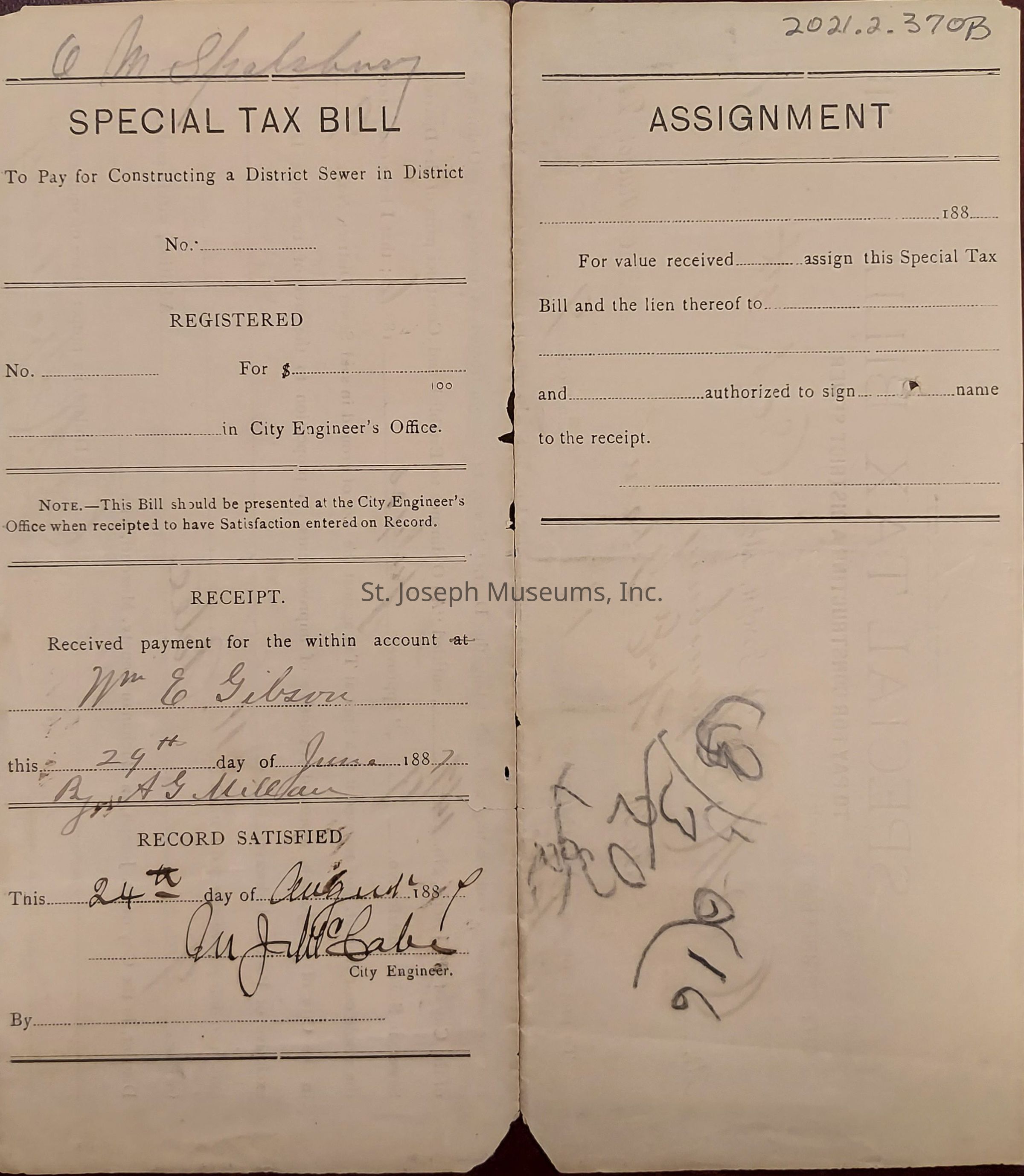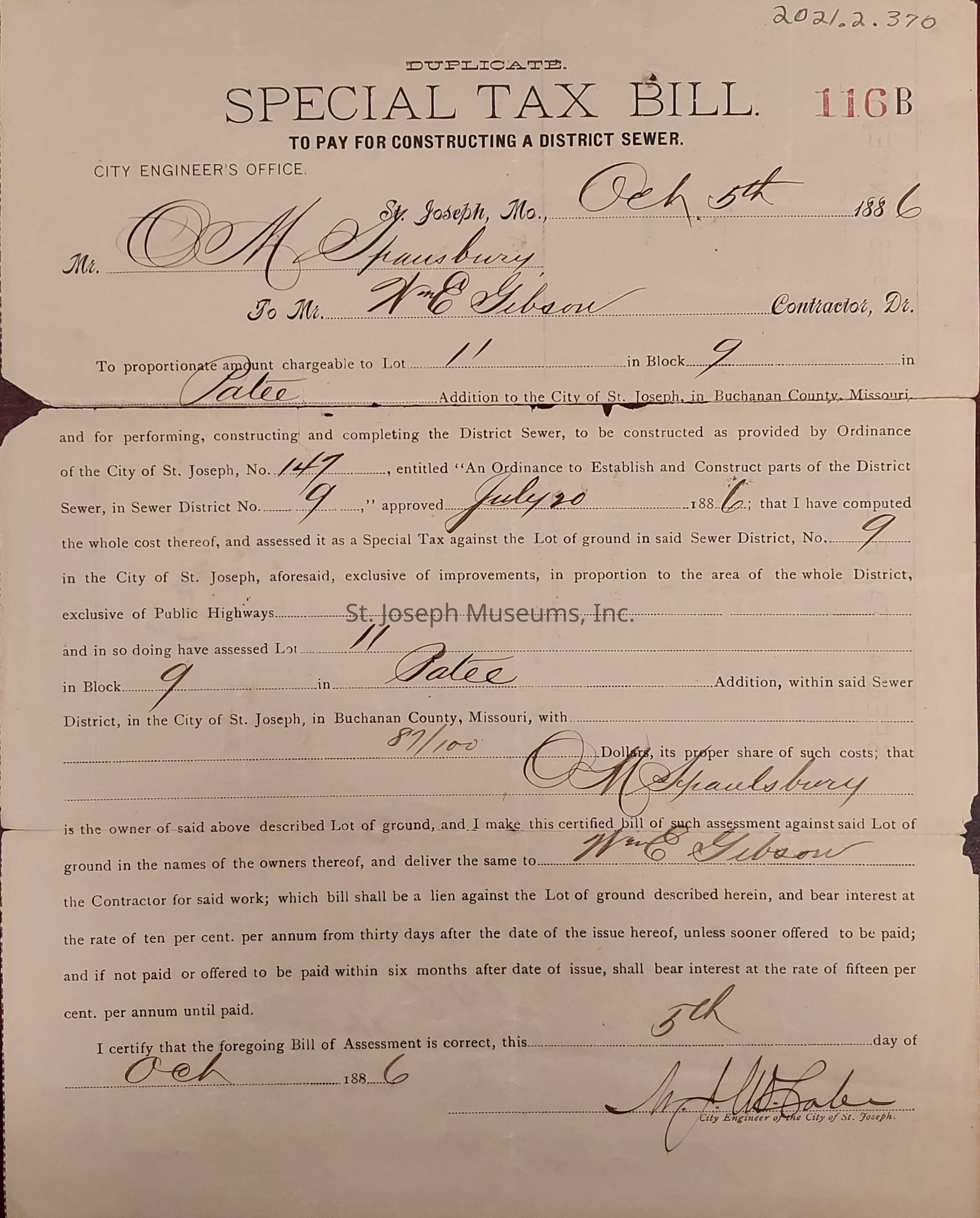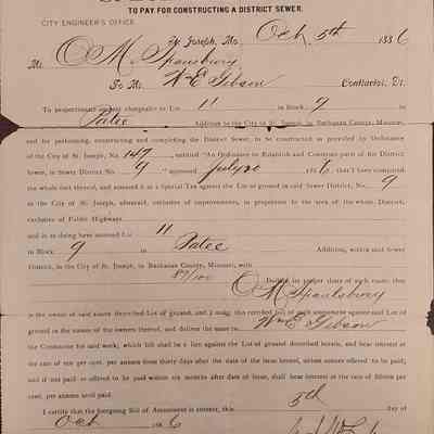 A tri-fold Special Tax Bill for O. M. Spalsbury for work to be performed by Mr. Wm. E. Gibson, Contractor, dated Oct 5th 1886 to pay for constructing a district sewer. The document is rendered by the City Engineer's Office, St. Joseph, Mo. Collector.Context