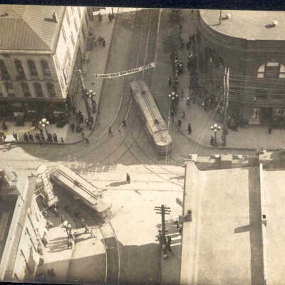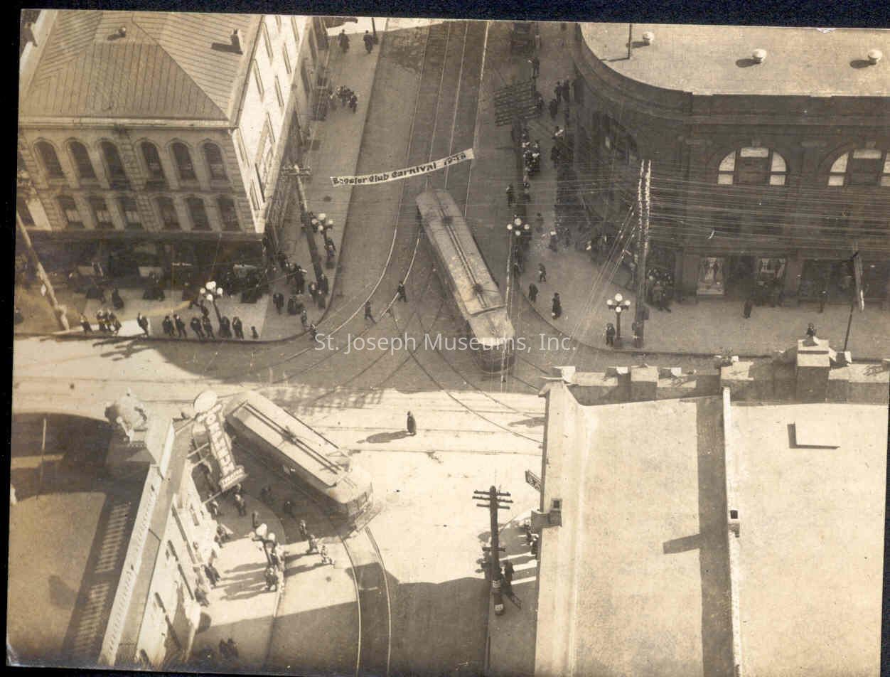 Downtown St. Joseph Aerial View of 5th & Edmond Intersection Photo, c. 1920's. b/w. Taken from top of building. Two trolleys turning the corner at this intersection. Banner across street "? Club Carnival?)".
