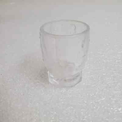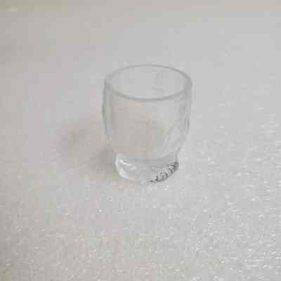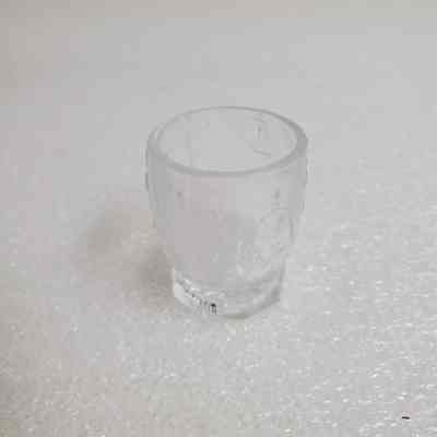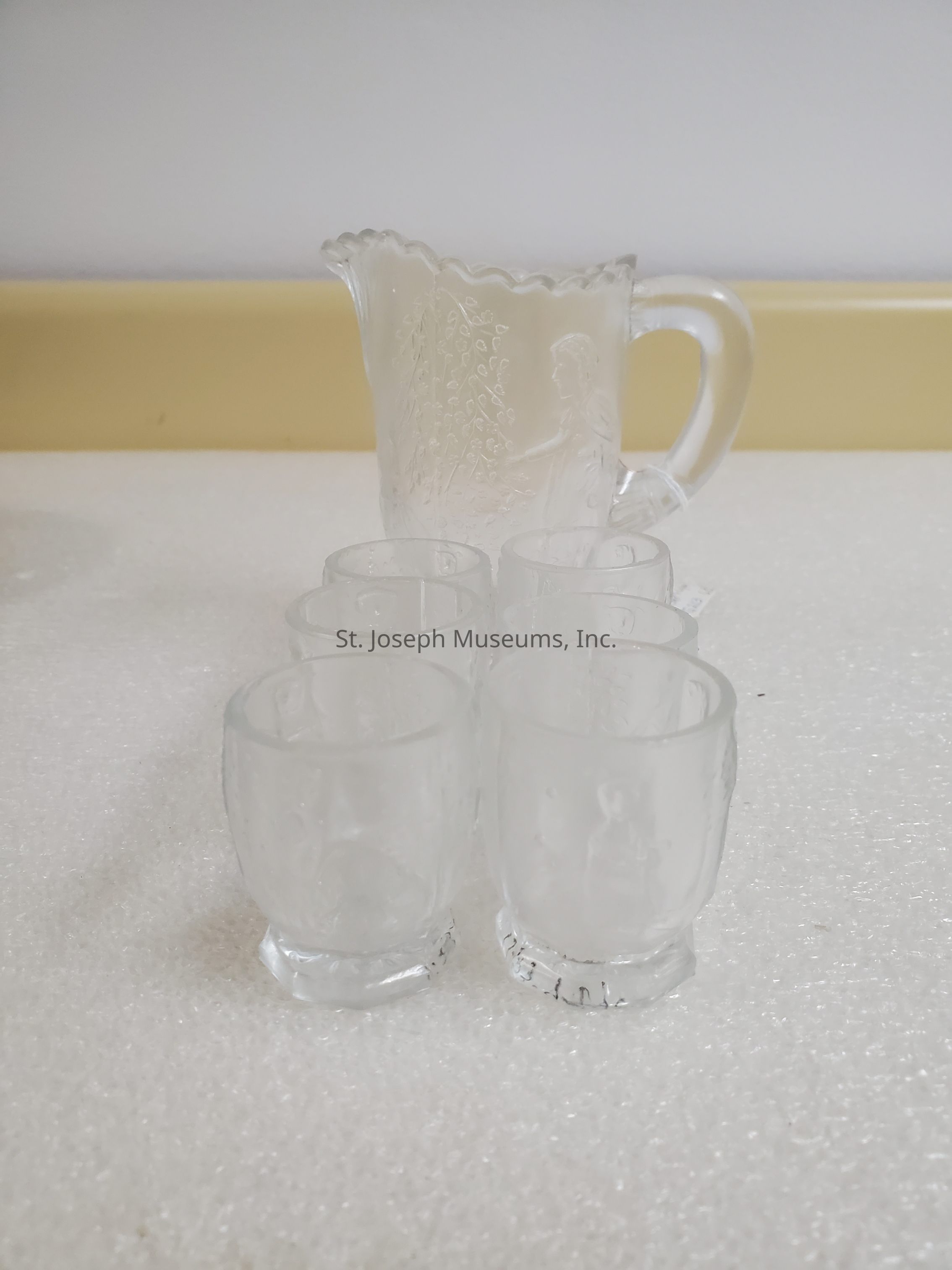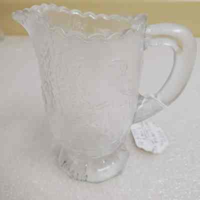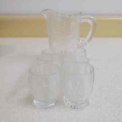 Red Riding Hood Pitcher with 6 glasses. Clear/etched. Pitcher 4" tall. Glass 1 3/4" tall.