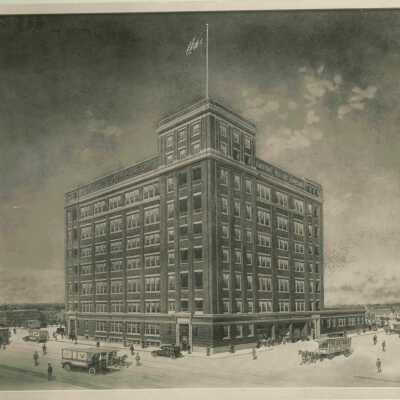 National Biscuit Company, Mateo & Industrial, Los Angeles, California, Southwest Corner, 1924-1925. Designed by Eckel & Aldrich, Architects. Constructed 1924-1926. Cracker Bakery. Also see 07.33.900B-D 07.33.900A Drawing, Exterior View, front & side of building, 11 ½" x 14" There are 2 duplicate prints.