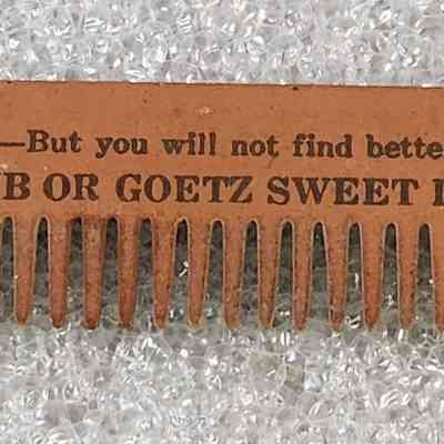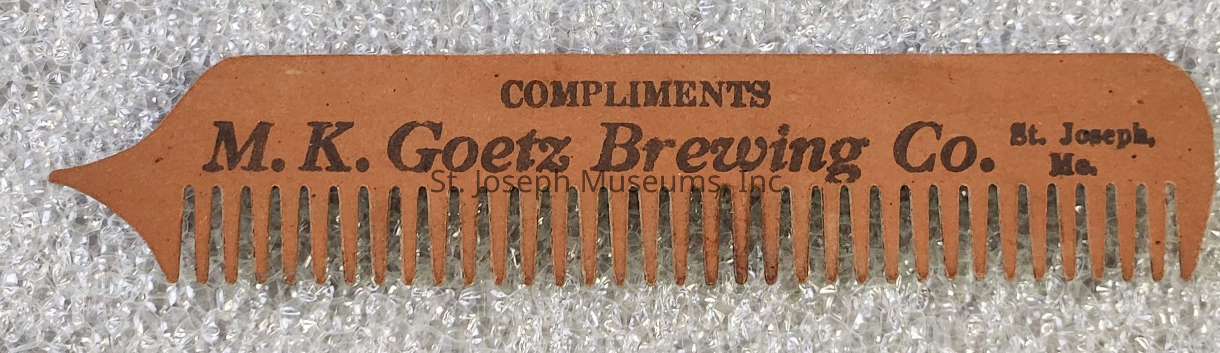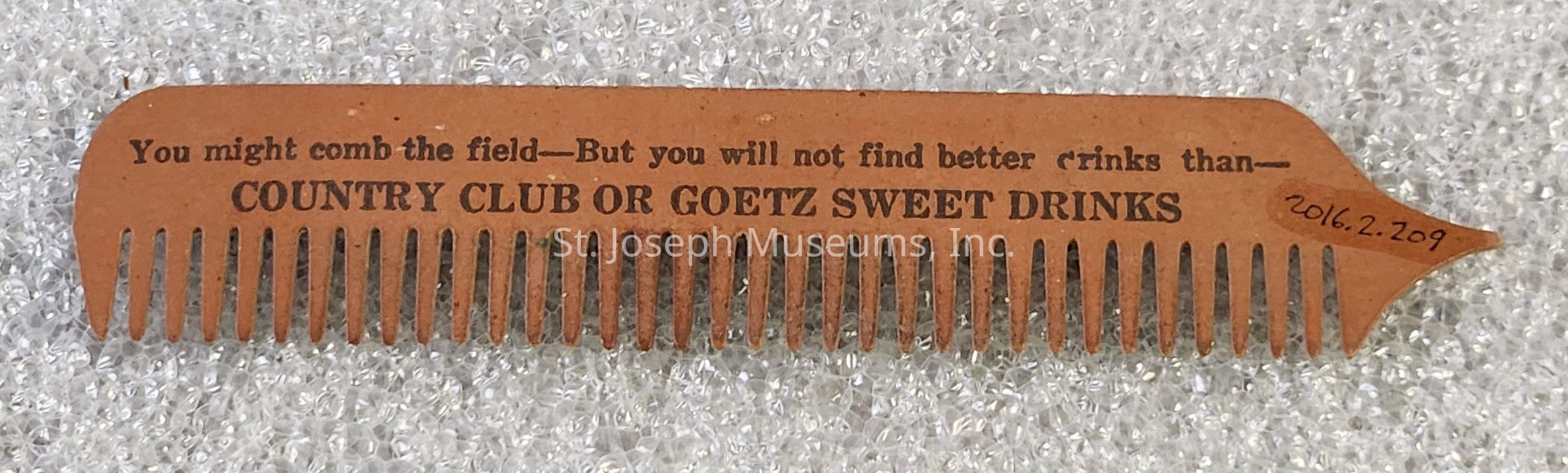 Comb, wooden. Item is a thin wooden hair comb, with an end drawn into a teardrop point, and the other rounded. Teeth are along the bottom edge. The comb is brown and has black text. On one side is, "COMPLIMENTS M. K. Goetz Brewing Co. St. Joseph, Mo.". On the other side is, "You might comb the field-But you will not find better drinks than- COUNTRY CLUB OR GOETZ SWEET DRINKS". 5"x1"Collection