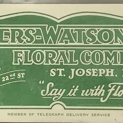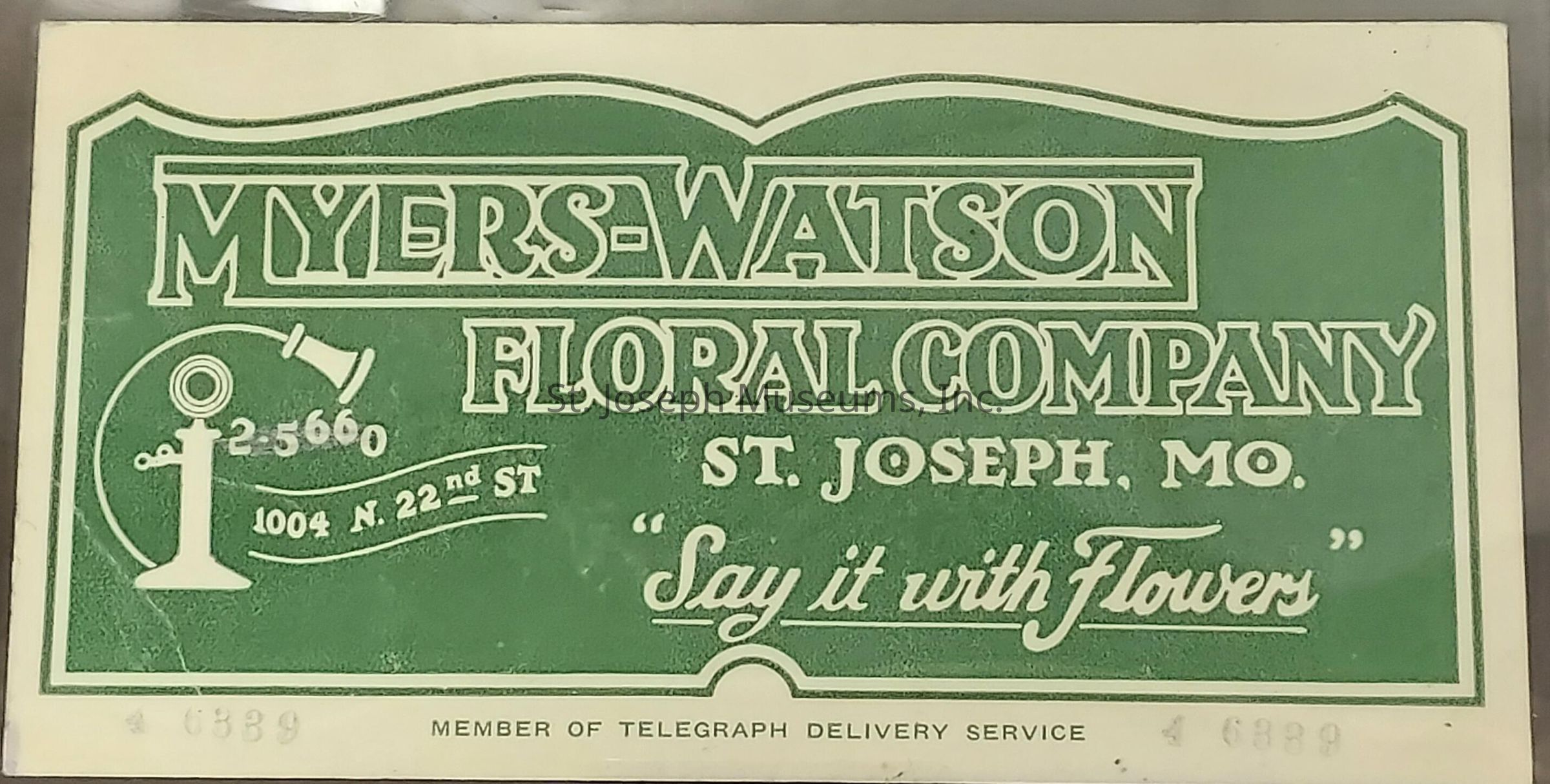Myers-Watson Floral Company Ink Blotter. The blotter is green with white printing. Their motto is "Say it with Flowers". The address is 1004 N. 22nd Street, telephone number 2-5660. Dated c. 1920.