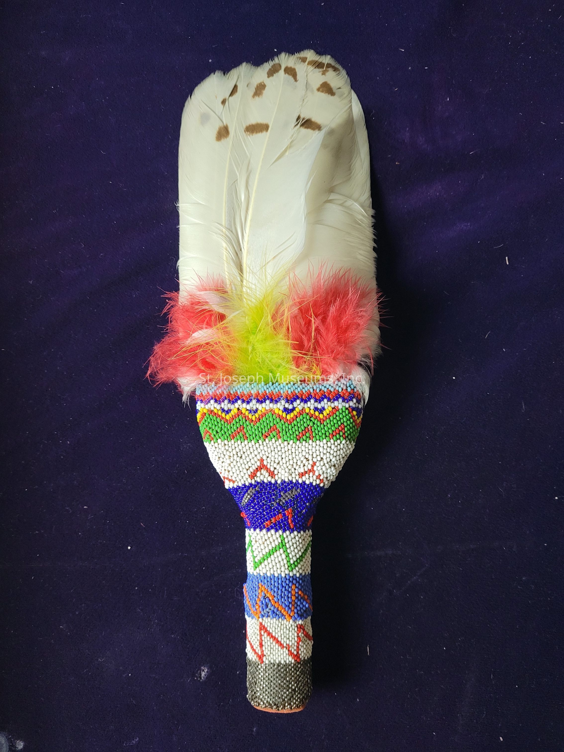 Peyote Fan/ceremonial/Snowy Owl Tail feathers/down feathers/wood/bark/glass & metal beads/native leather/pigment/poss Fox (Mesquakie)
