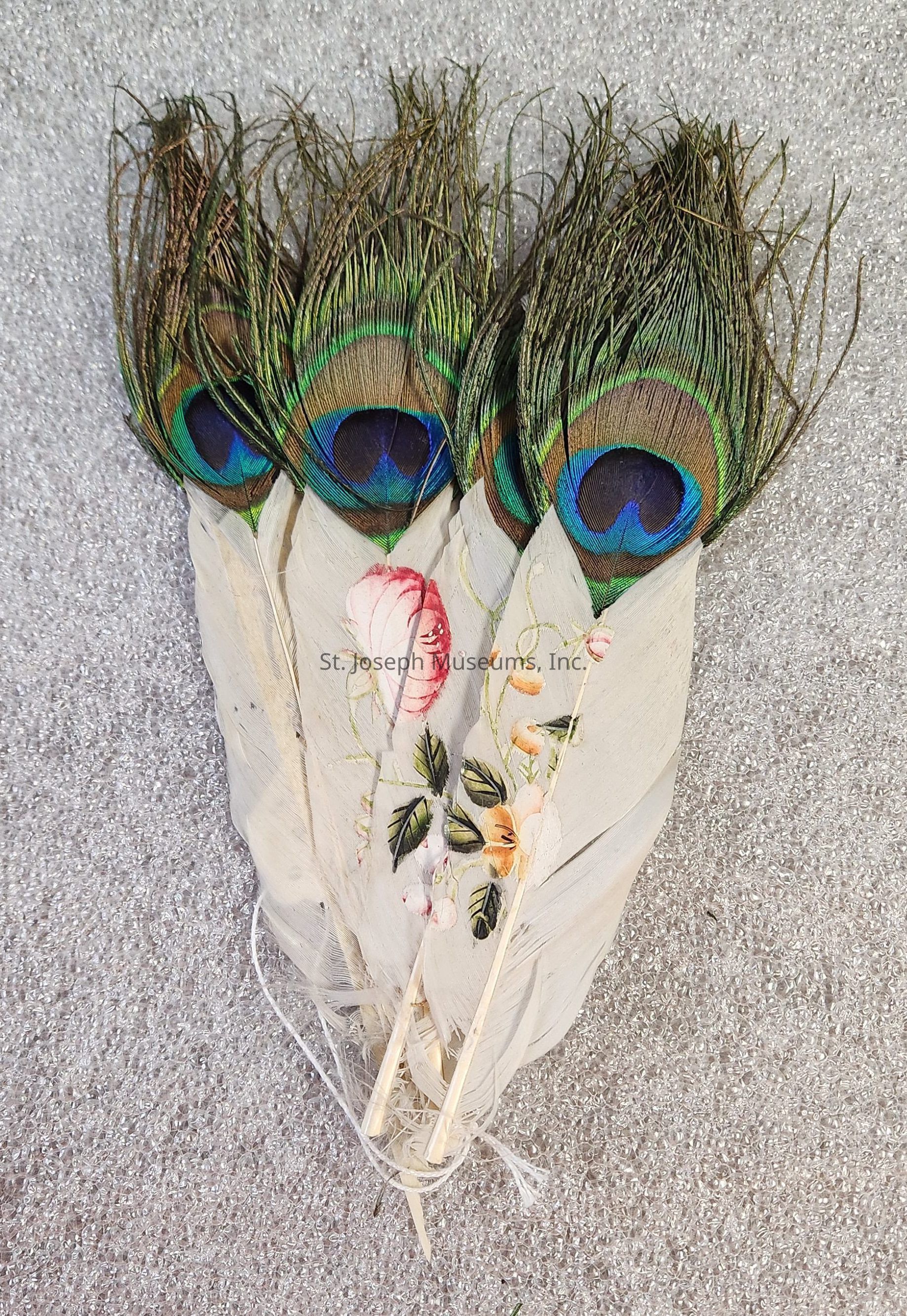 Fan/Peacock Feather/Wooden Back with Intricate Designs/Held together by Thread/Floral Design Painted on Feathers/10"x2".