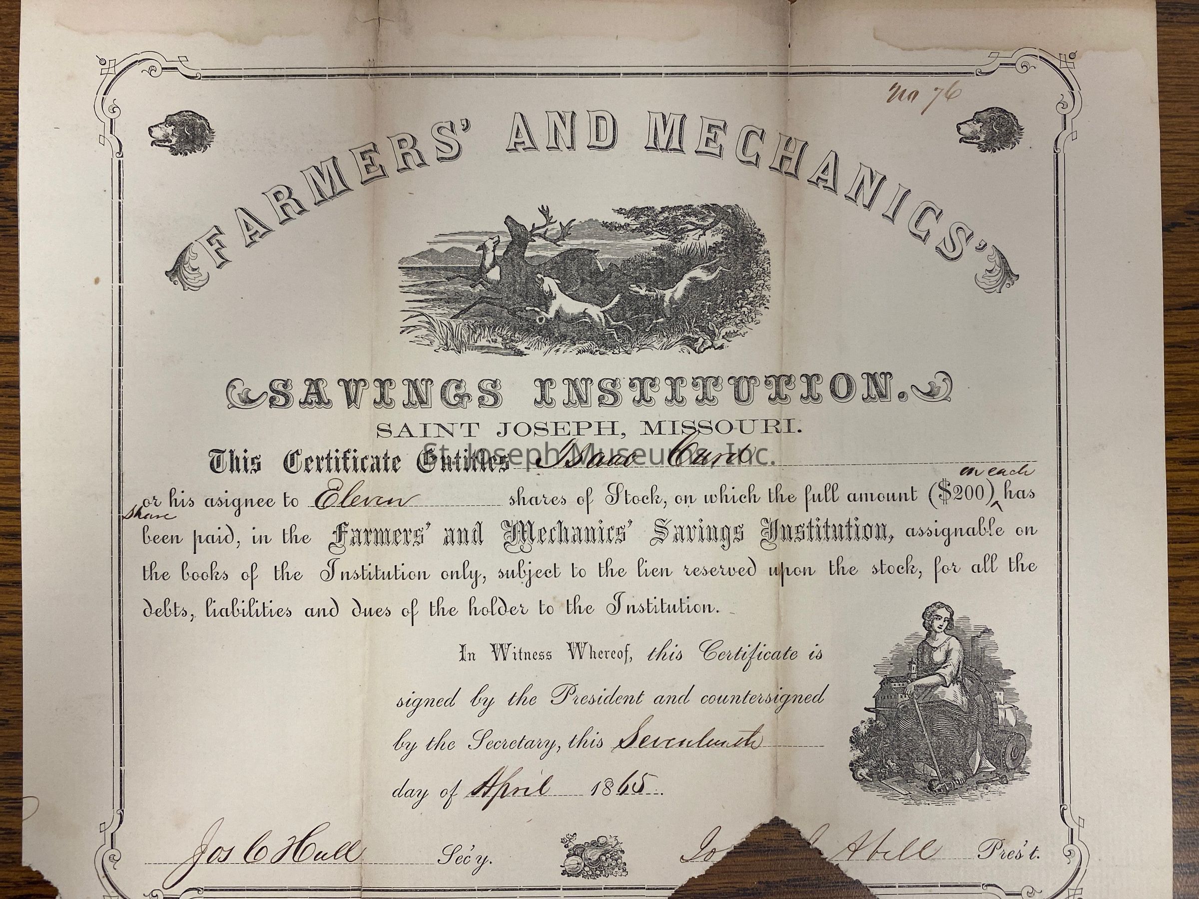 14.26.428: April 17, 1865, 11 shares, $200/share. . Signed by Jo. Abell, Pres't.Collection