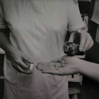 State Hospital Staff Photo of Psychiatric Aid Dispensing Medication, c. 1970. A psychiatric aid shakes pills from a bottle into someone's hand.