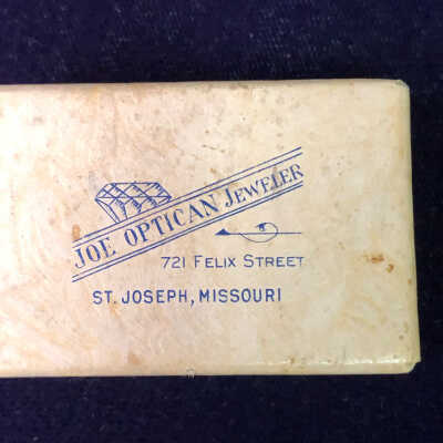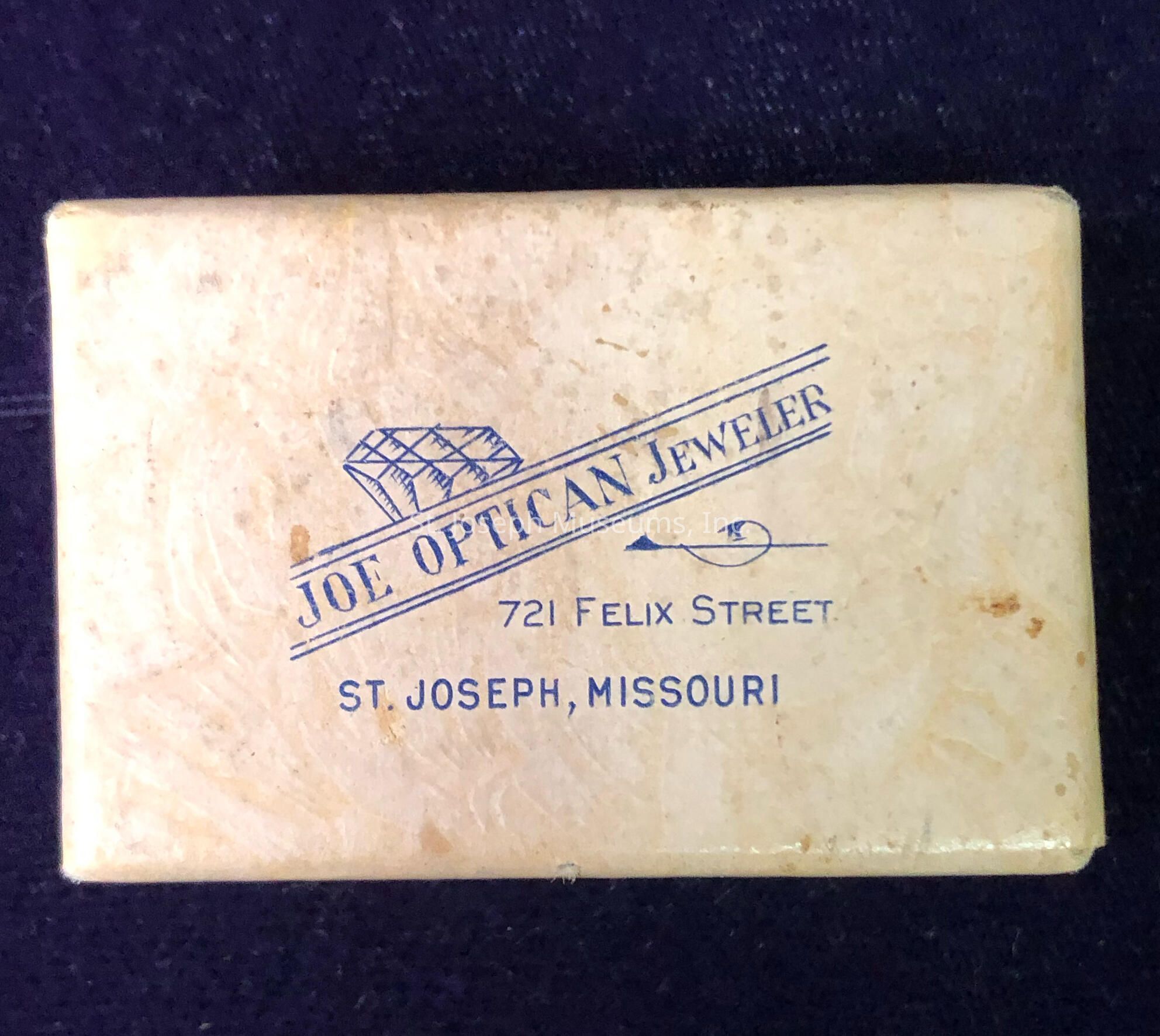 Joe Optican Jeweler's box. White jewelry box with blue lettering. Reads, "JOE OPTICAN JEWELER 721 FELIX STREET ST. JOSEPH, MISSOURI" 1.5"hx2"w