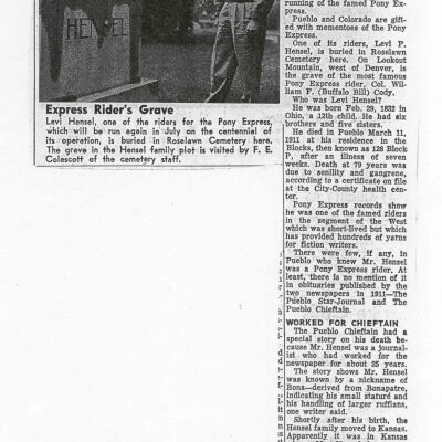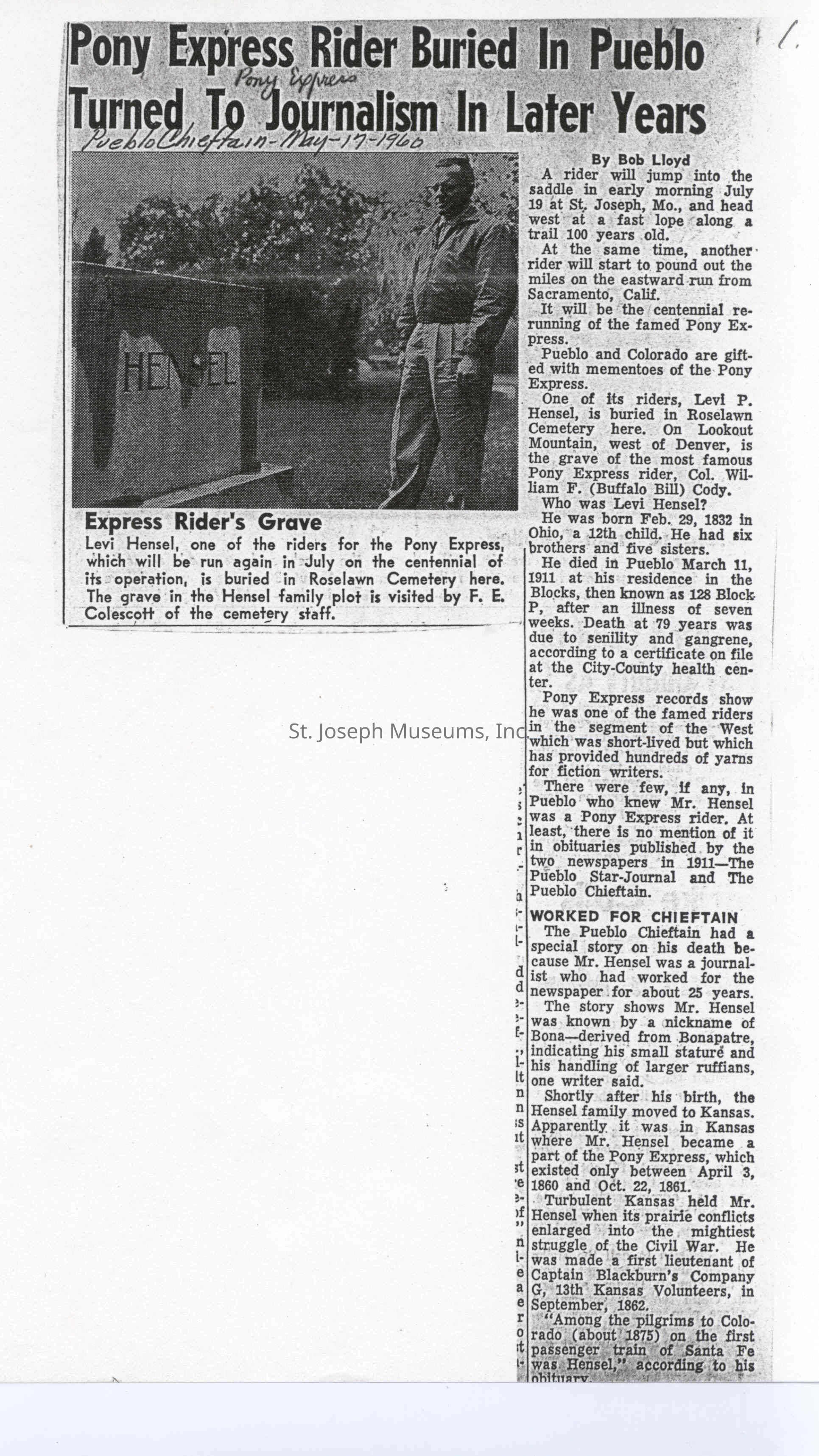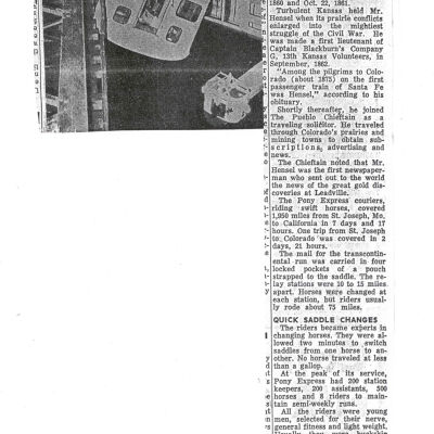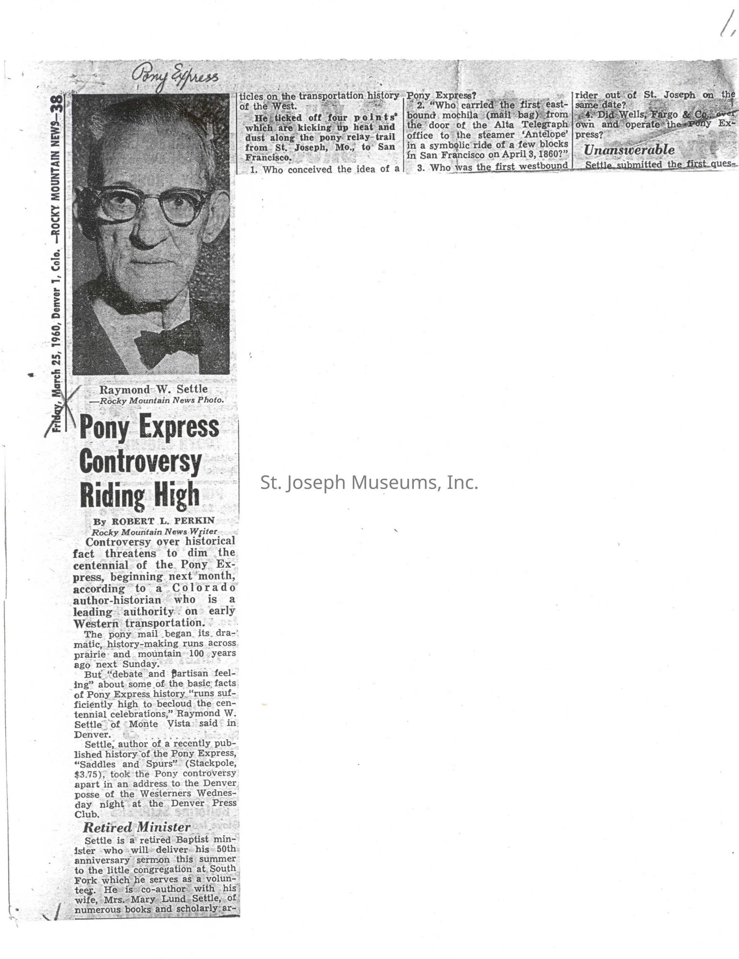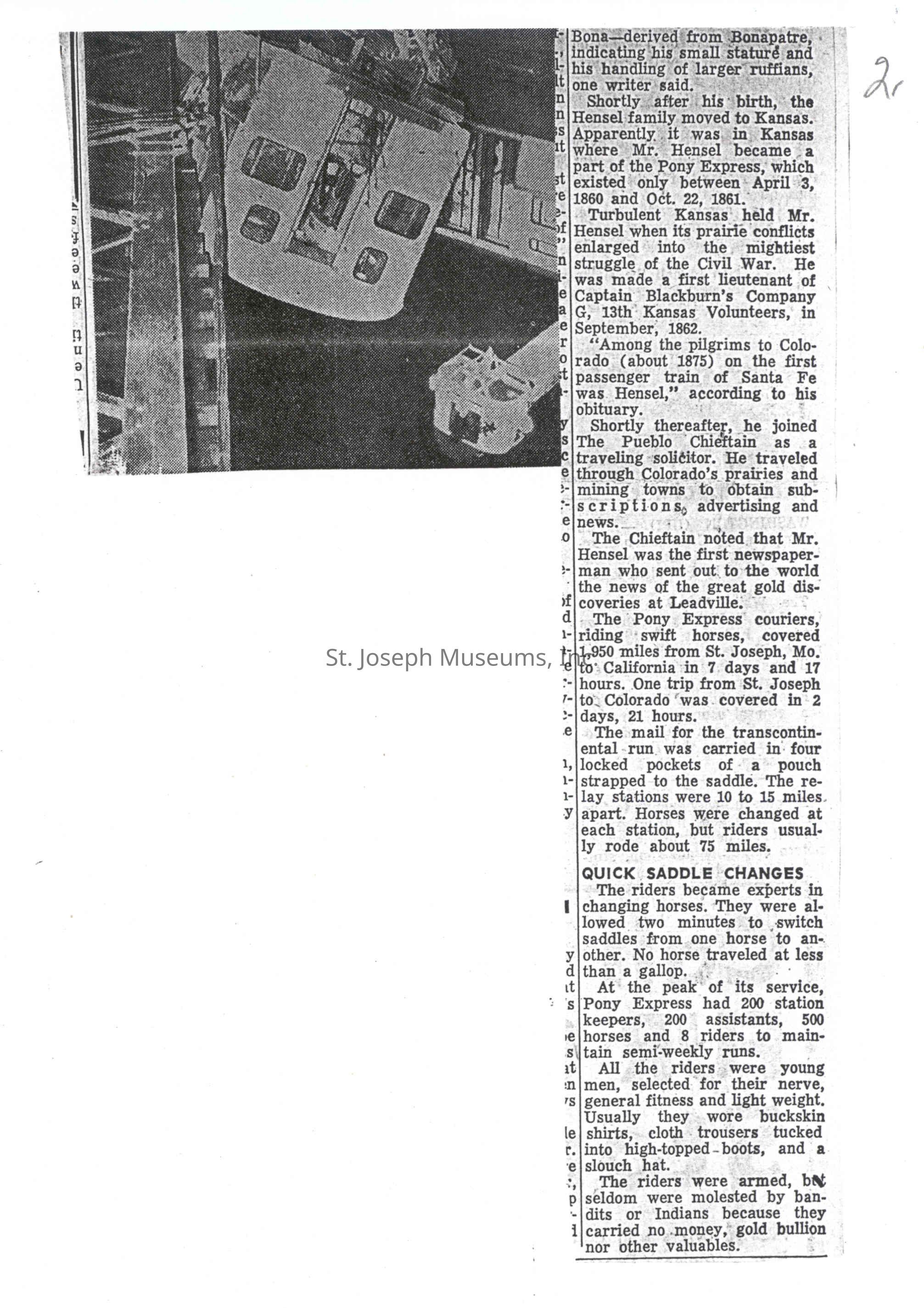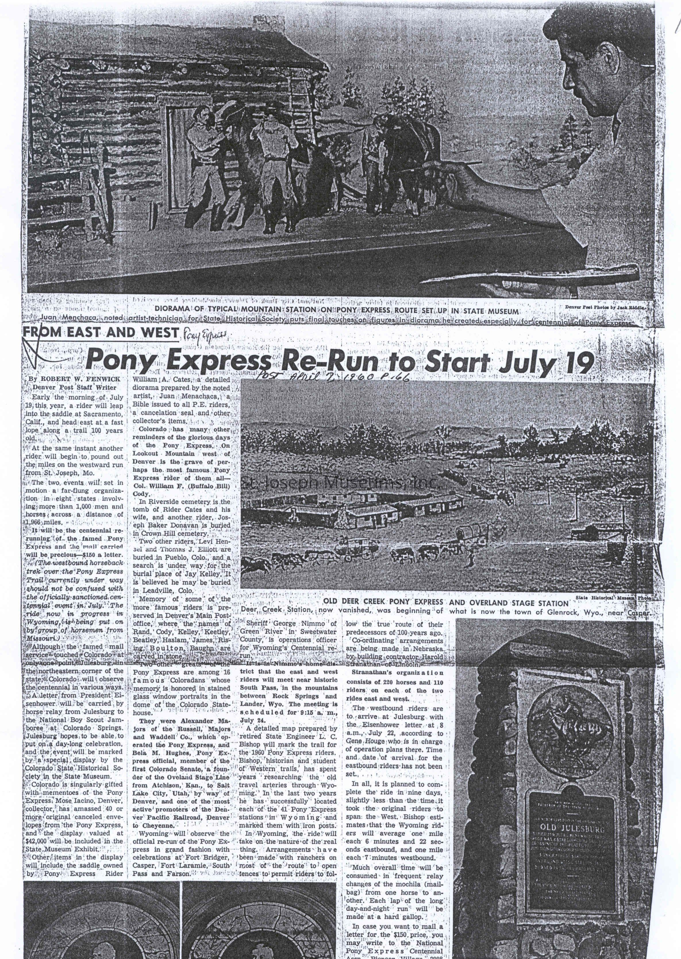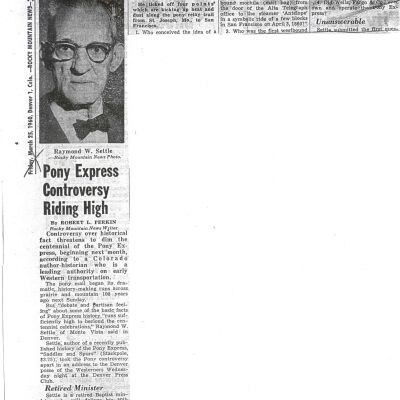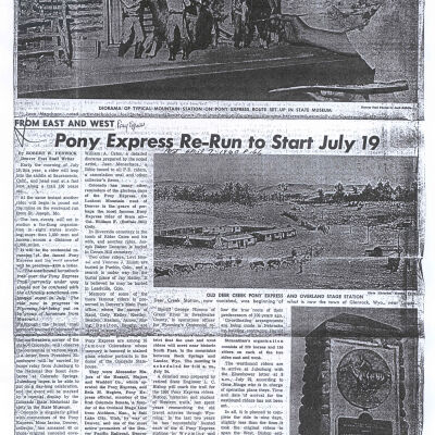 Files contain correspondence with Pony Rider descendants, Pony Express rider biographies, newspaper clippings related to the Pony Express, and miscellaneous records, photos, and documents collected from major private and University libraries among other sources. NOTE ABOUT ORIGIN OF LIBRARIES FILE. Prior to the opening of the renovated Pony Express Museum in 1993, St. Joseph Museum staff did extensive research on the Pony Express. All of the libraries in this folder were visited and copies of all material related to the Pony Express were made. This was done from 1991 to 1993. Information from this research was used in the new exhibits of the Pony Express Museum and in preparation of the book On the Winds of Destiny. In 2015, the file from the Pony Express Museum was added. Jackie Lewin 7/27/15 CD containing scans of actual documents found in Pony Express Research Files located in file cabinets in Document Storage II area.