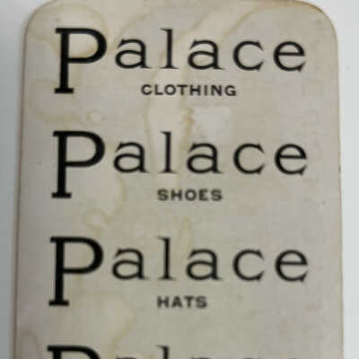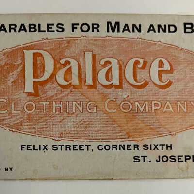 Business Card Palace Clothing Co., "Wearables for Mand & Boy/ Hats, Shoes, Trunks, Valises. Doing business at the corner of 6th & Felix, St. Joseph, MO, 1900.