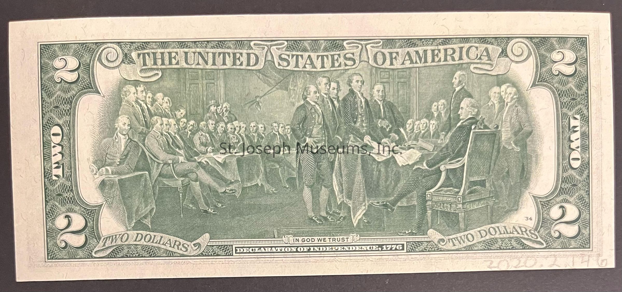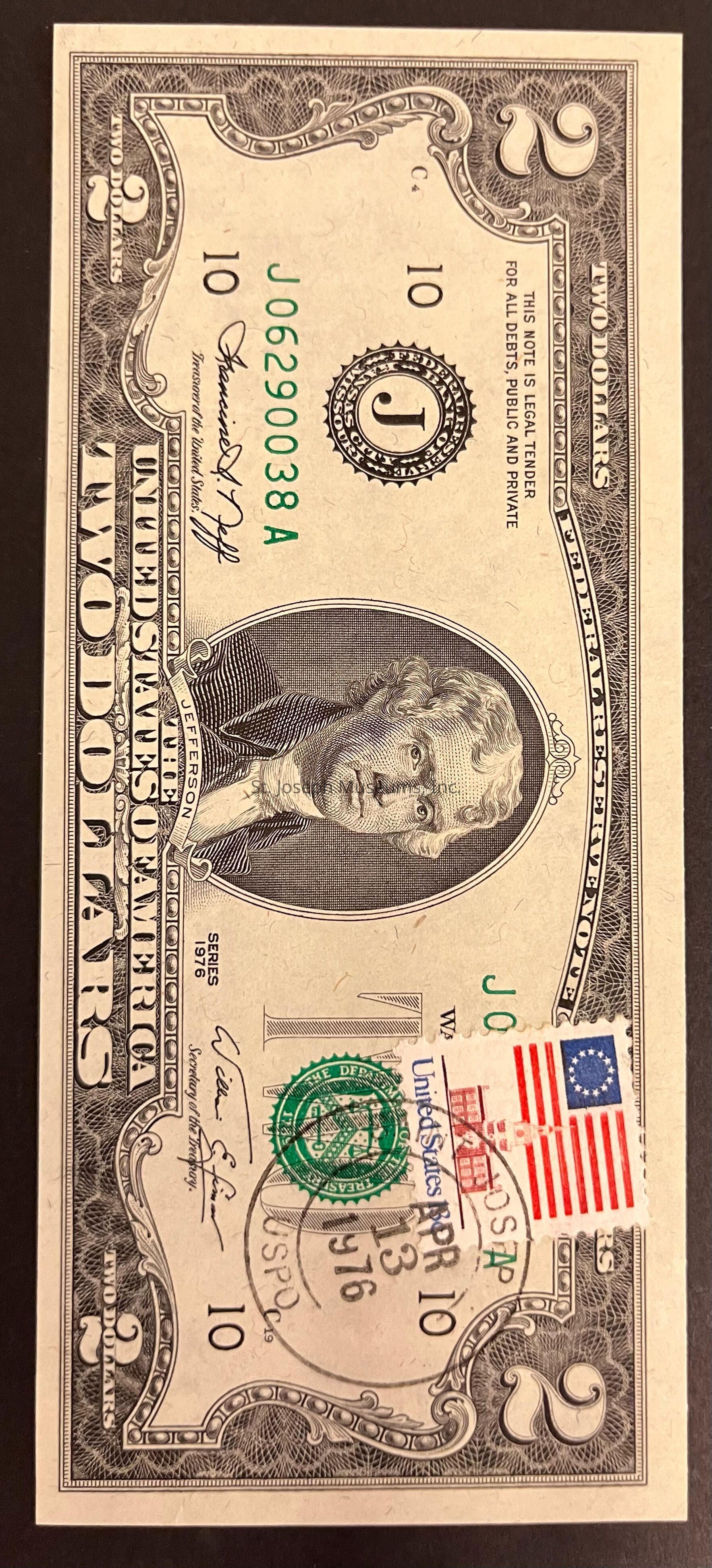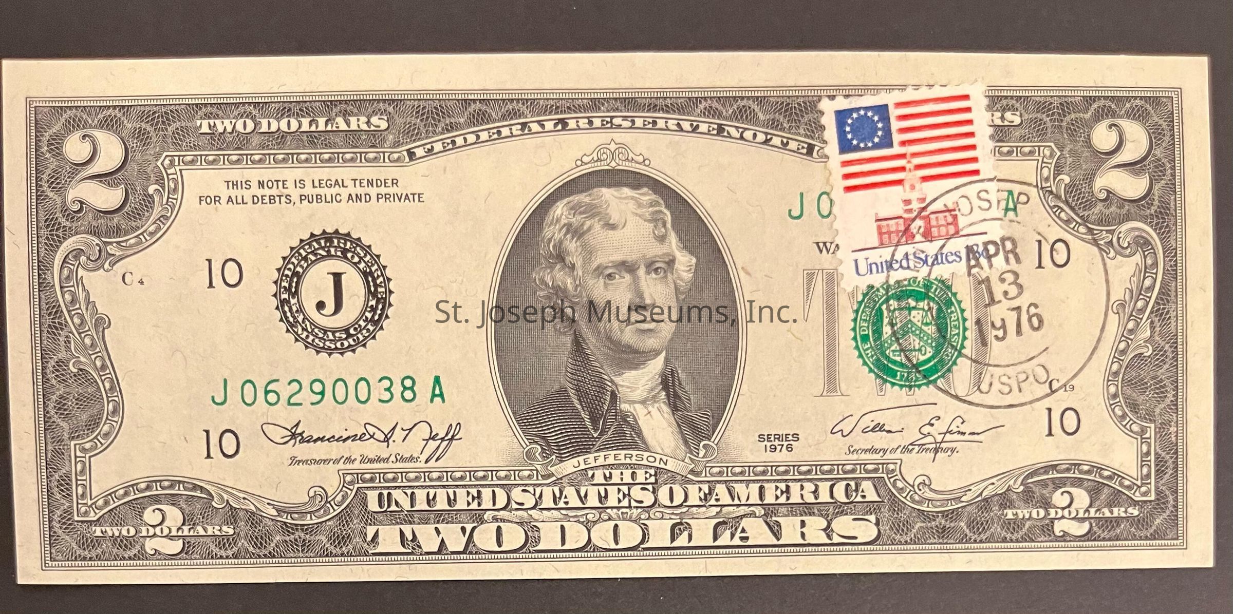 Federal Reserve Note two dollar bill series of 1976, serial number J06290038A. Front: Marked "C" and "10". Large portrait of Jefferson centered. "THIS NOTE IS LEGAL TENDER FOR ALL DEBTS PUBLIC AND PRIVATE" is written to the left, above a seal saying "FEDERAL RESERVE BANK OF KANSAS CITY MISSOURI" with a "J" in the center. "TWO" is written over a treasury seal to the right. A stamp has been placed on the bill, showing the U.S. Capitol Building below a 13 star flag. On top of that is a circular stamp saying "ST JOSEPH USPO" with "APR 13 1976" in the middle. Back: Large portrait of the signing of the Declaration of Independence, 1776. 6.25"lx2.75"hCollection