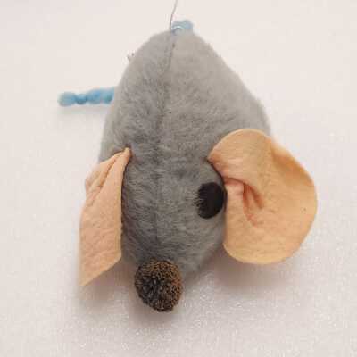 Stuffed grey mouse with fuzzy fabric. Mouse has large floppy pink ears and a blue yarn tail and brown yarn ball nose.
