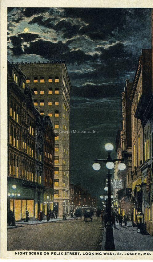 Felix Street Night Scene, West from 6th, St. Joseph, Missouri, Photo Postcard, 1914 Colorized photo taken from intersection of 6th & Felix looking West. Corby Building in center on left. Kahn Hats on right. Horses & Carriages in Street. Streetlamps lit as well as windows in stores. (Same as 14.7.1WW)