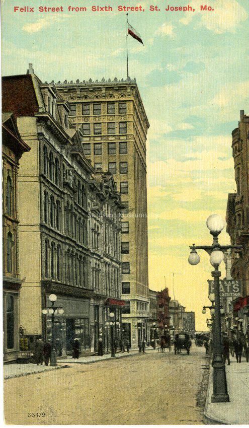 Felix Street , West from 6th, St. Joseph, Missouri, Photo Postcard, c. 1900. Colorized photo taken from intersection of 6th & Felix looking West. Corby Building in center on left. Kahn Hats on right. Horses & Carriages in Street. Unmailed. Same card as 91.1.105.