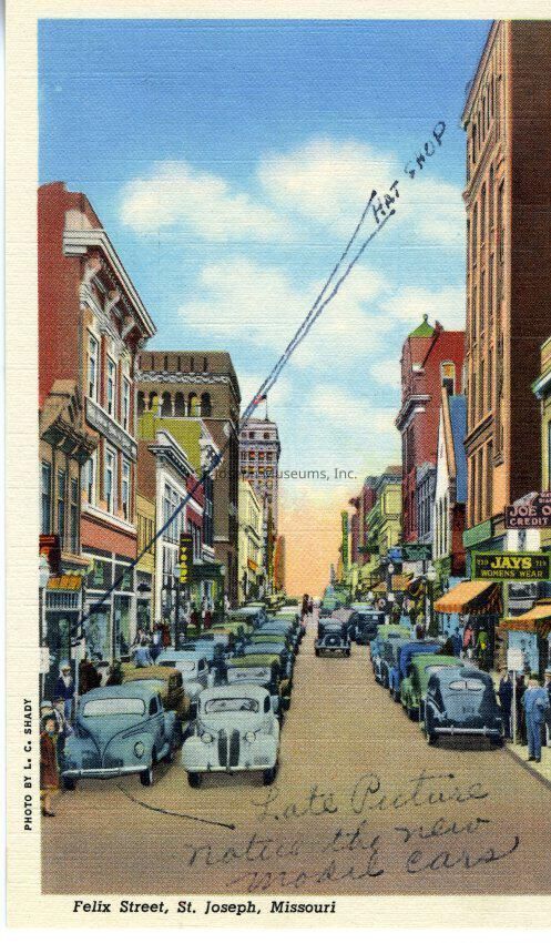 Felix Street, St. Joseph, Missouri, Photo Postcard, c. 1930. Colorized photo taken from intersection of 8th & Felix looking West. Corby Building in background on left. Joe Optican Jewelers and Jay's Women's Wear in foreground on right. Plymouth sign in background on right. Streets lined with automobiles. Handwritten on front...an arrow to shop in foreground "Hat Shop" also "Late Picture notice the new model cars". Photo by L.C. Shady. Unmailed Handwritten on back: "Spot marked by arrow should be your building on Felix Street".