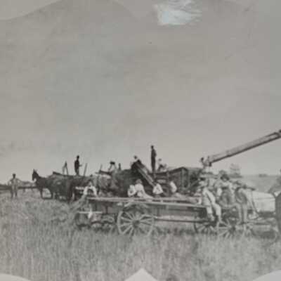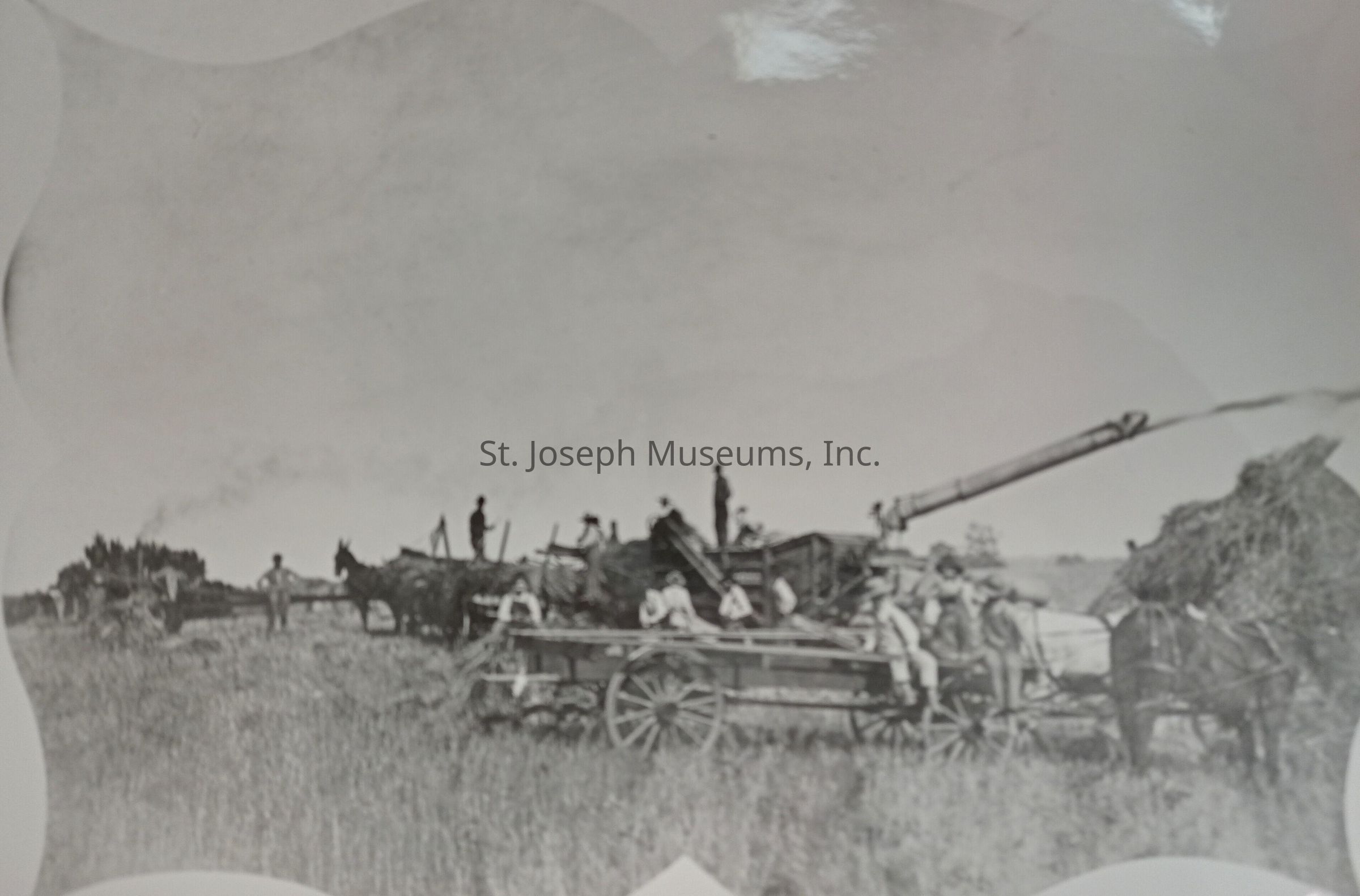 Black-and-white photograph of a group of workers operating a horse-drawn threshing machine in a field.