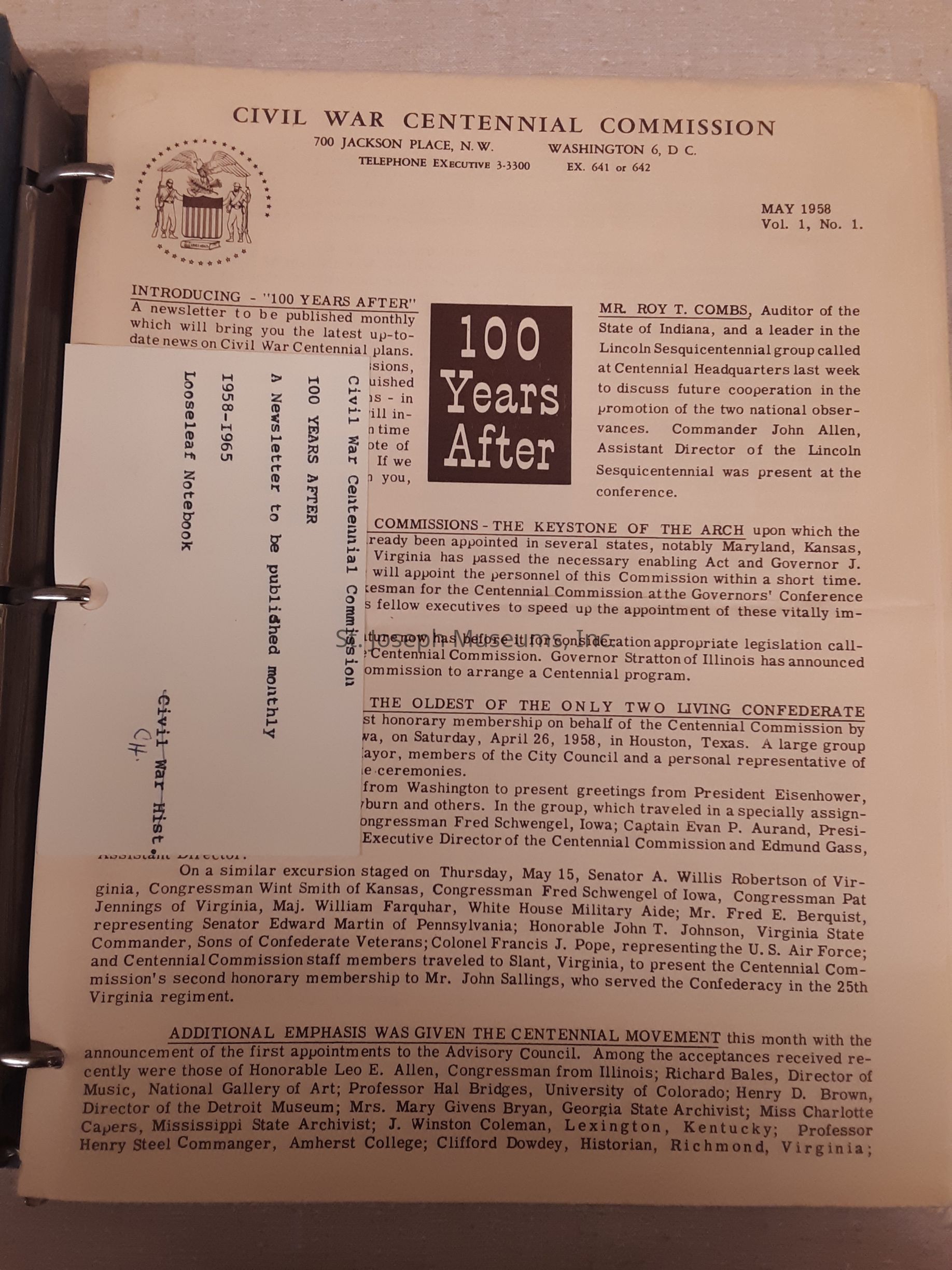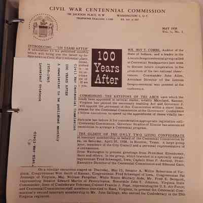 This is notebook of newsletters published monthly by the Civil War Centennial Commission. It gives interesting facts including names and ages of veterans still living, reenactments, reports of centennial celebrations in various states, exerpts of newspapers from Civil War period