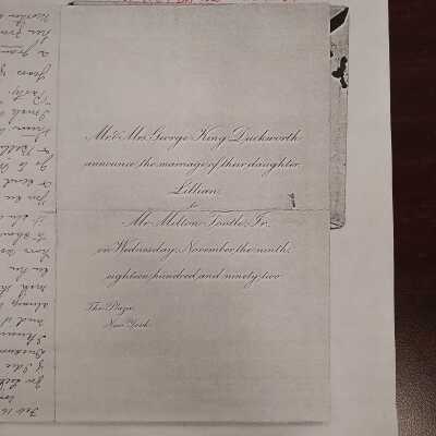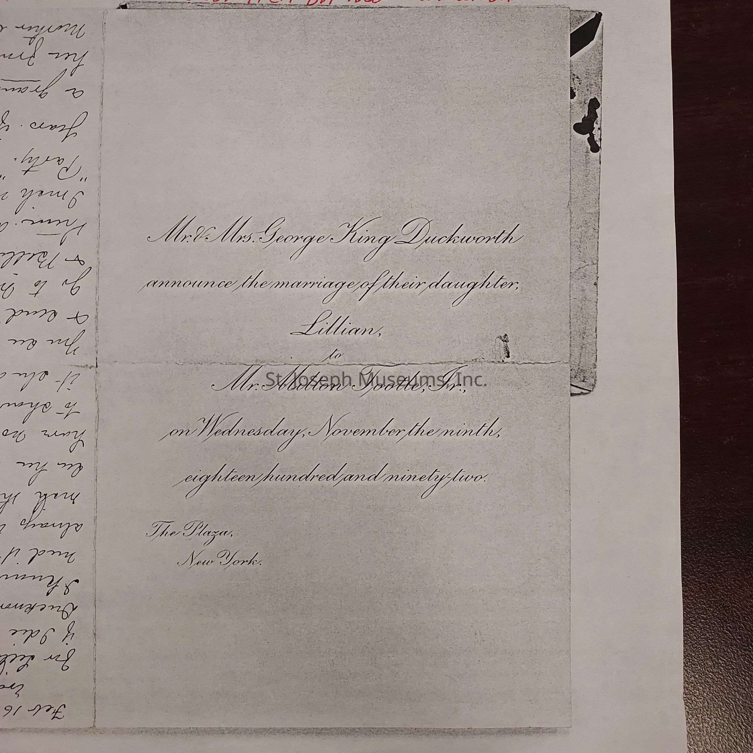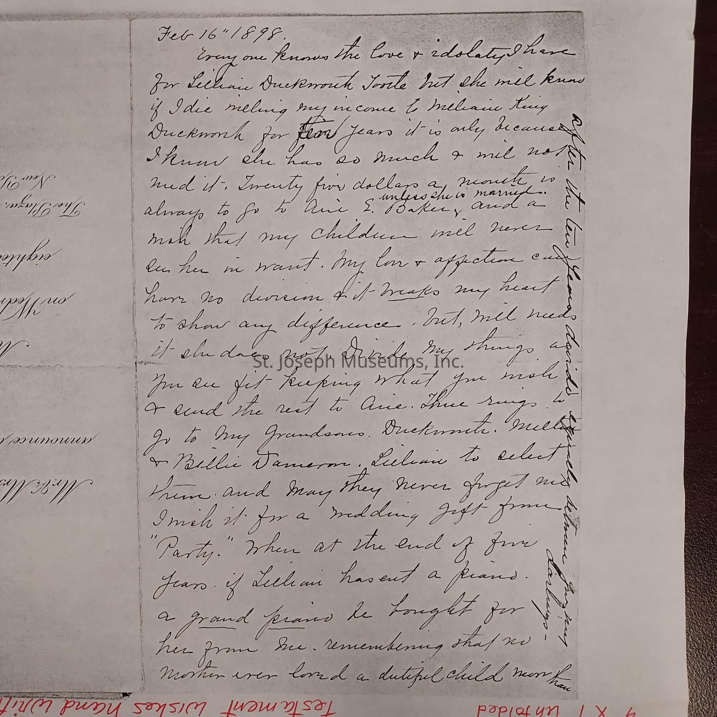 Last Wishes of Lucy B. Duckworth hand-written on the back of a marriage announcement of Lillian B. Duckworth to Milton Tootle, February 1, 1898. Envelope included.