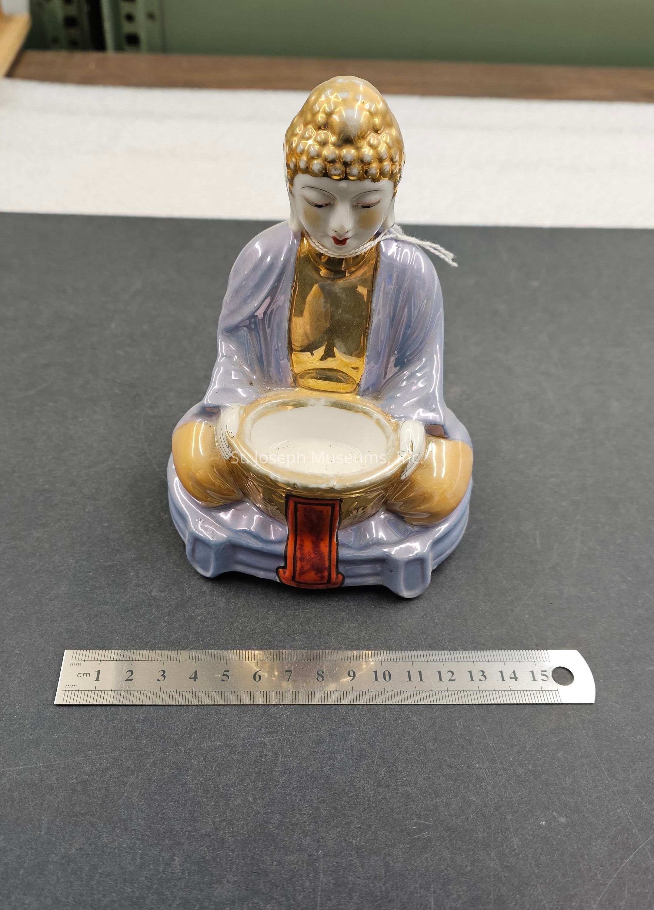 Visually similar incense burners were found that were created in Japan. These incense burners had slight differences - the base that is present in this item were not present in those that were found that looked similar and there were slight differences in the face. However, there were no seated Buddha incense burners that looked anything similar to this that were found to have been made in China. Accession book lists item as Chinese.