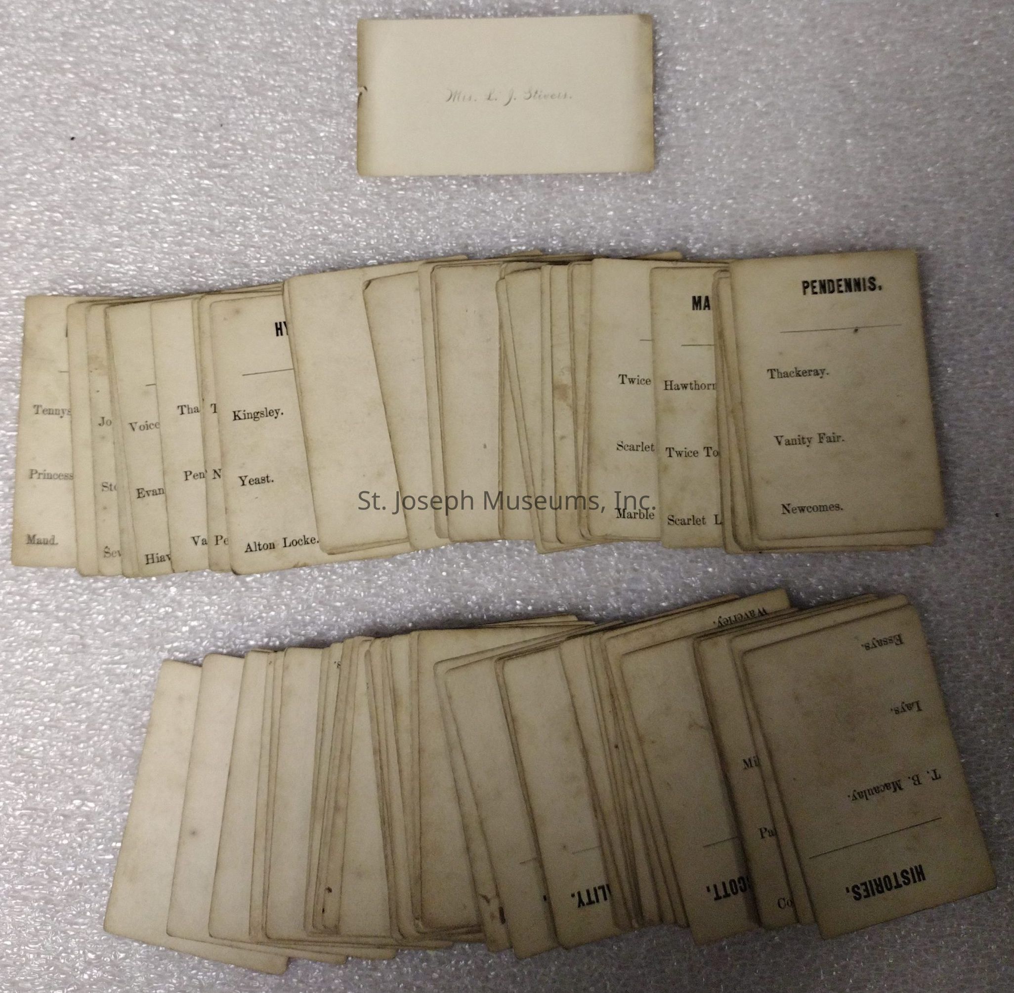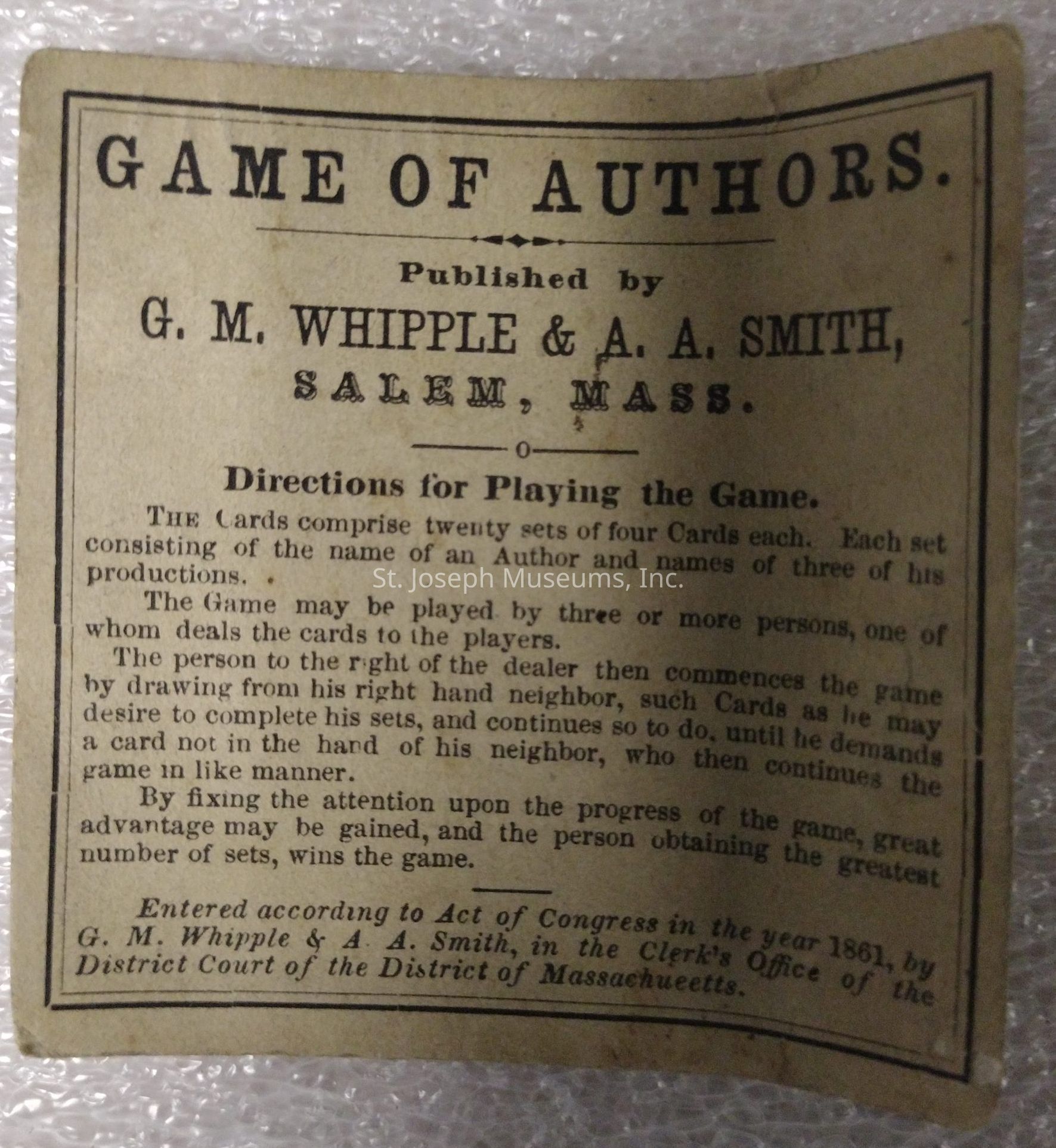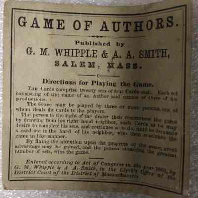 "GAME OF AUTHORS"/COPYRIGHT1861 BY"G. M. WHIPPLE & A. A. SMITH"/CARD INCLUDED SAYS MRS L. J. STIVERS