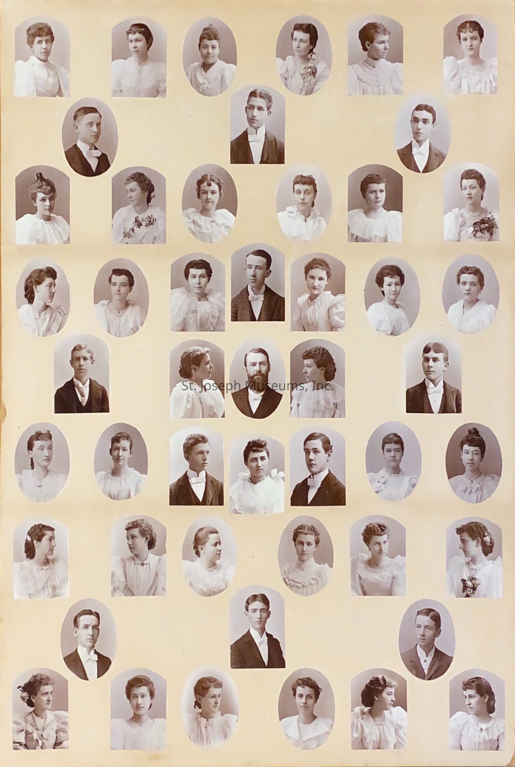 Graduation Photos, Unidentified, Found at Brown Transfer Co., c. 1900. Large piece cardboard - Individual photos of 37 girls, 11 boys, 1 man - All in formal dress - Possibly graduation photo - Found at Brown Transfer.Lexicon