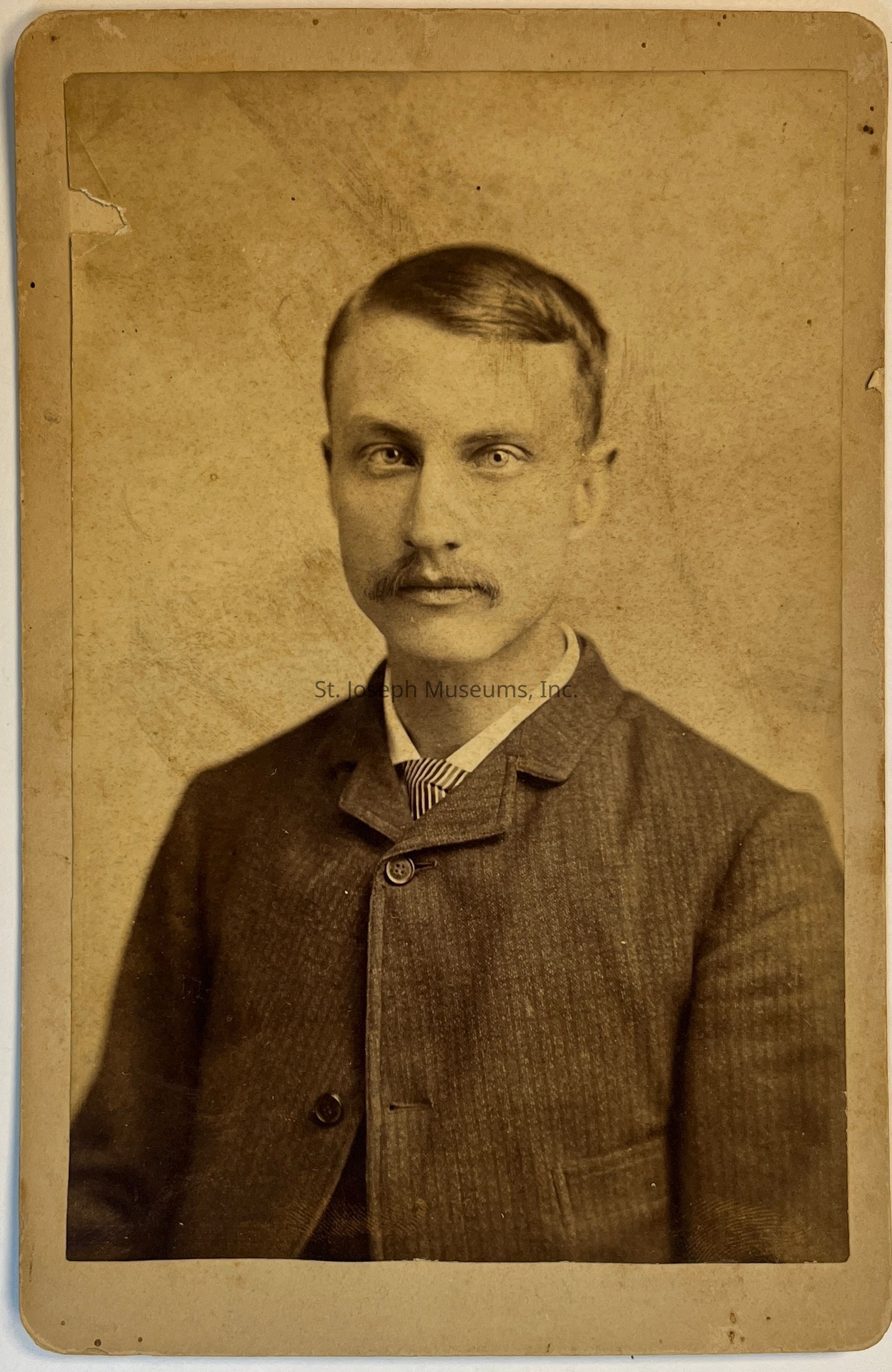 Graham Artistic Photographer Photo of Man, c. 1900. Studio portrait, bust view, of young man, 20-30 age range. He is wearing a check patterned suit jacked buttoned at top button, striped tie, collar turned down. He has medium color hair and mustache. He has piercing eyes. Unidentified. Sepia, 4¼" x 6½" on cardboard backing.