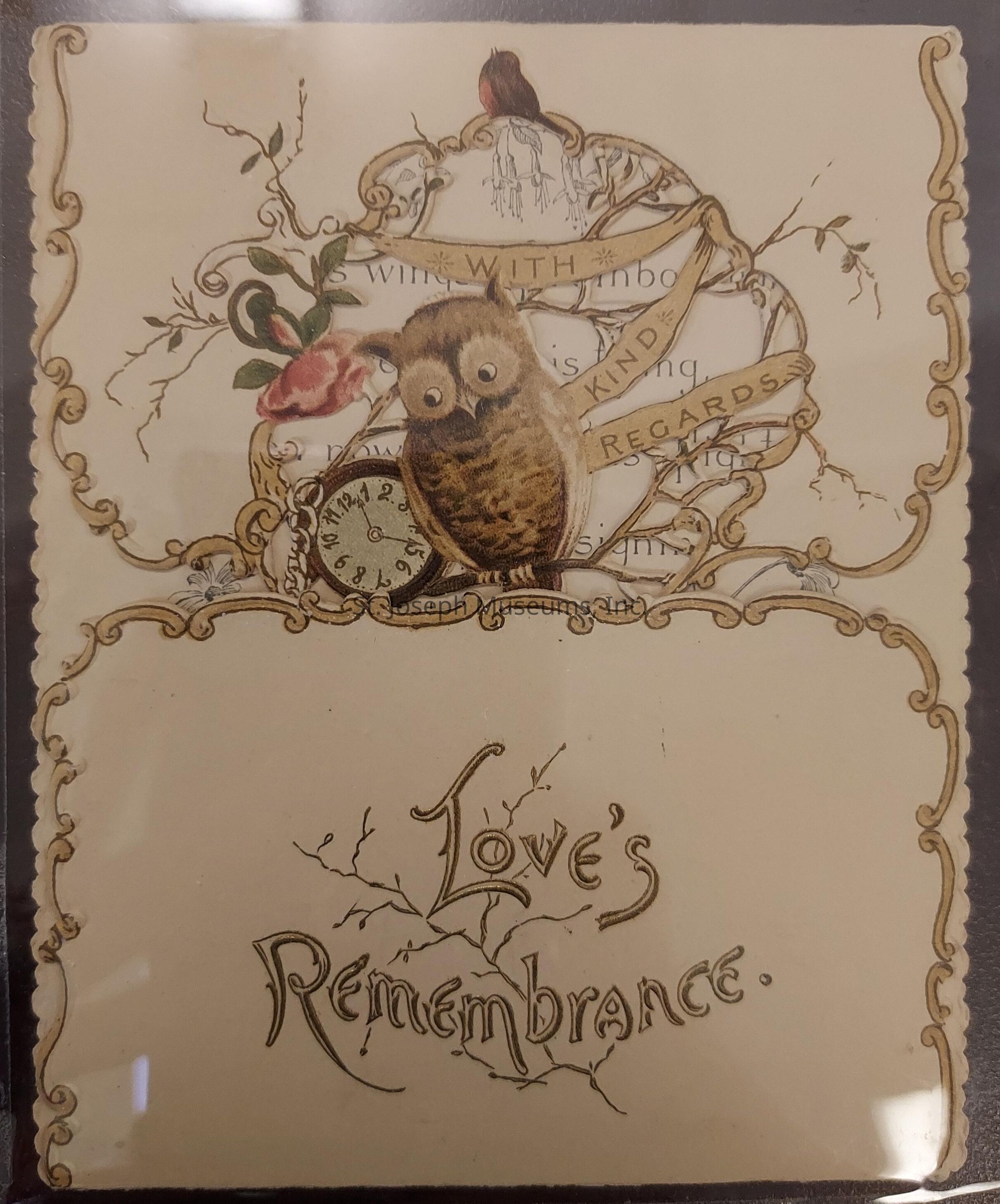 Greeting Card, Love's Remembrance on front with kind regards. the picture is an owl and clock. There is a verse inside. Dated c. 1900.