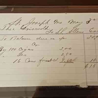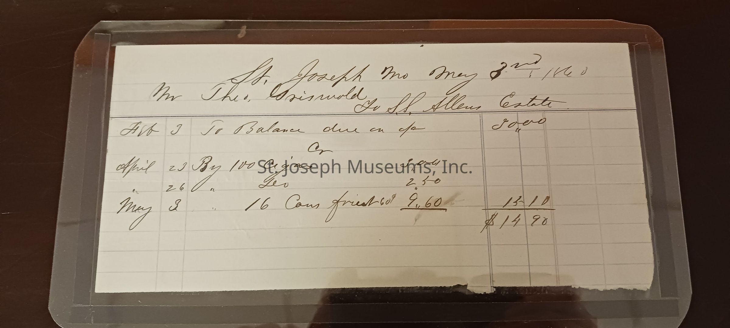 Griswold, Theo Bill To S. S. Allen Estate, 1860. The total of the bill was $14.90 for goods from February 3, to May 3, 1860. Dated May 3, 1860.Lexicon