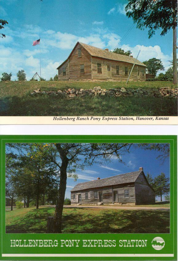 Hollenberg Ranch Pony Express Station Color Postcard, c. 1990. Color photo postcard showing the Hollenberg (Cottonwood) Station as it appeared c. 1990, as restored. Log structure sitting on slight rise, stone wall in front, U.S. Flag flying from pole.Made/Created