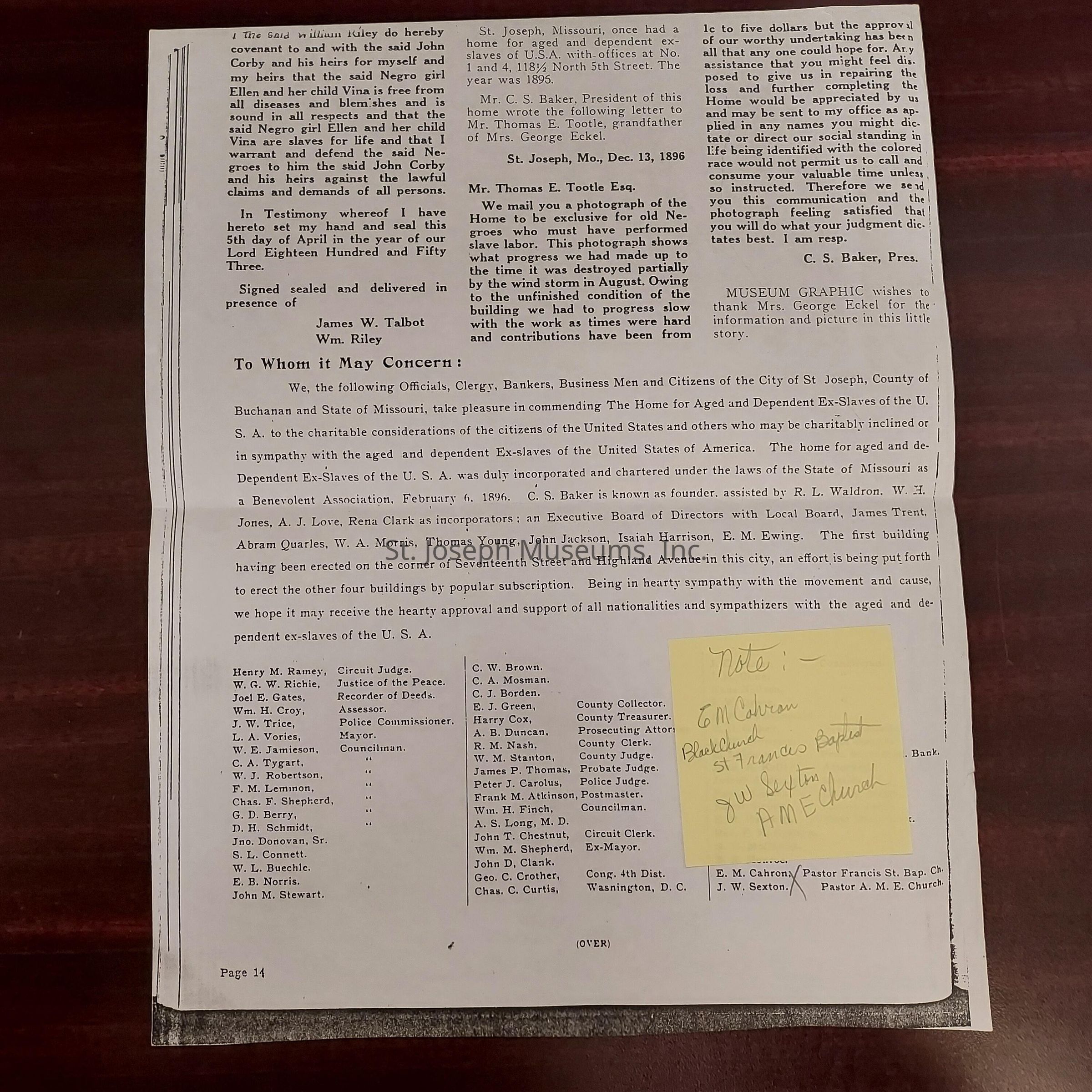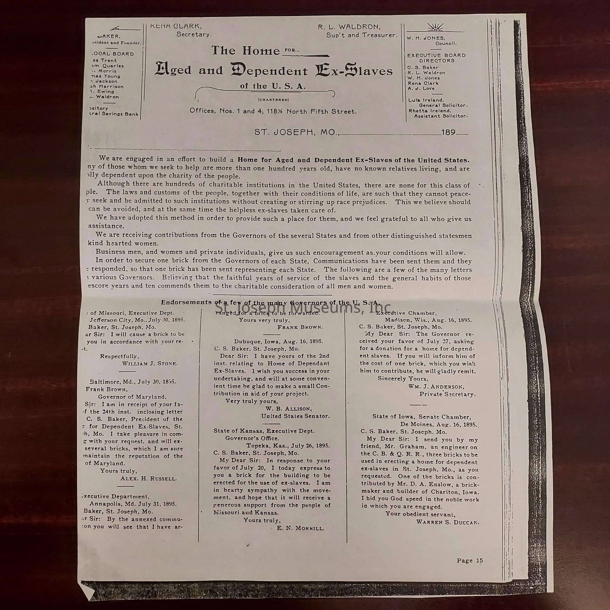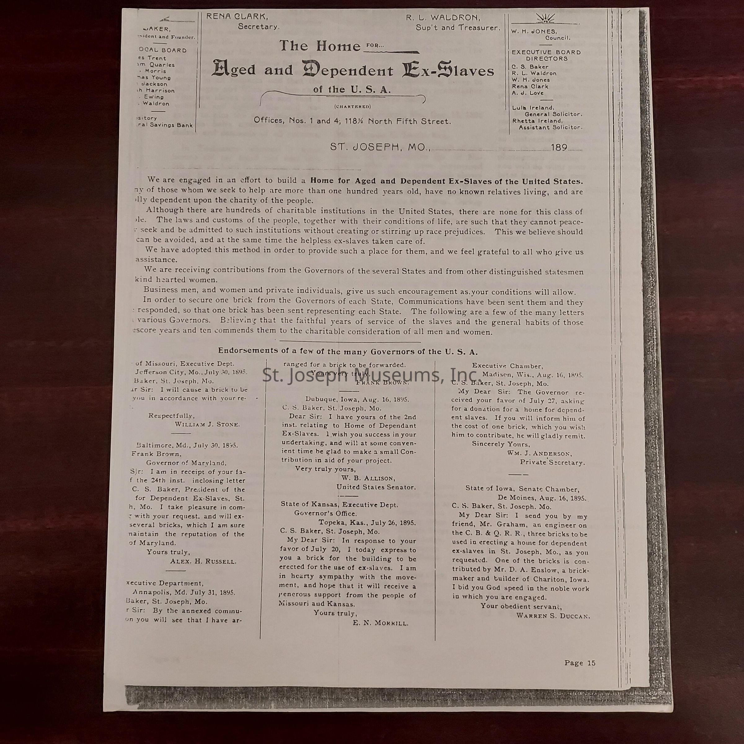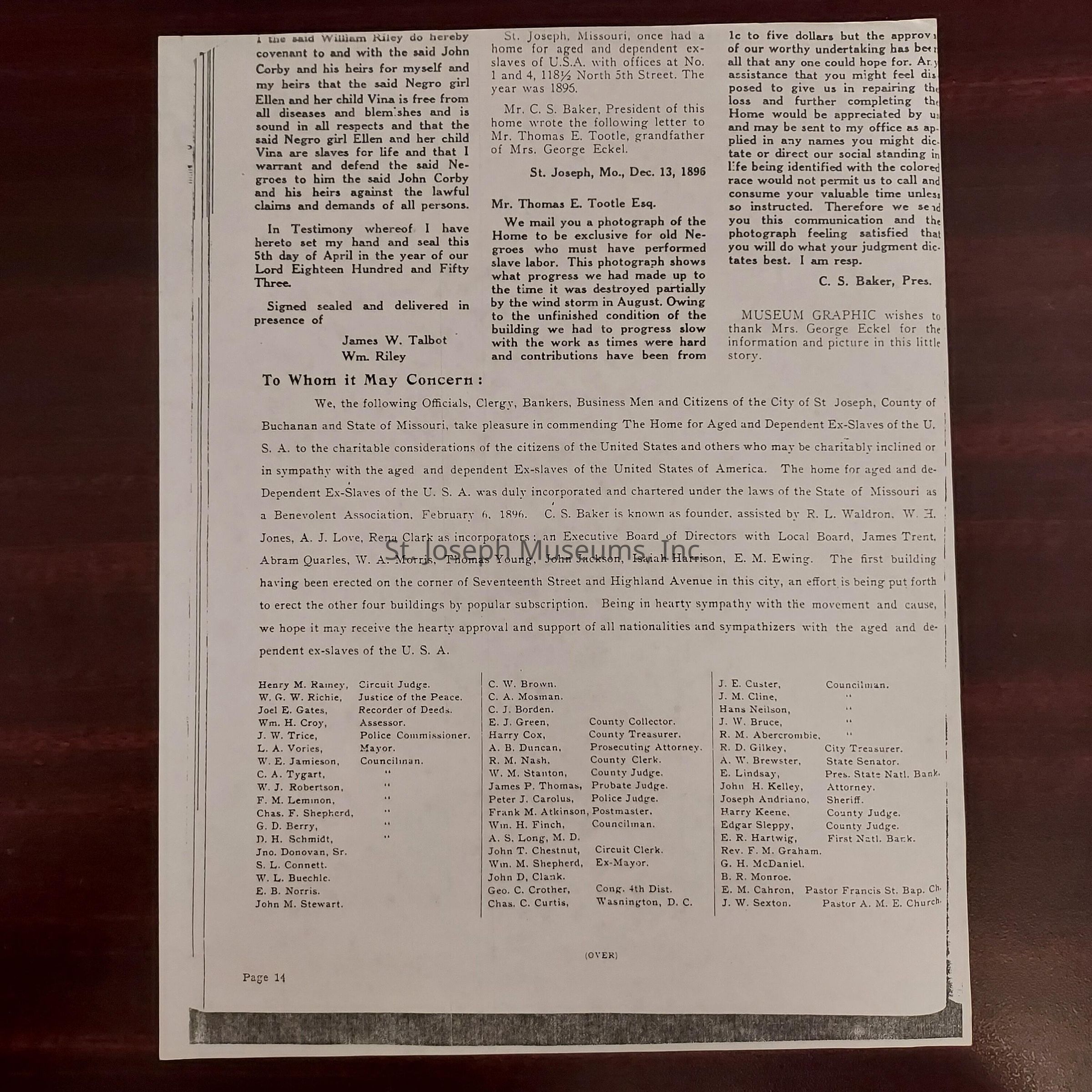 St. Joseph once had a home for aged and dependent ex-slaves of U.S.A. with offices at No. 1 and 4, 118 1/2 North 5th Street, in 1895. Mr. C. S. Baker, President of this home wrote the following letter to Mr. Thomas E. Tootle, grandfather of Mrs. George Eckel.