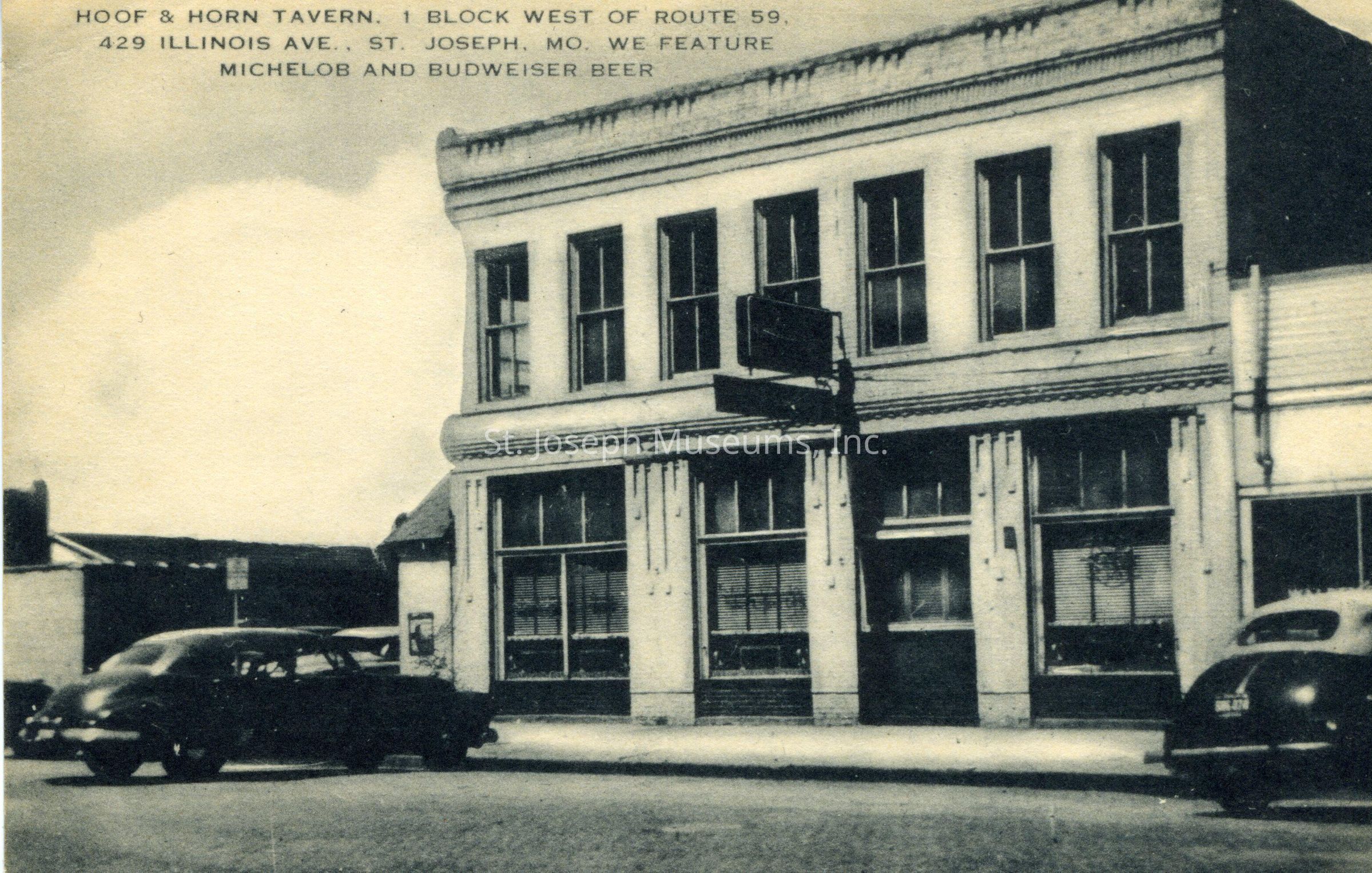 Hoof & Horn Tavern, 429 Illinois, Photo Postcard, c, 1930. "Hoof & Horn Tavern, 1 Block West of Route 59, 429 Illinois Ave., St. Joseph, MO. We Feature Michelob and Budweiser Beer." b/w Photo of front of building with 1930-style autos parked in front.Lexicon