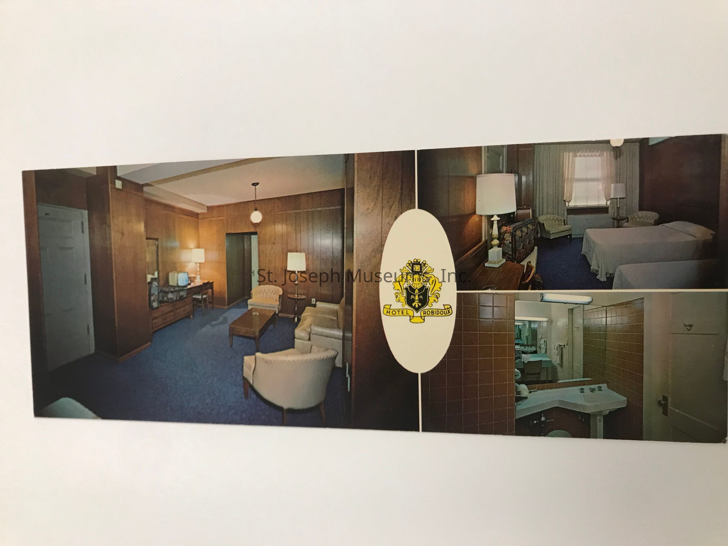 Color Postcard of the interior of a guest room at the Hotel Robidoux in St. Joseph, Missouri, c. 1950. Card includes photos of sitting area, bedroom, and bathroom. It includes the Robidoux logo on the postcard.Lexicon