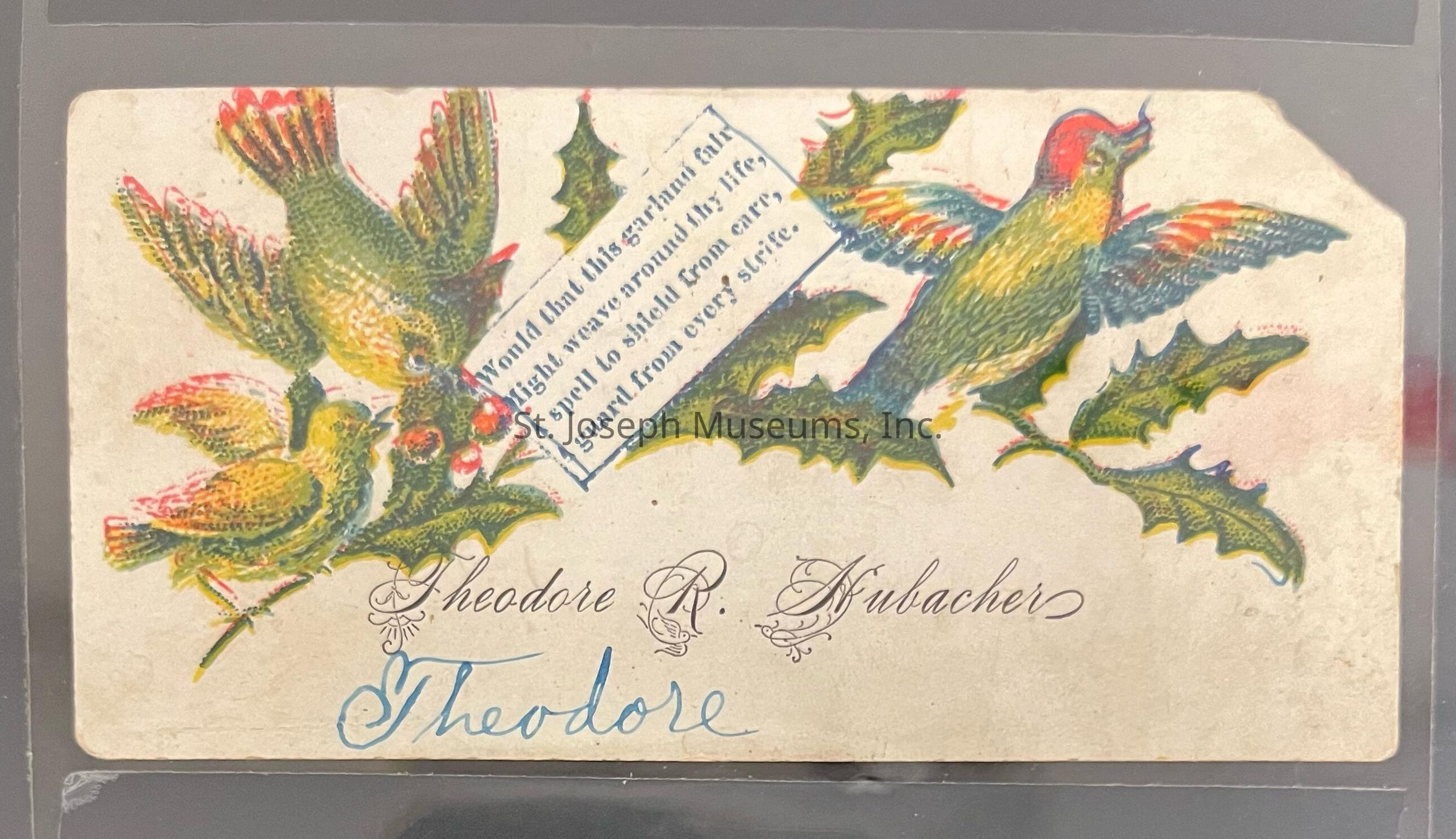 Theodore R. Hubacher calling card has his name printed on card and also handwritten. The card has birds on it. Date unknown.
