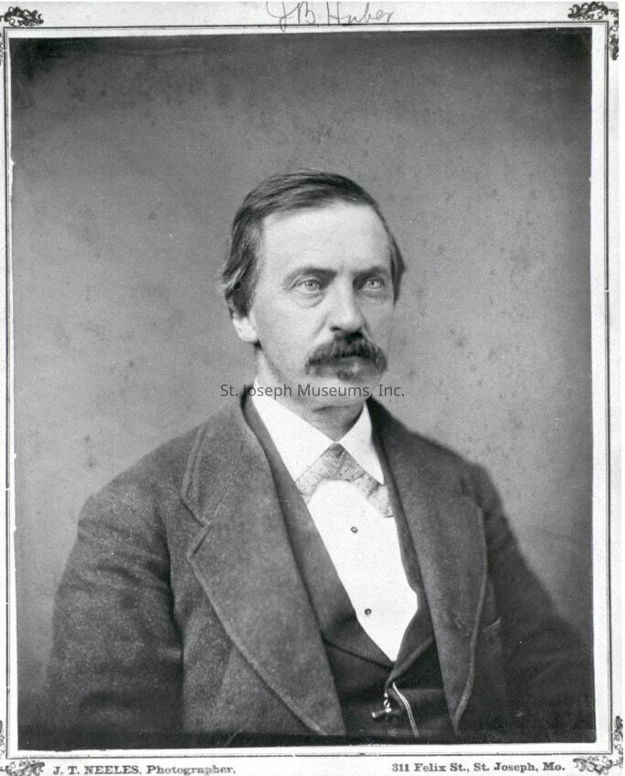 Huber, born in Germany, came to St. Joseph in 1851 with John Albrecht and opened a watch & jewelry store in the City Hotel, NE corner of Main & Jules Streets. The next year they moved to the Edgar House and added guns, knives to the line to sell to the emigrants crossing the plains. John married the daughter of Joseph Kuechle, who had settled in St. Joseph after coming here first to join a wagon train, but cholera broke out and they did not go along. That wagon train was attacked by Indians and no one survived. Mary's brother Edward was part of the Eugene Field wedding party.