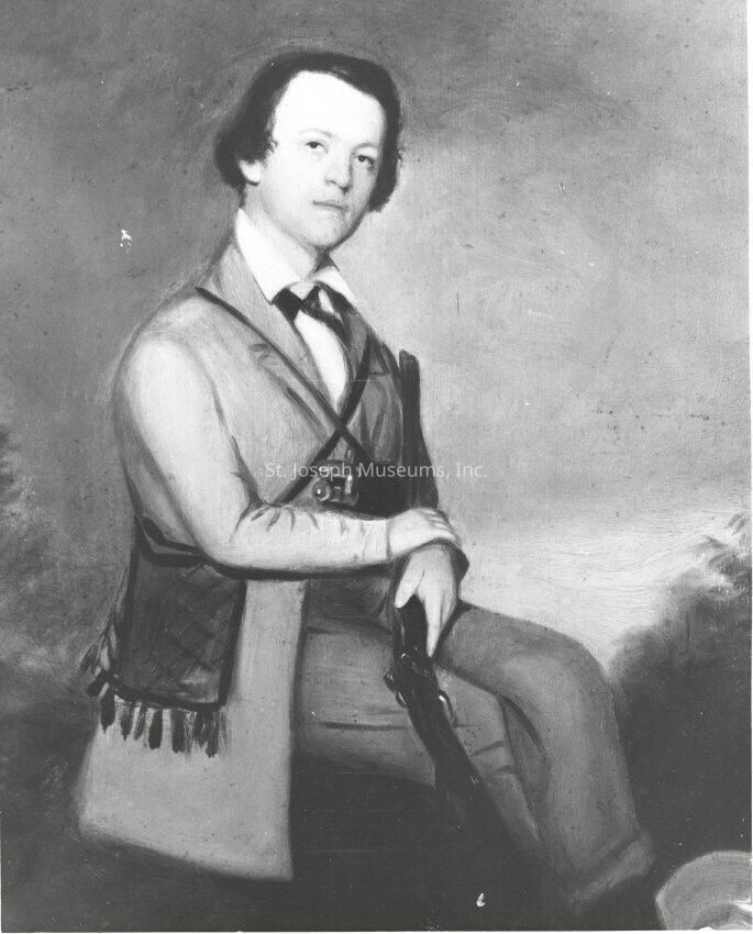 92.1H.41 = Hughes as young man, from painting by Nichols in the R.W. Stanley Collection. Shows Hughes seated, in hunting attire, seated with hunting bag draped over shoulder, holding rifle in front of him. He has dark hair and is clean shaven. c. 1840
