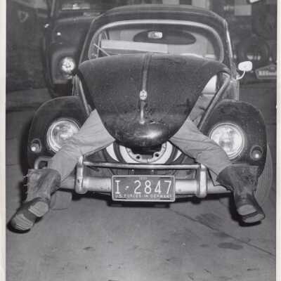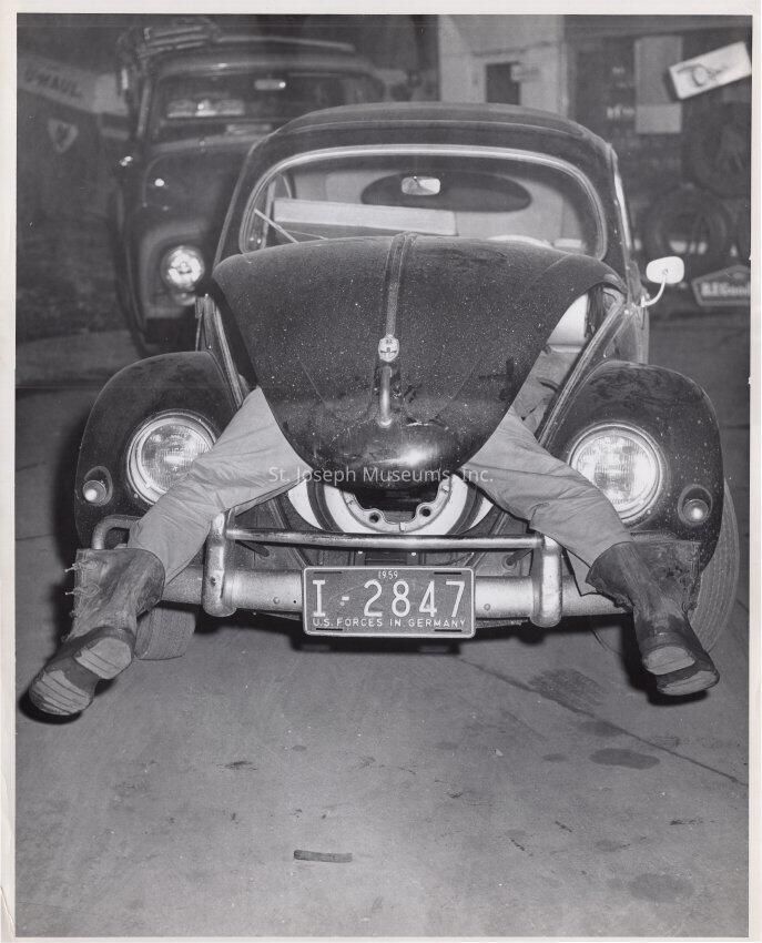 L = Man in front trunk of a Volkswagon Bug with only his splayed legs showing. License plate "U.S. Forces in Germany, 1959