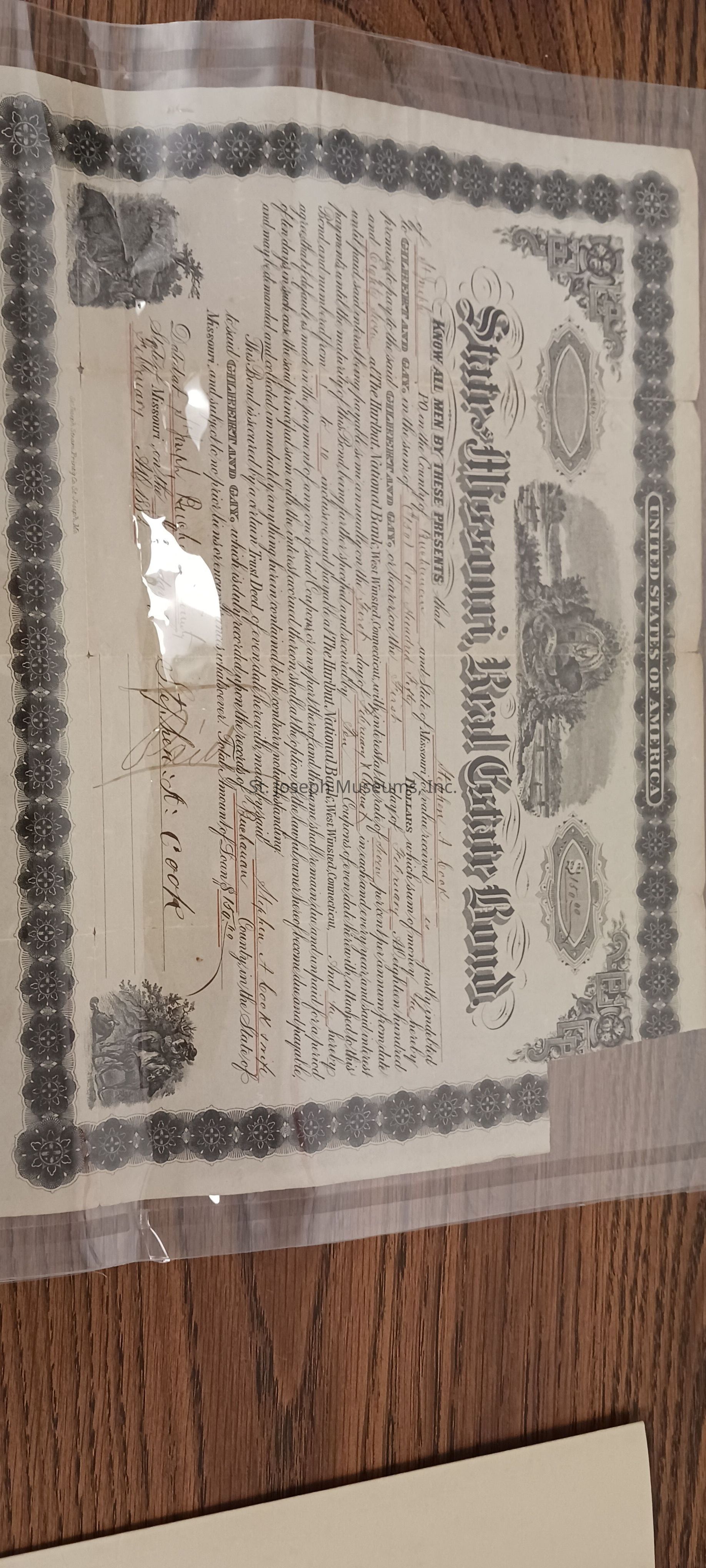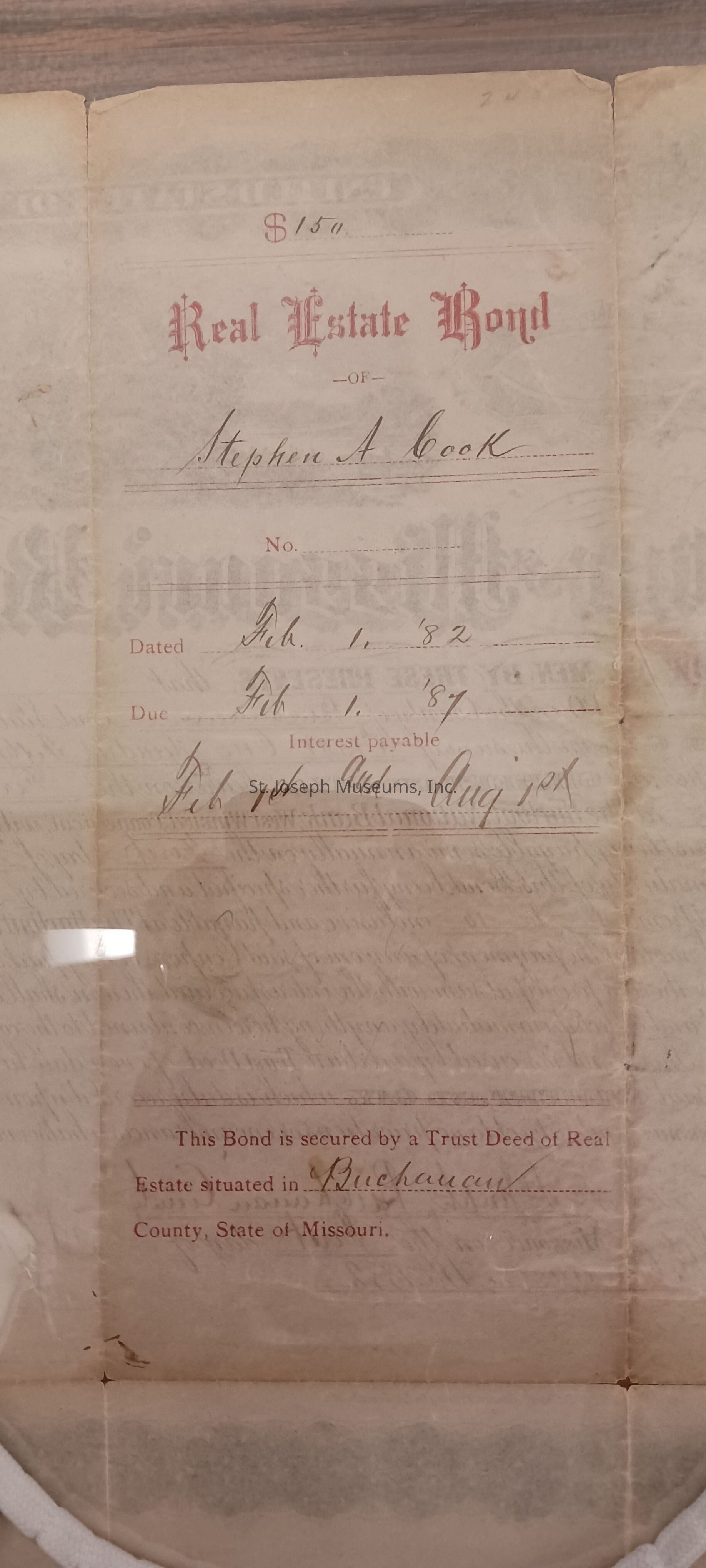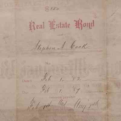 Real Estate Bond in amount of $150 from Hulbert National Bank to Stephen A. Cook, dated February 1, 1882.Lexicon