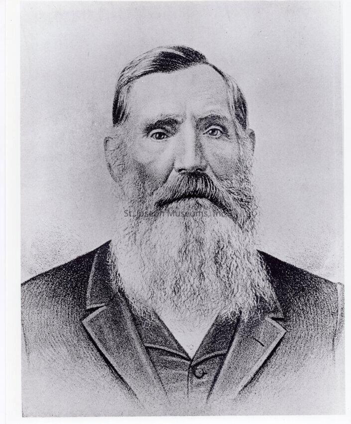 Hyde, Anliff, Hyde Forge, Drawing, Photo, c. 1819. b/w. Photo of a drawing of Anliff Hyde, owner of Hyde Forge, in south St. Joseph, east of Hyde Park. Items from his forge were part of the Blacksmith Shop at the Pony Express Museum in the 1960s.Made/Created