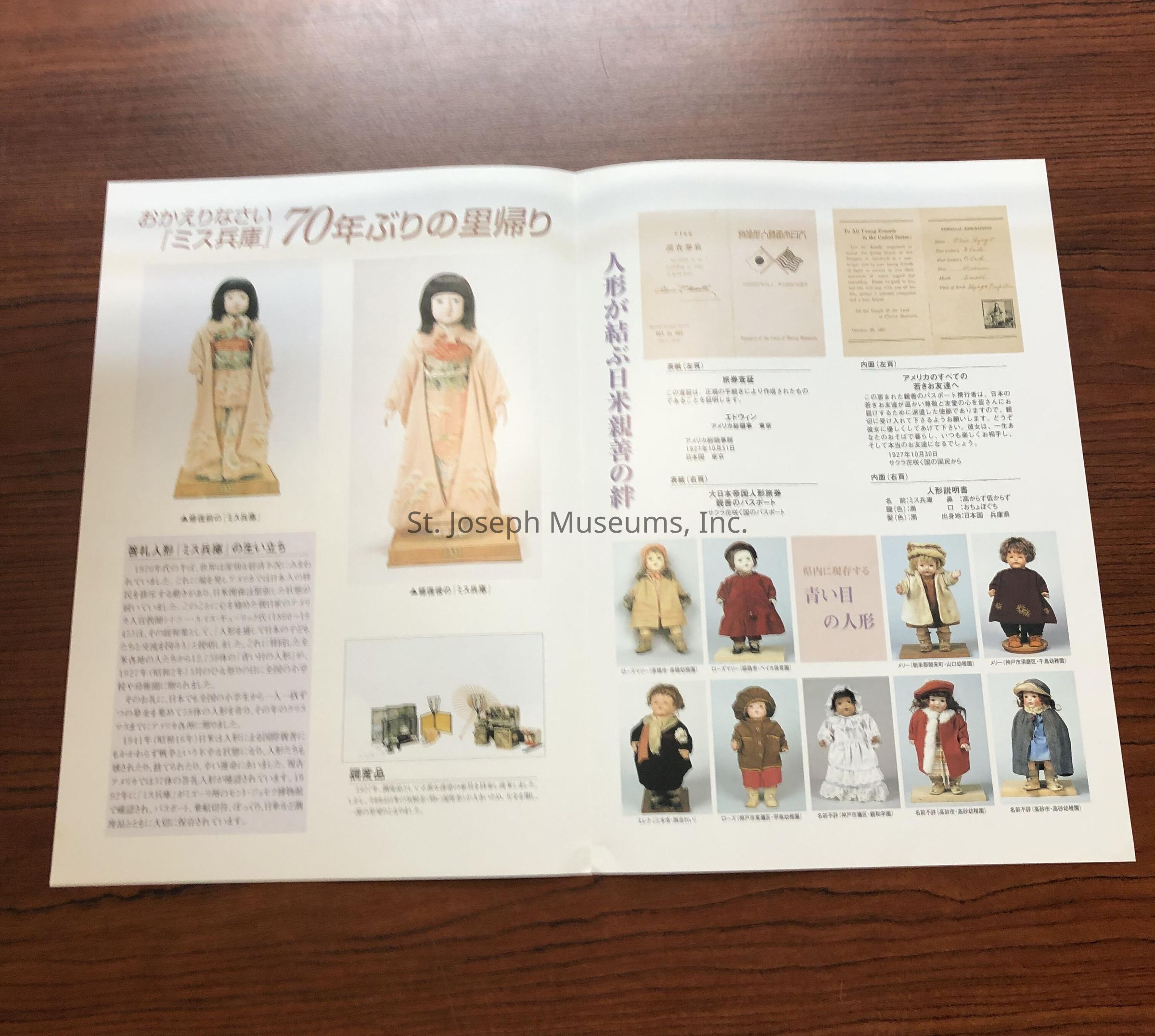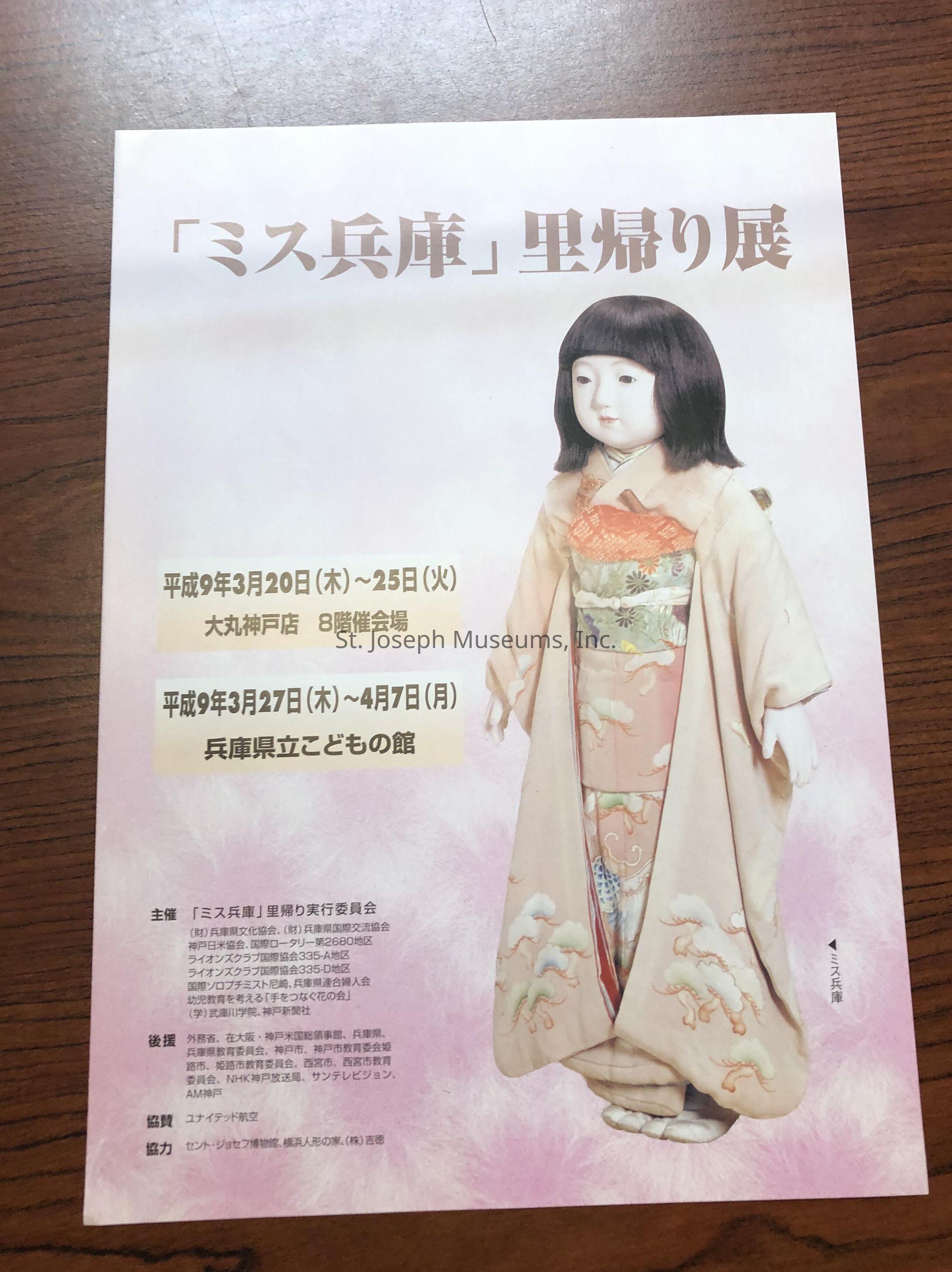 Hyogo, Miss - A Journey of Friendship is a program written primarily in Japanese. The program includes pictures of Miss Hyogo and it is assumed the others dolls pictured are the friendship dolls sent to Japan in 1927 by Dr. Sidney L. Gulick. In response to Dr. Gulick's dolls, the Japanese started a similar program. Their "Dolls of Gratitude" were sent to the United States. The dolls were given permanent homes throughout the United States. Miss Hyogo came to the Children's Museum of St. Joseph (in 1939 the name was changed to St. Joseph Museum. The friendship doll exchange was rekindled with the visit of Miss Hyogo to her homeland in March and April 1997. The program includes a letter from the Mayor of St. Joseph, Larry R. Stobbs to Akira Kusaka, Chairperson of the Miss Hyogo Homecoming Committee in Japan.Lexicon