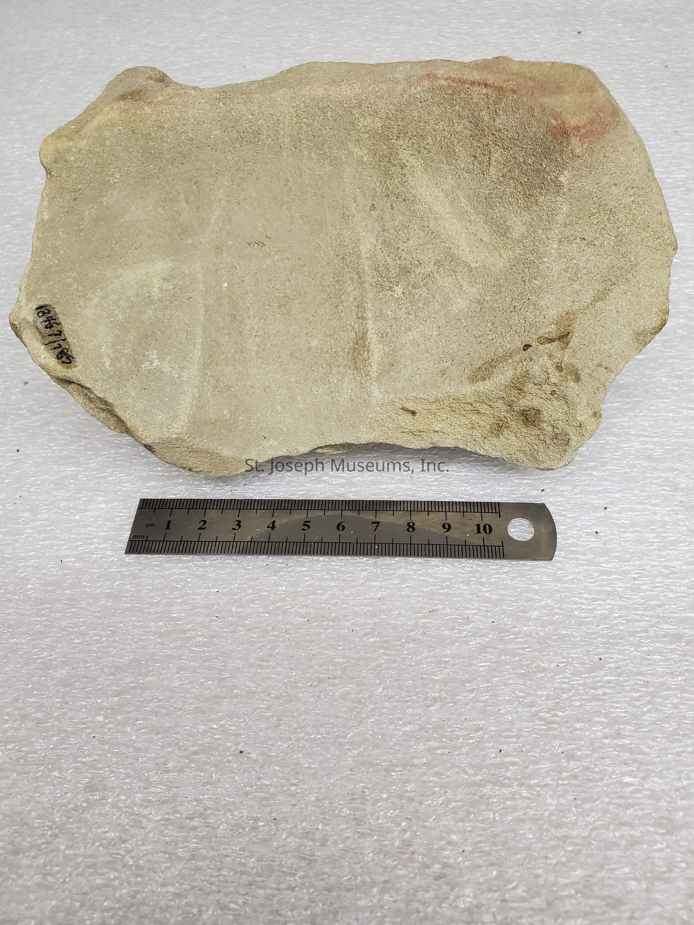 IRREGULAR SHAPED STONE IMPLEMENT / GROOVED ON 4 SIDES / SCOOPED OUT ON ONE SIDE/CAT. SAYS ABRAIDING STONE