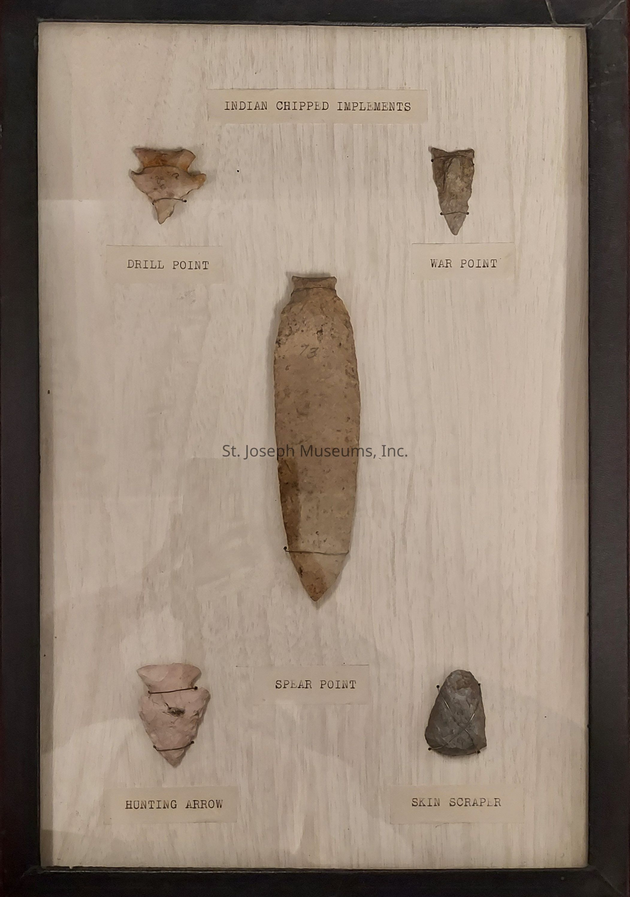 Native American chipped implements encased in a black frame. Drill point, war point, spear point, hunting arrow, and skin scarper.