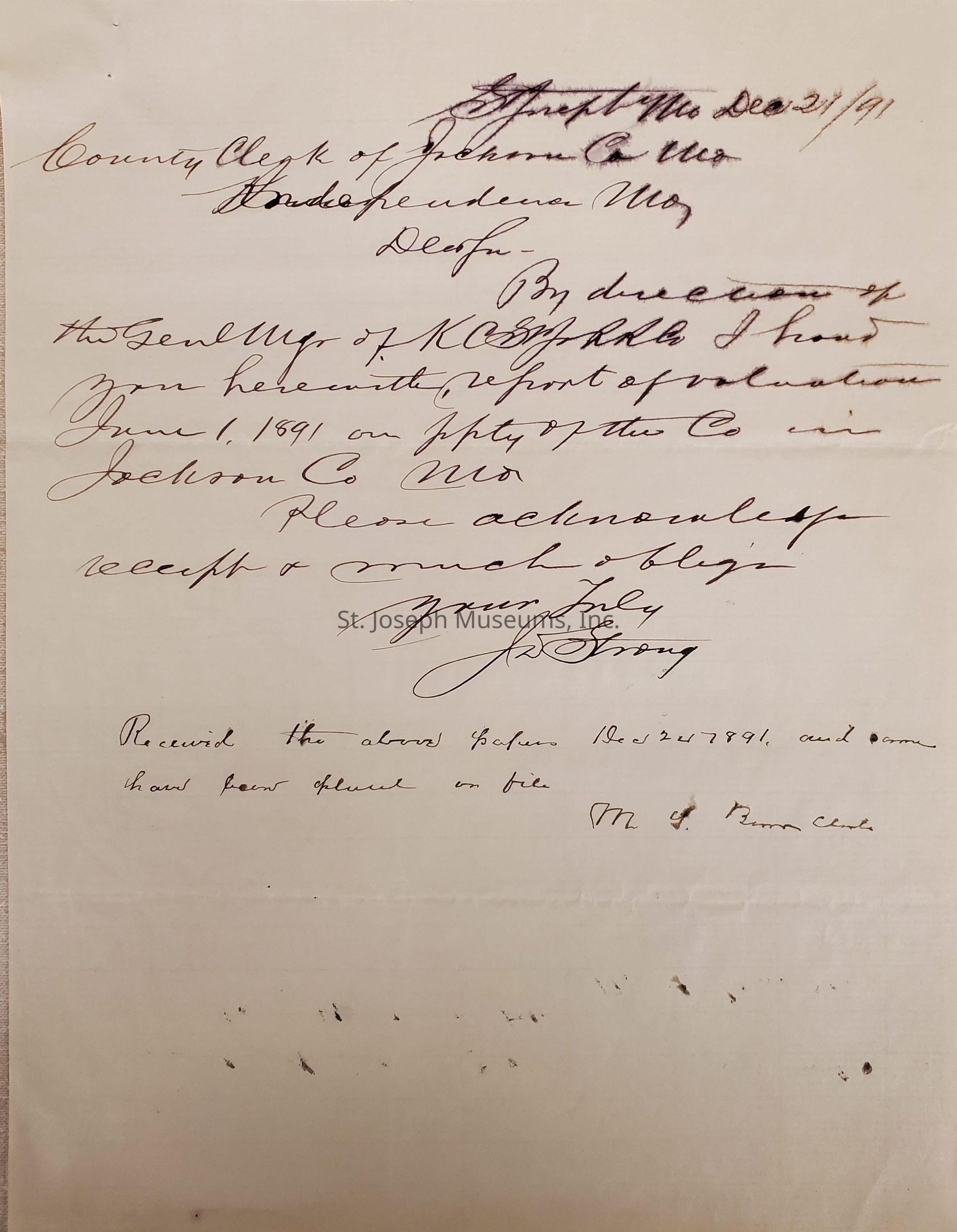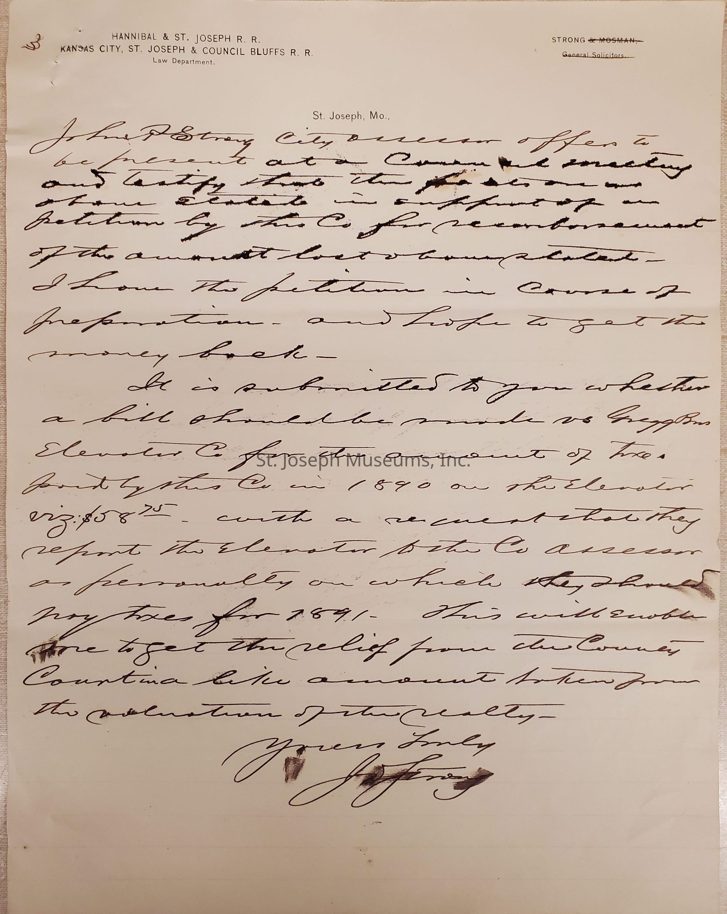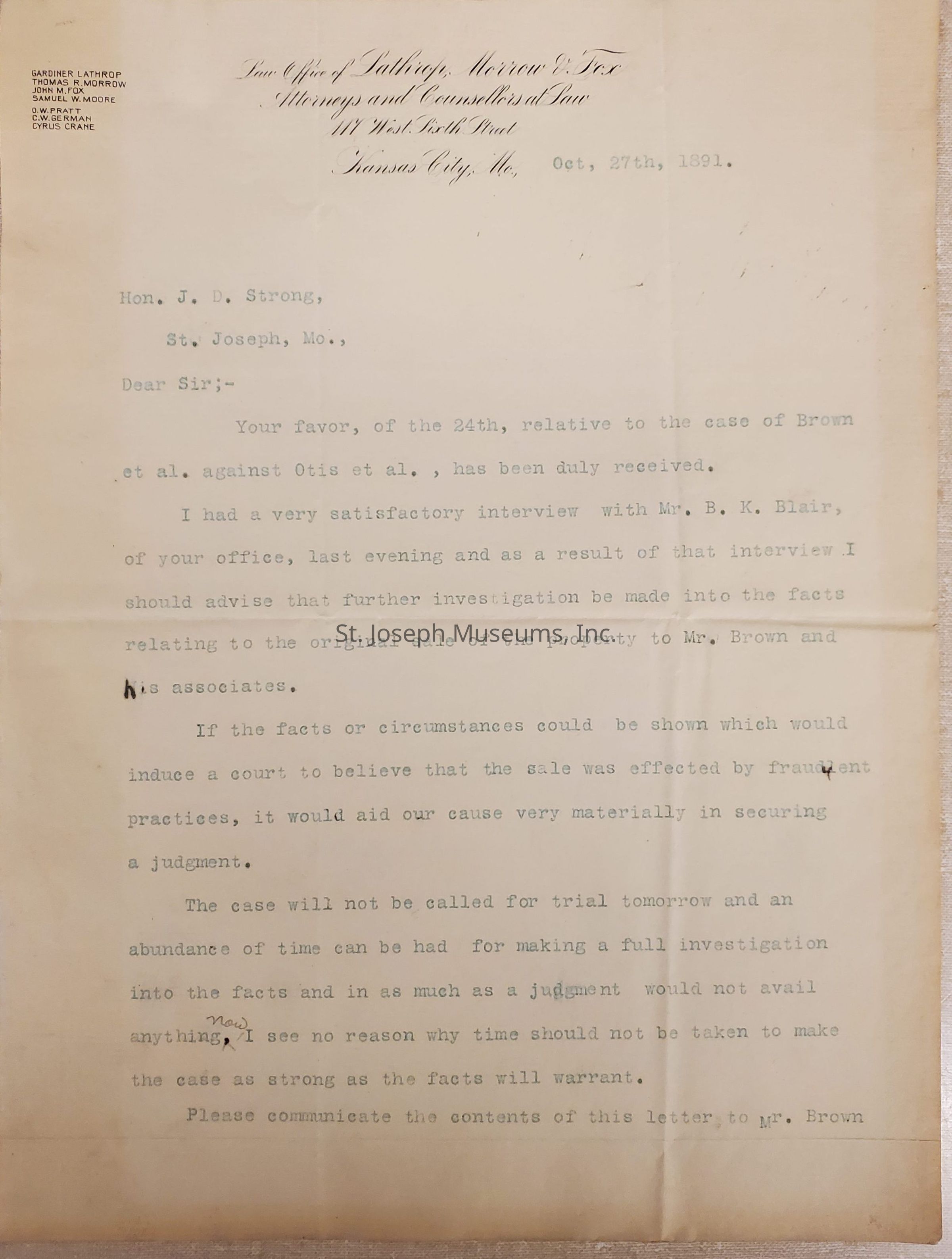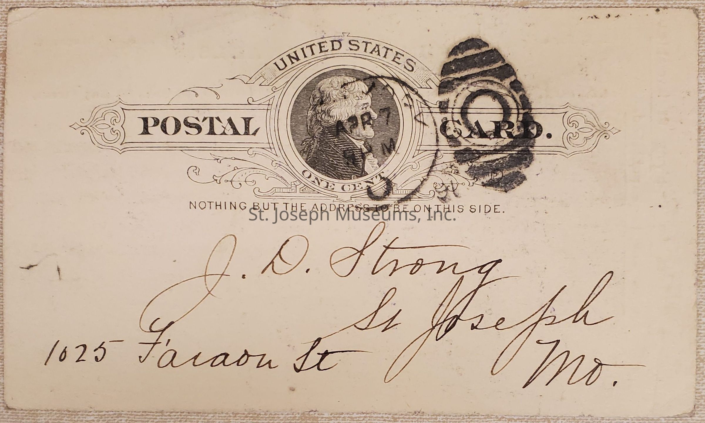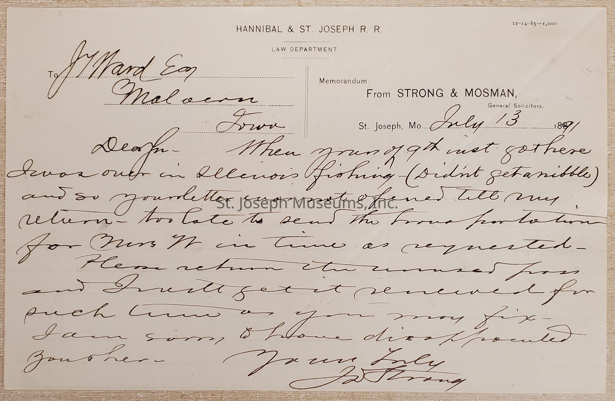 J. D. Strong was an attorney in St. Joseph. He was also a Judge, perhaps a U. S. Judge, as his cases are digested in Central Law Journal, 1880. At one time he was in the law department of the St. Joseph Kansas City and Council Bluff's Railroad. He lived on the south side of Felix Street between 13th and 14th Street. He was married to Mary E. Strong and had two sons, also lawyers, John W. and James W.