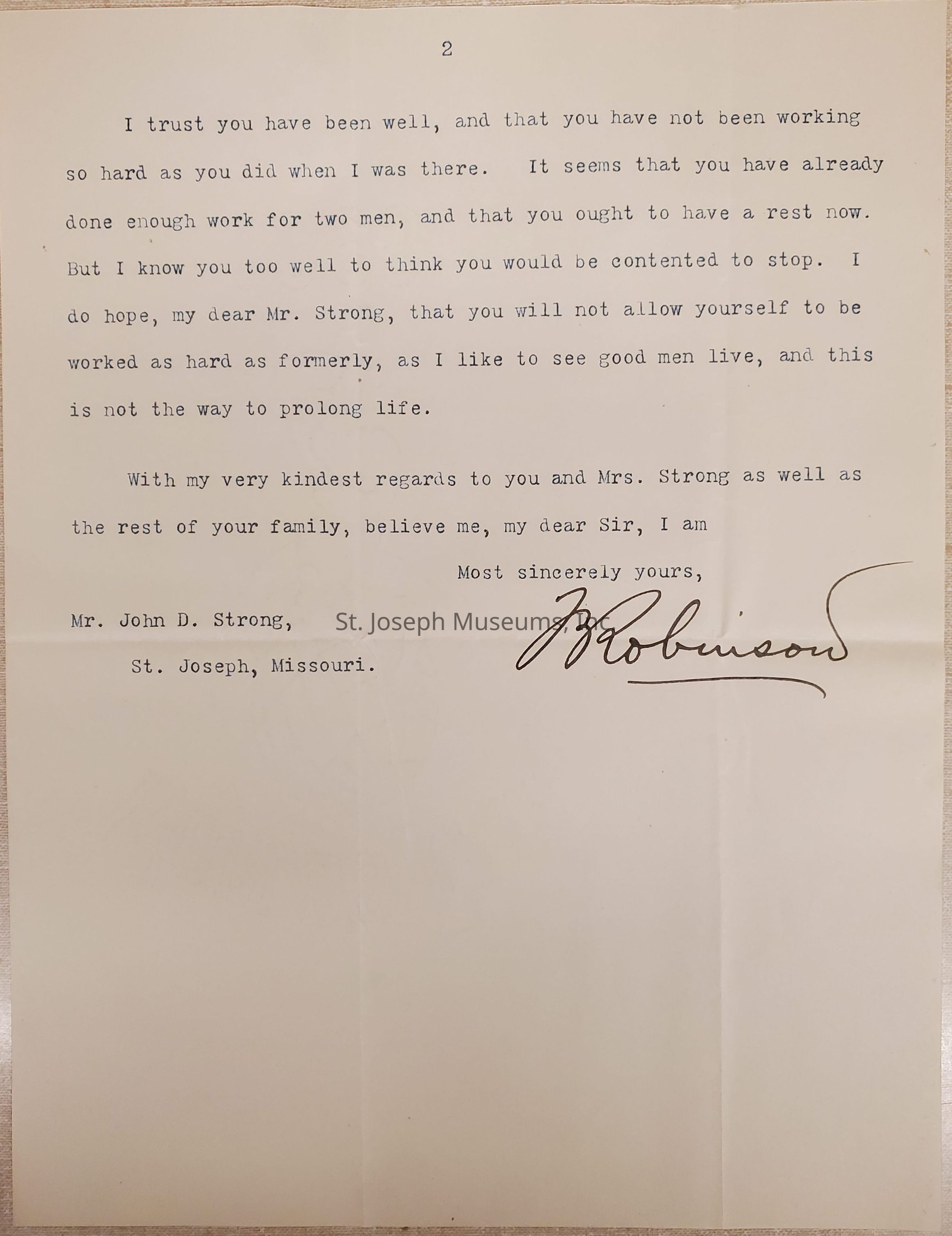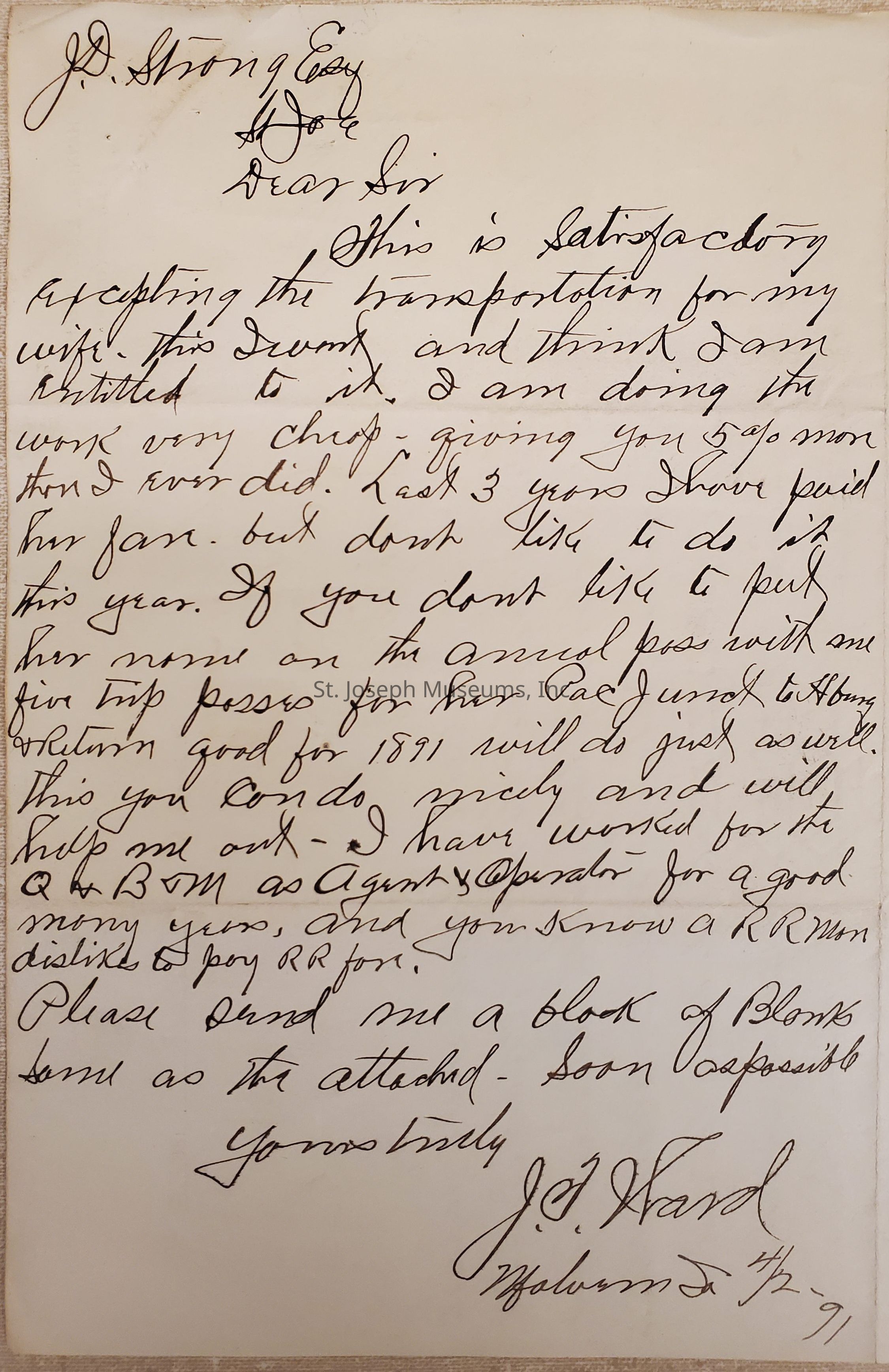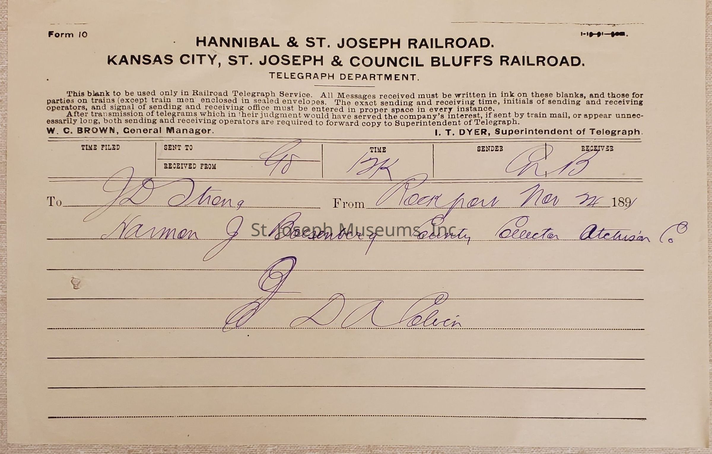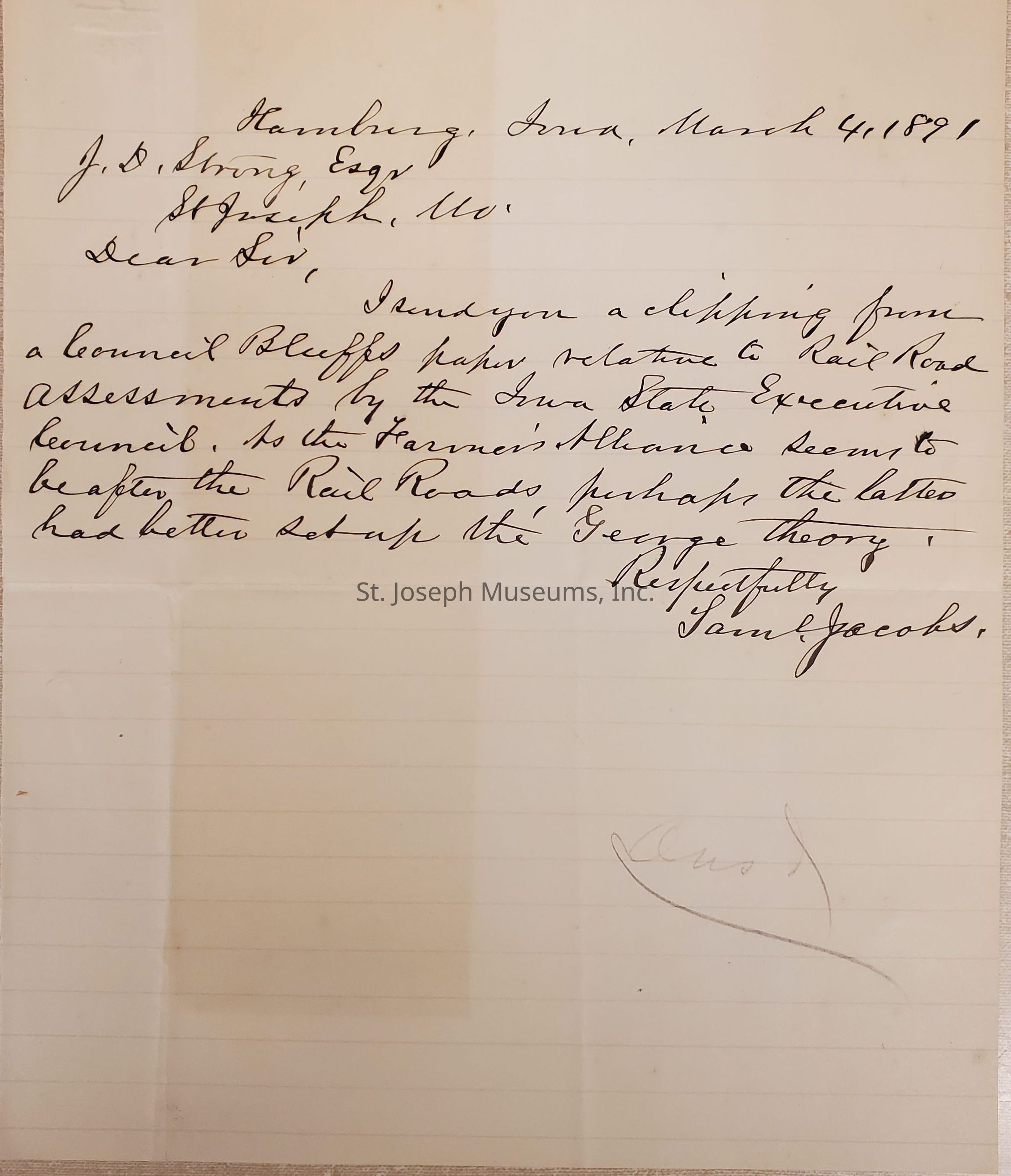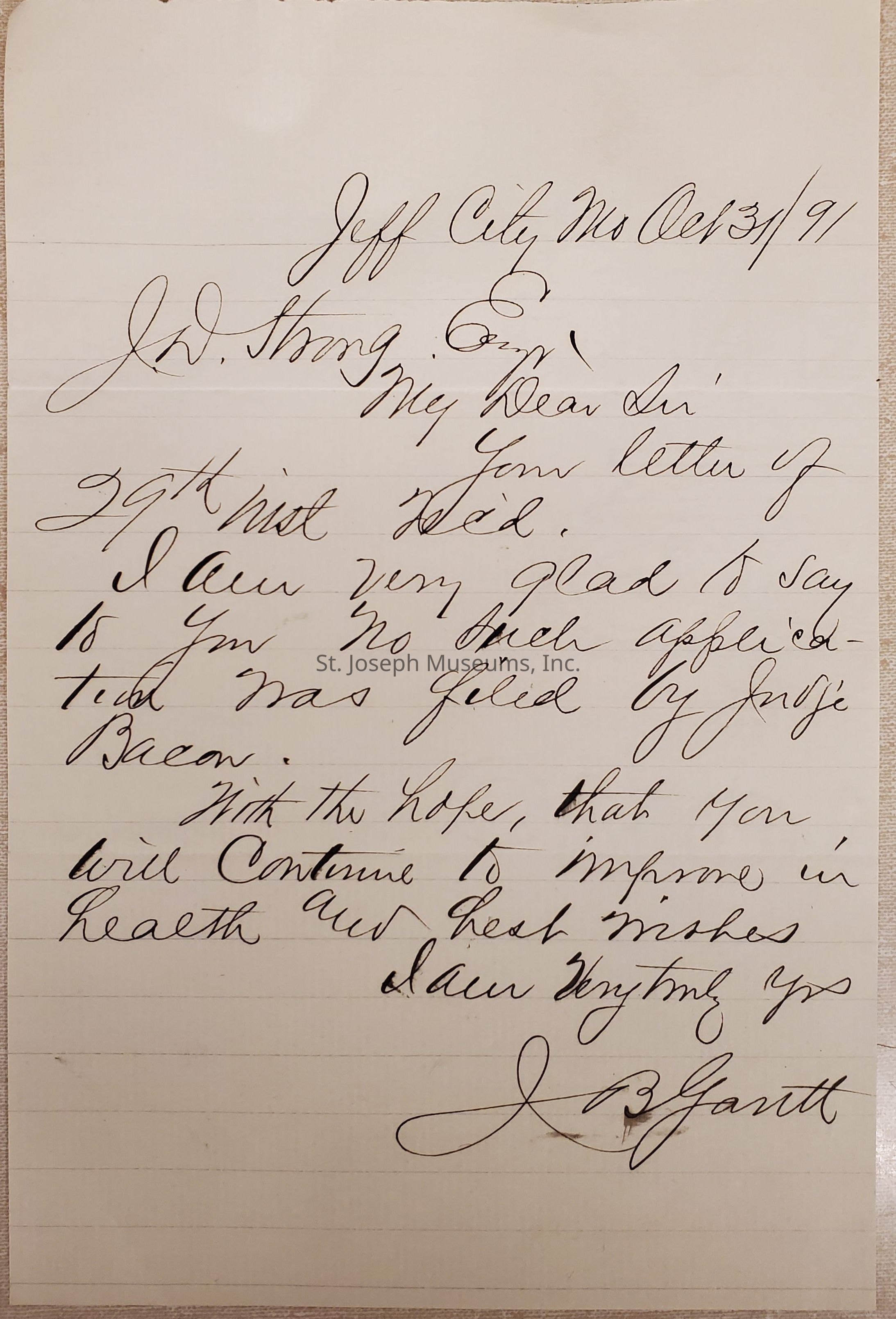 J. D. Strong was an attorney in St. Joseph. He was also a Judge, perhaps a U. S. Judge, as his cases are digested in Central Law Journal, 1880. At one time he was in the law department of the St. Joseph Kansas City and Council Bluff's Railroad. He lived on the south side of Felix Street between 13th and 14th Street. He was married to Mary E. Strong and had two sons, also lawyers, John W. and James W.