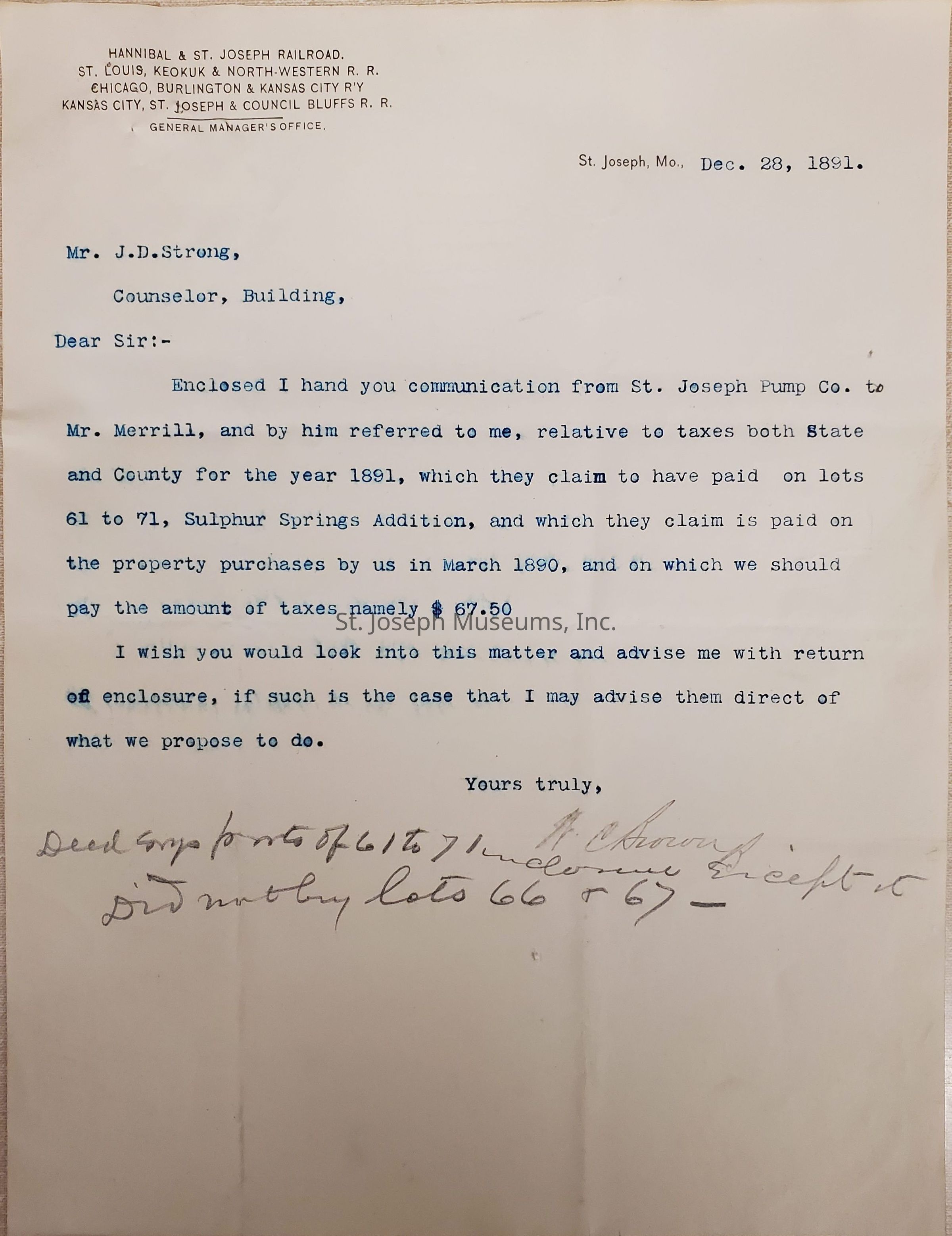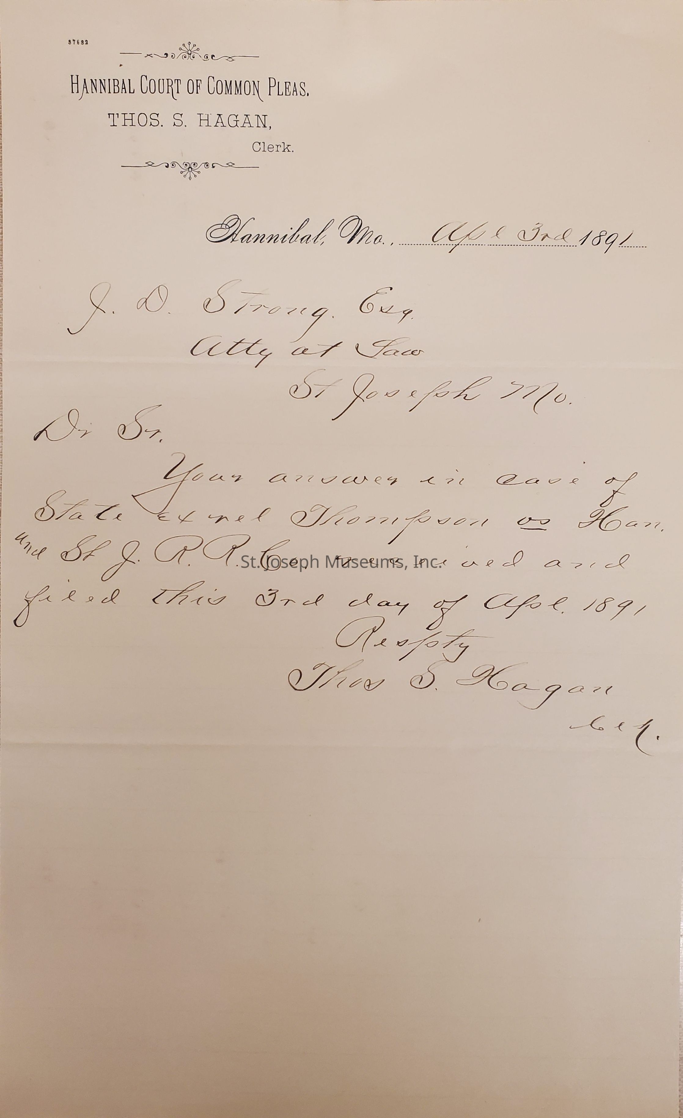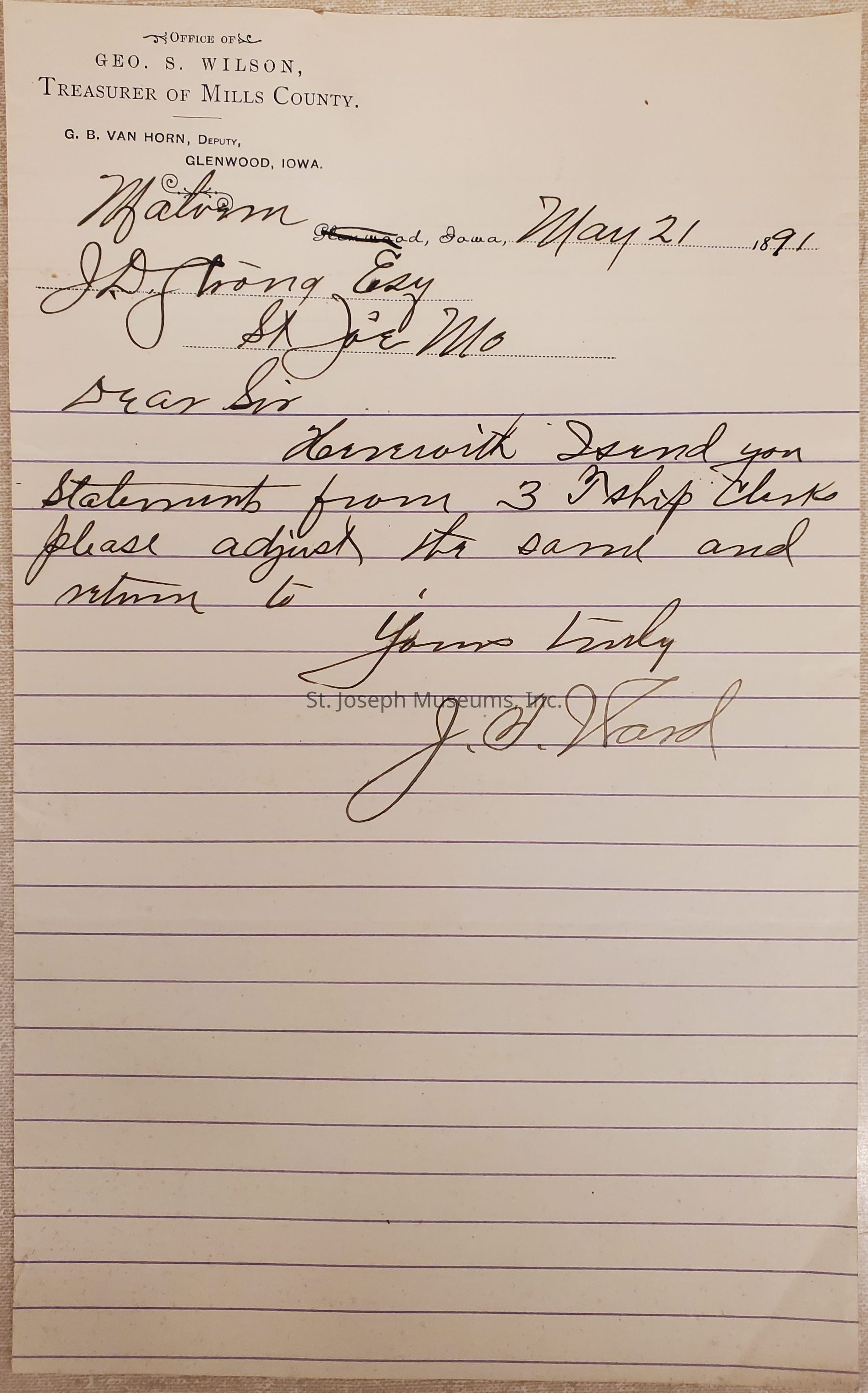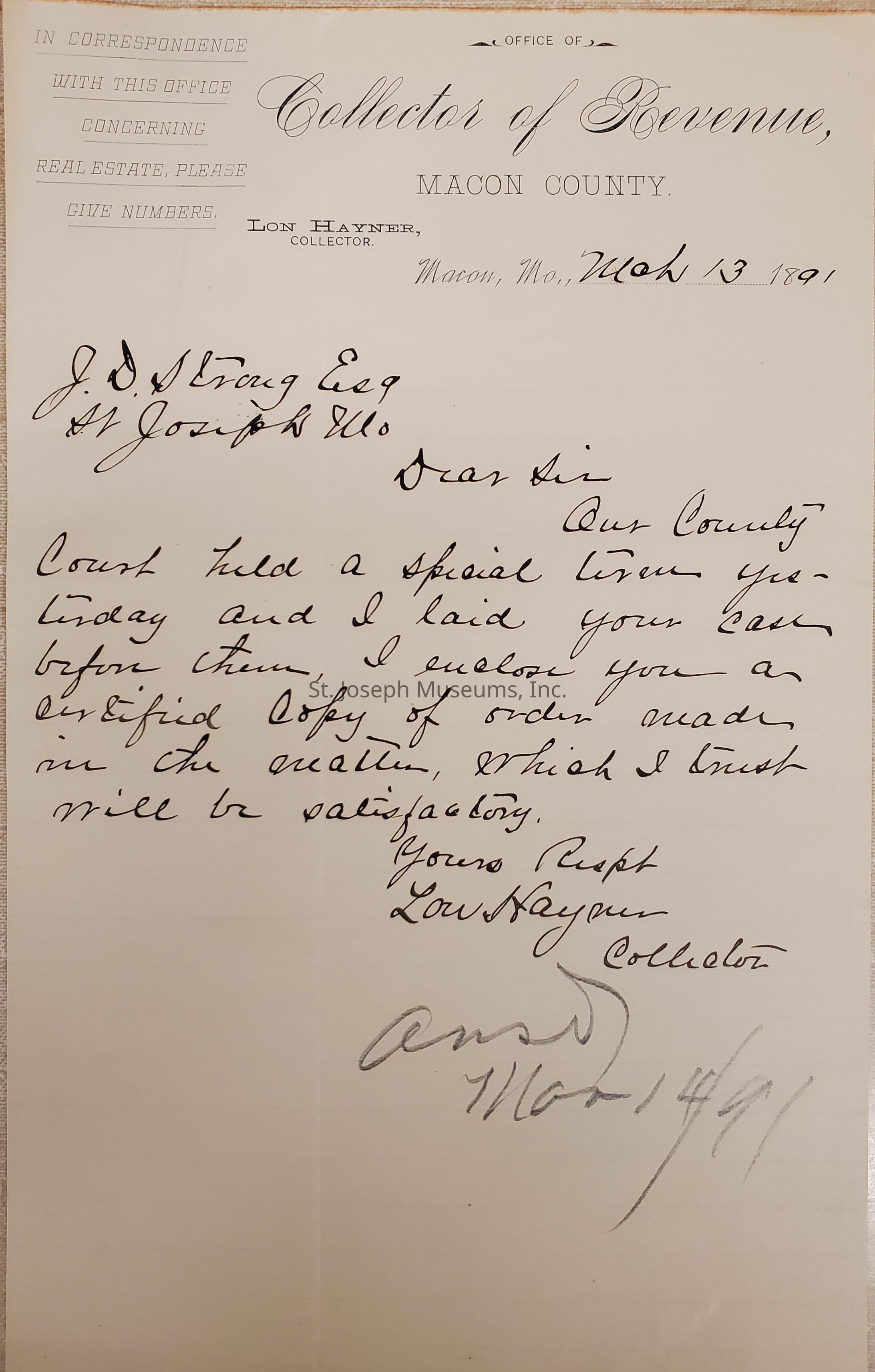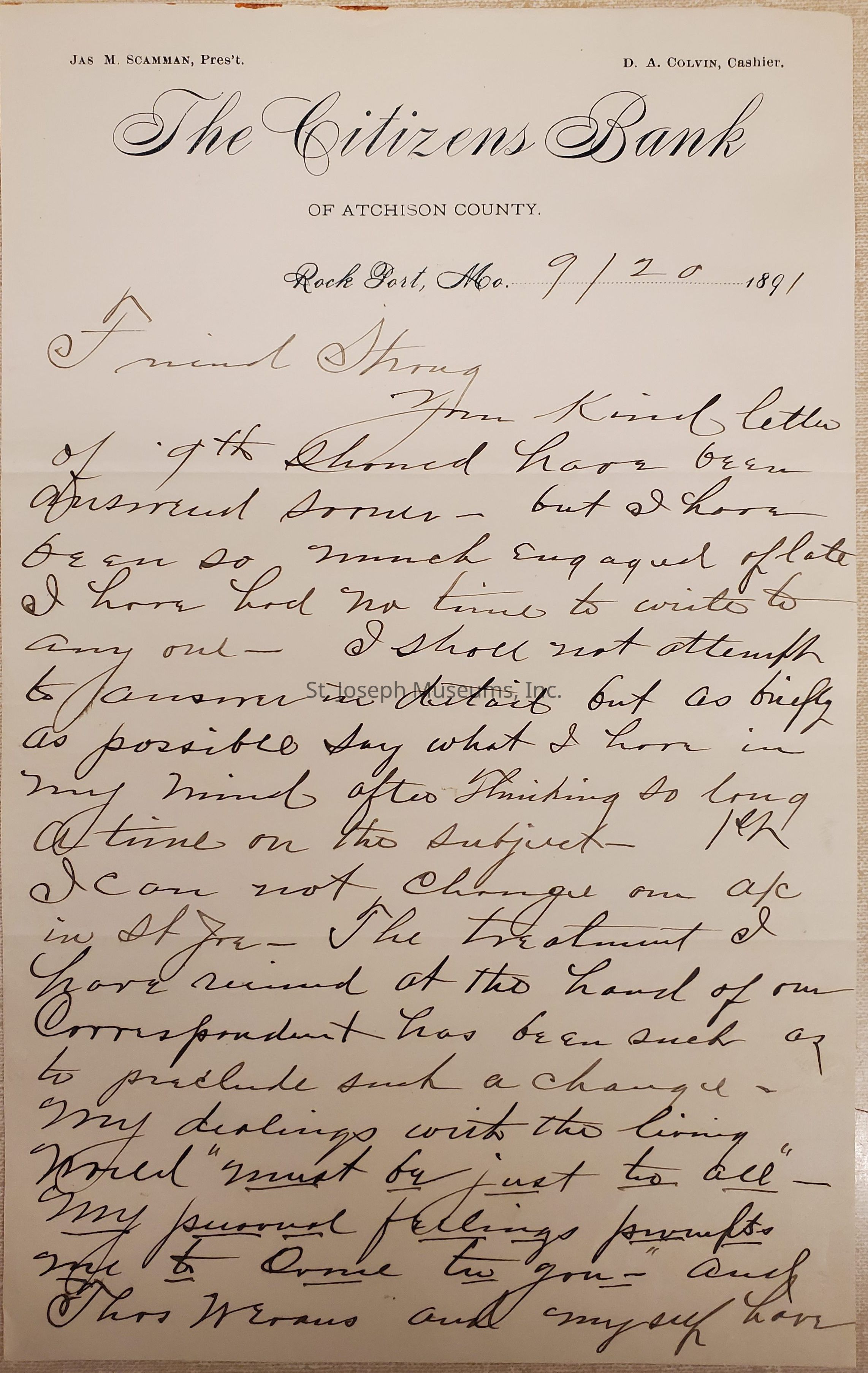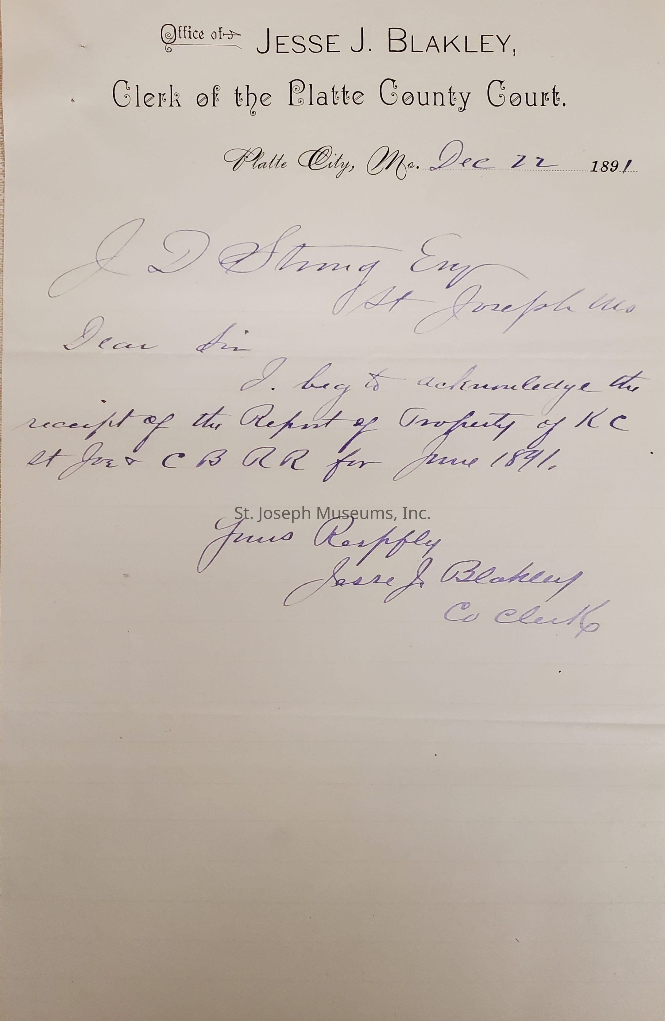 J. D. Strong was an attorney in St. Joseph. He was also a Judge, perhaps a U. S. Judge, as his cases are digested in Central Law Journal, 1880. At one time he was in the law department of the St. Joseph Kansas City and Council Bluff's Railroad. He lived on the south side of Felix Street between 13th and 14th Street. He was married to Mary E. Strong and had two sons, also lawyers, John W. and James W.