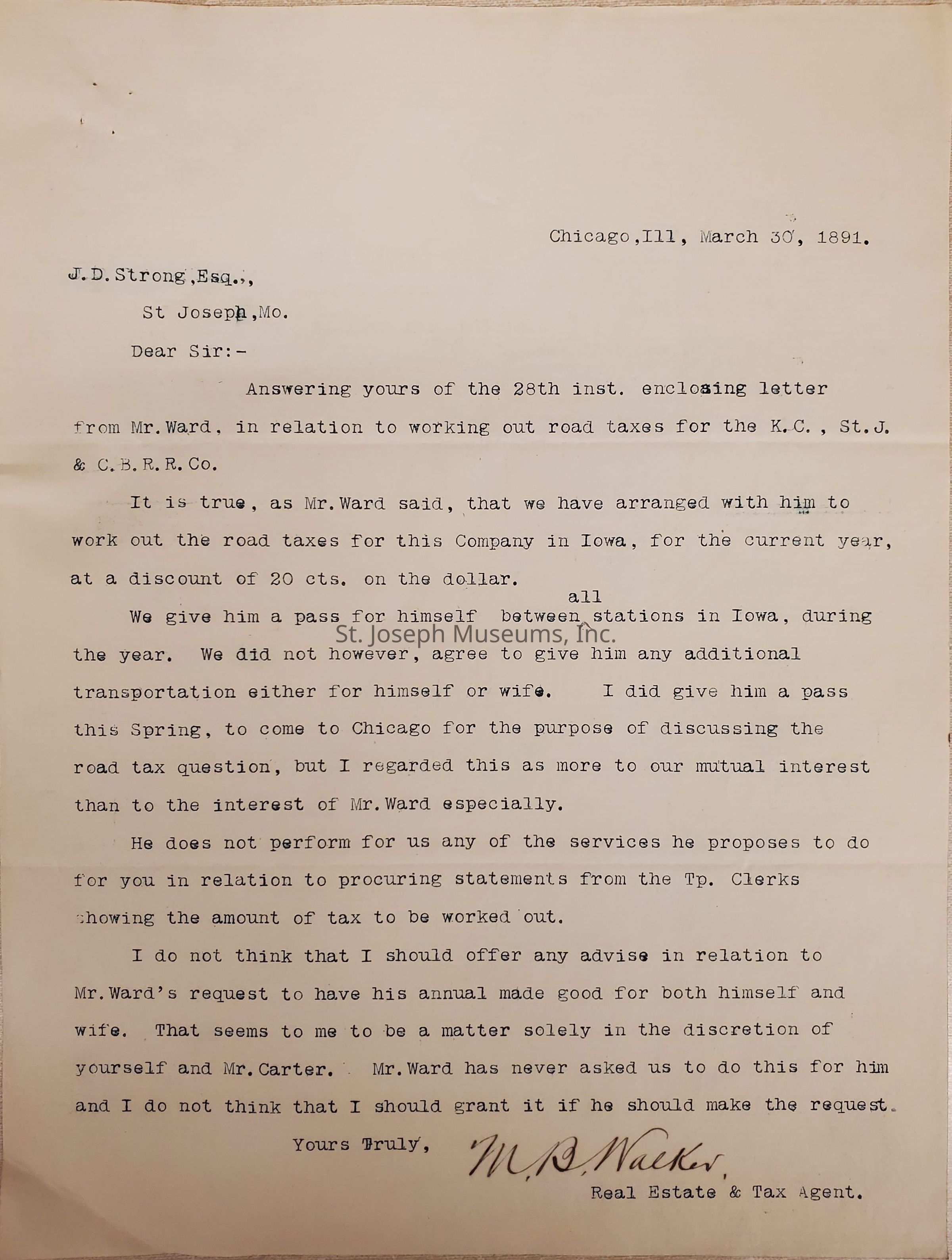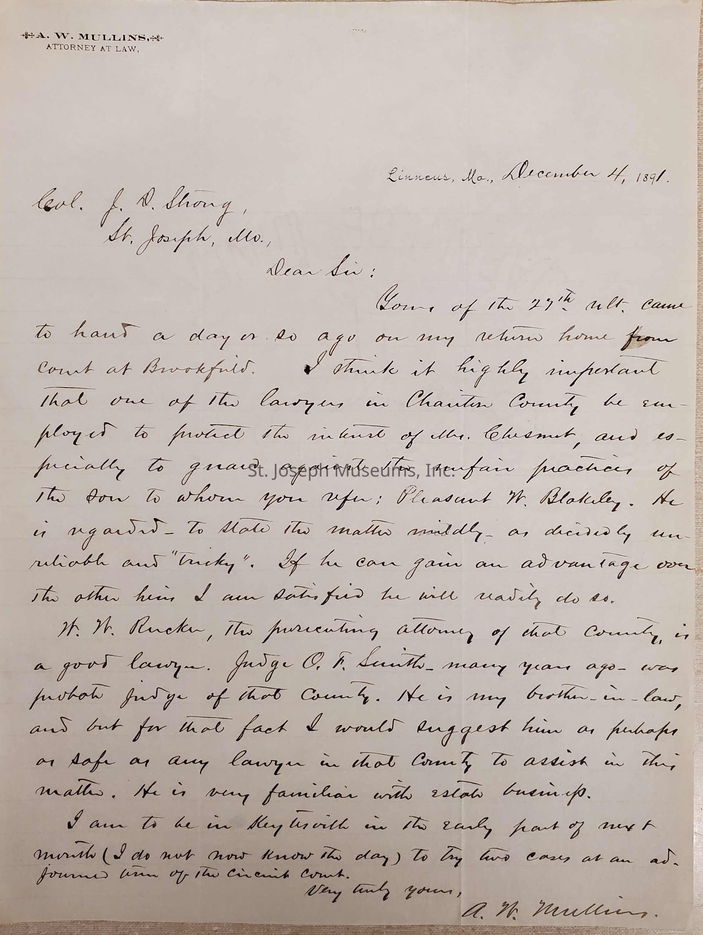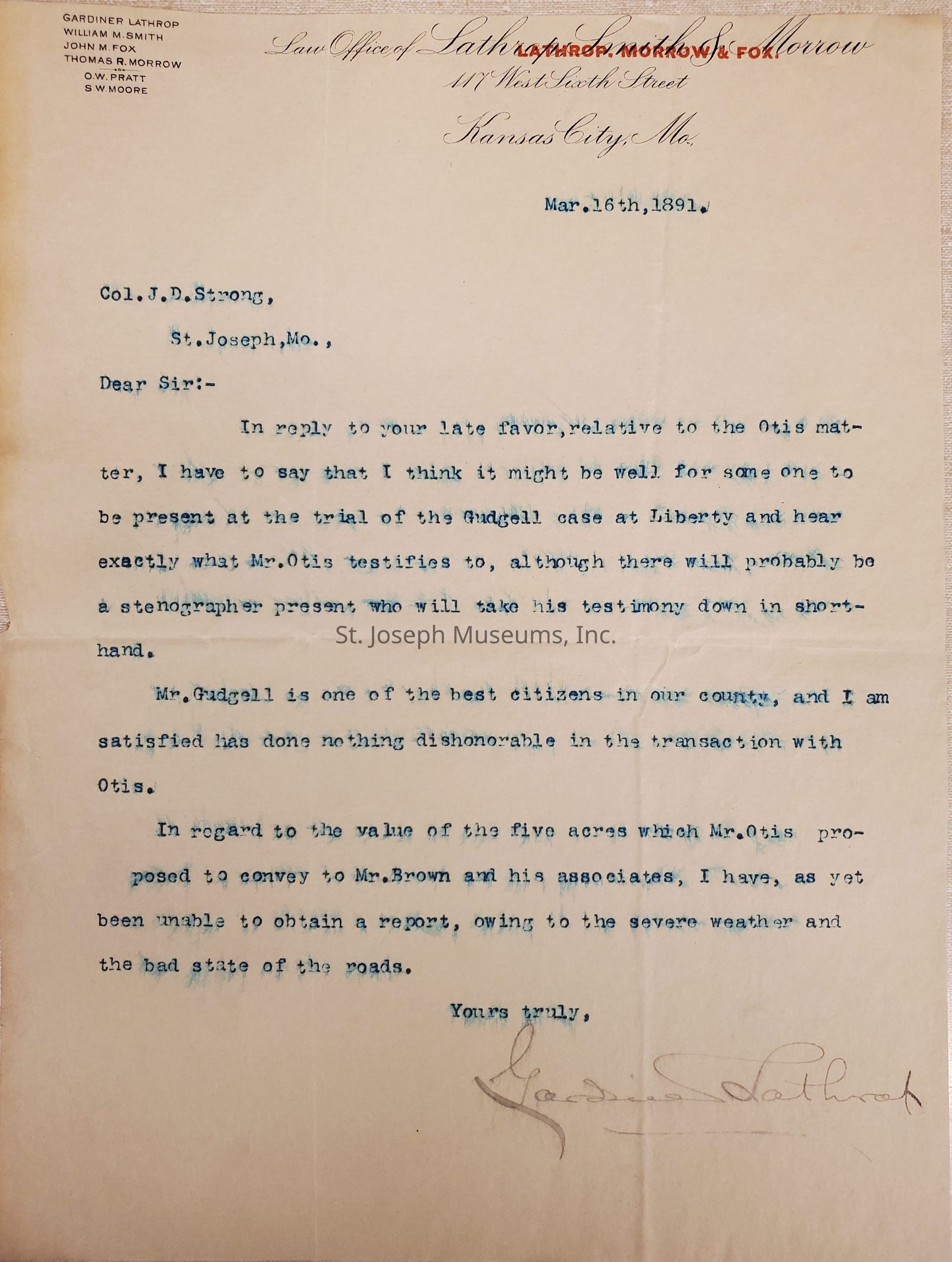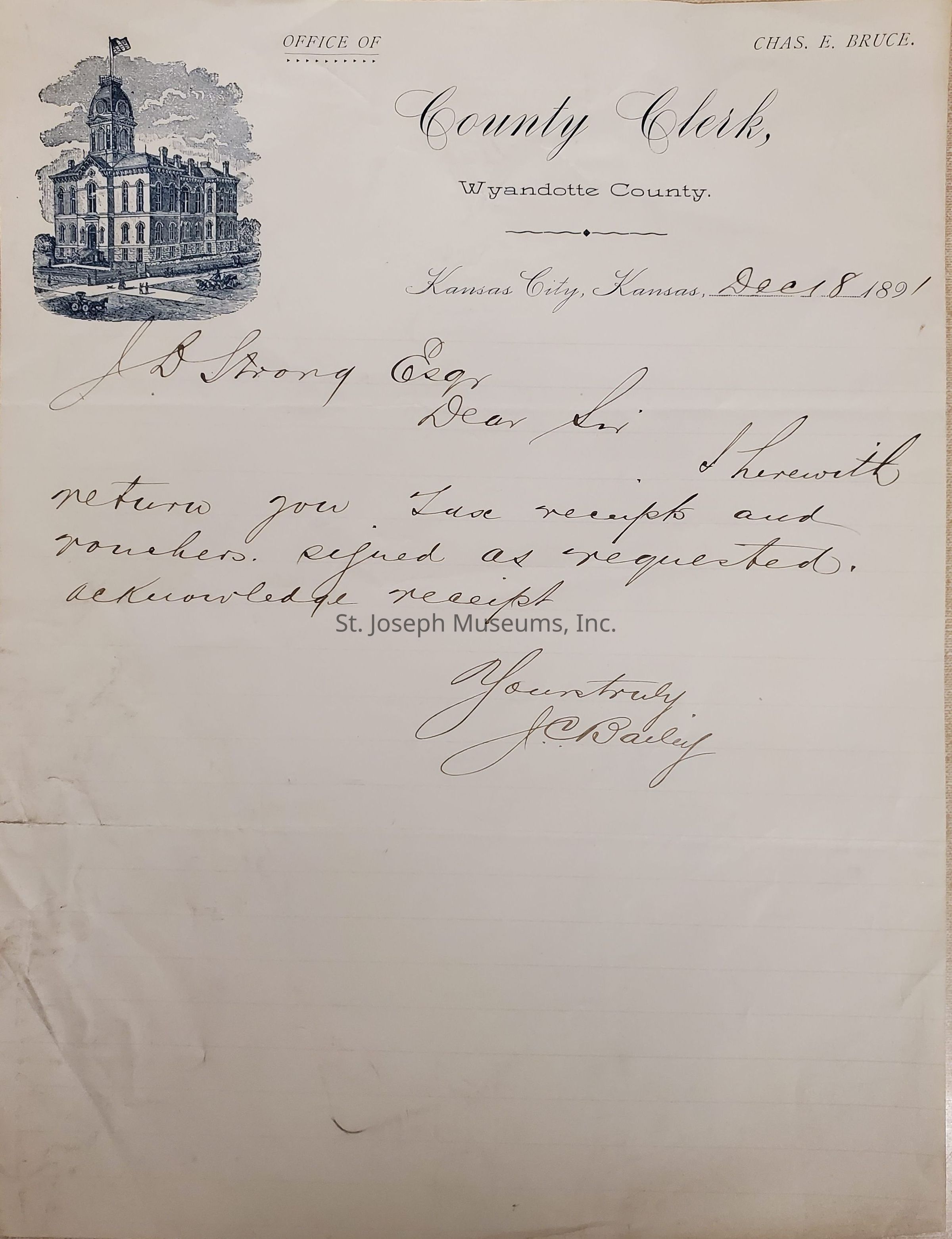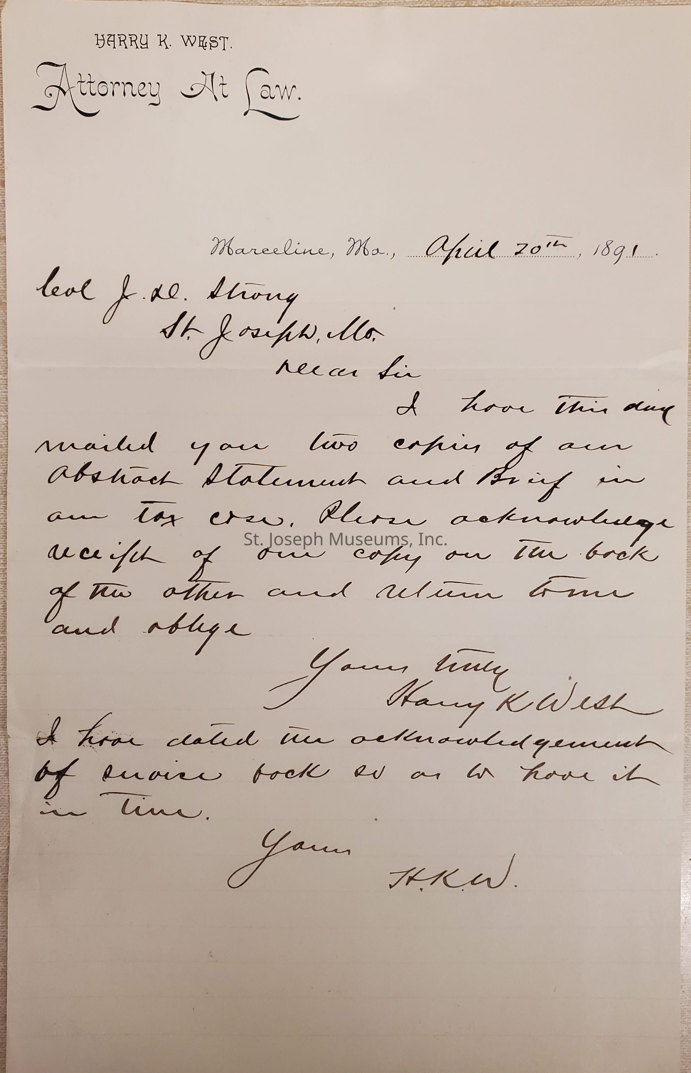 J. D. Strong was an attorney in St. Joseph. He was also a Judge, perhaps a U. S. Judge, as his cases are digested in Central Law Journal, 1880. At one time he was in the law department of the St. Joseph Kansas City and Council Bluff's Railroad. He lived on the south side of Felix Street between 13th and 14th Street. He was married to Mary E. Strong and had two sons, also lawyers, John W. and James W.