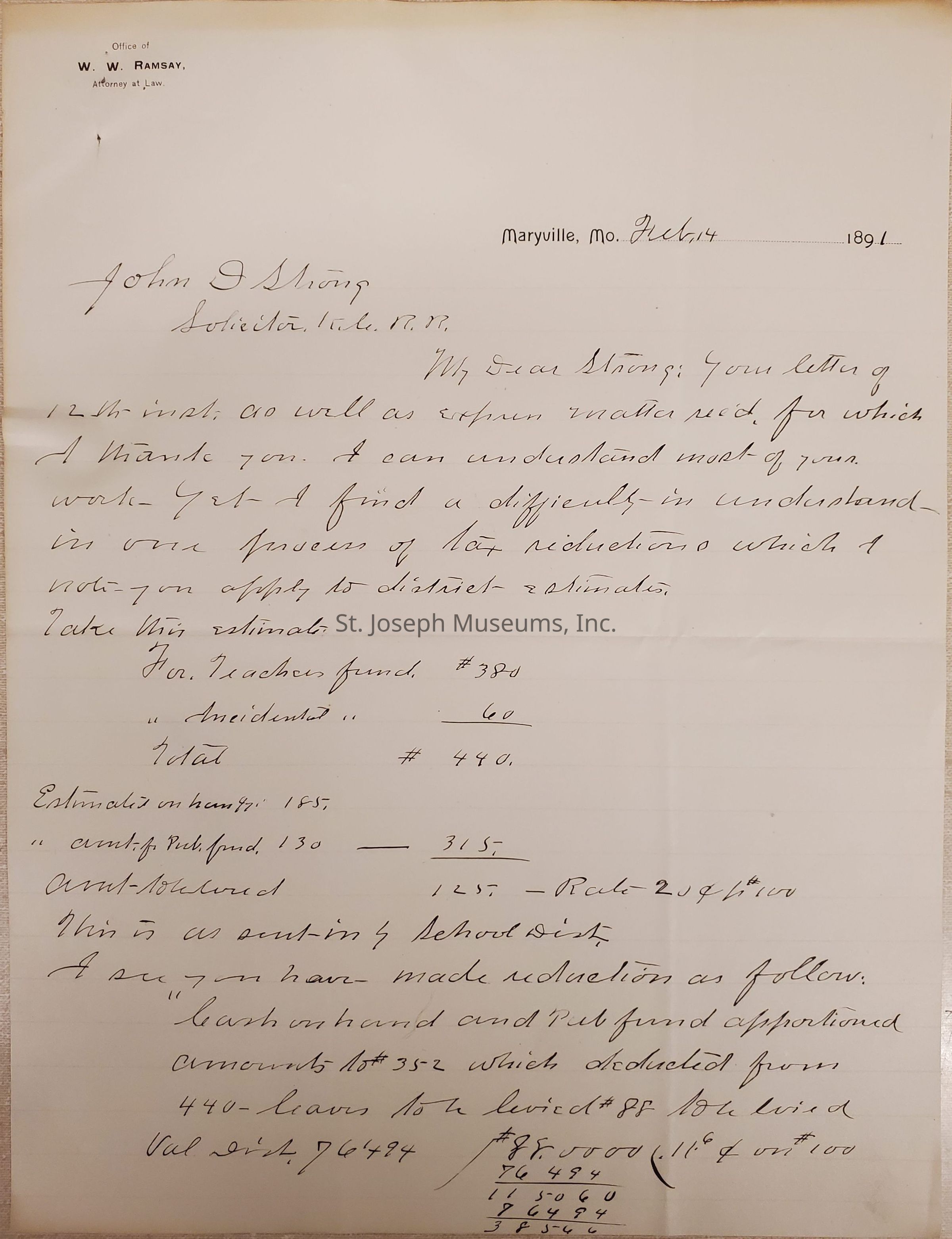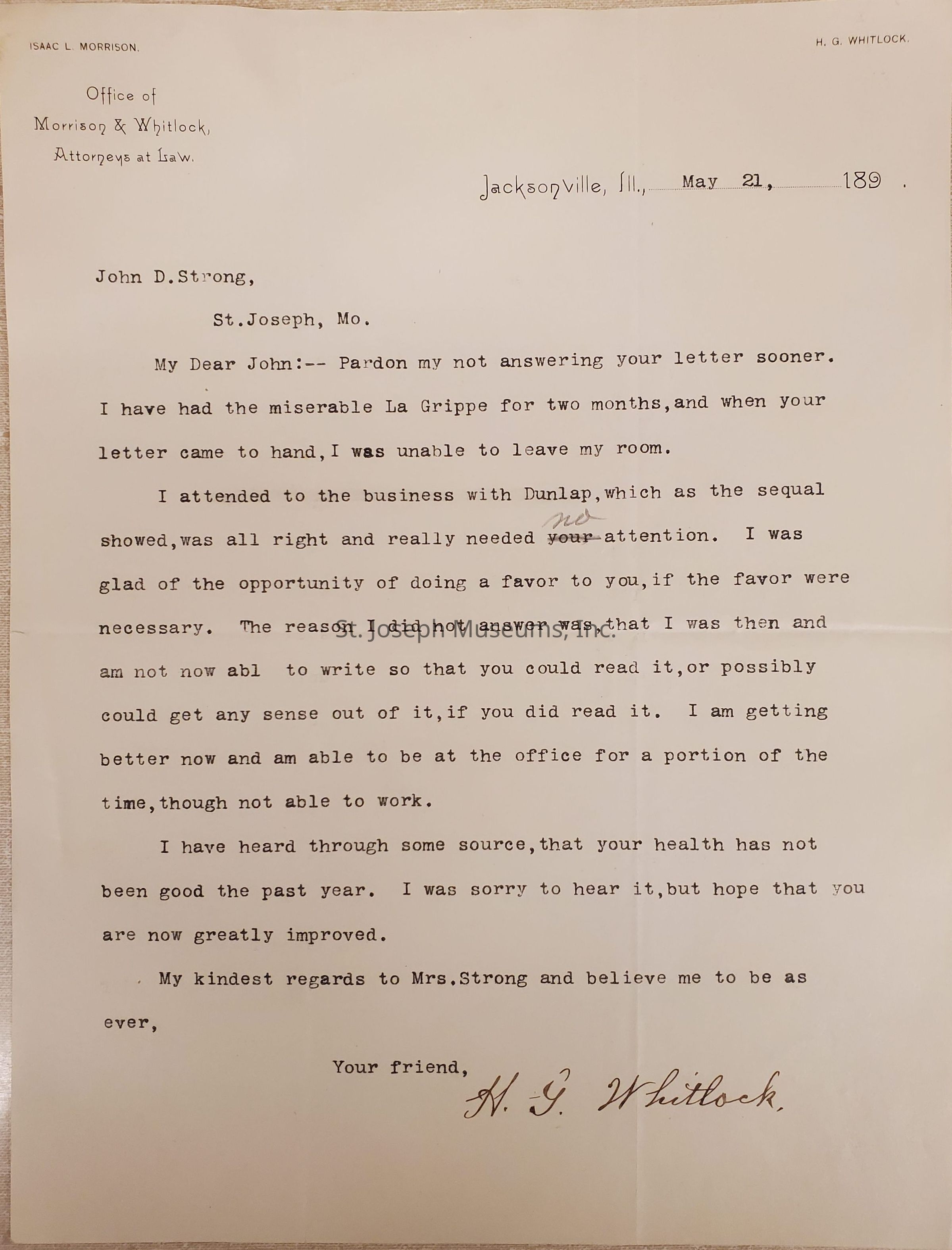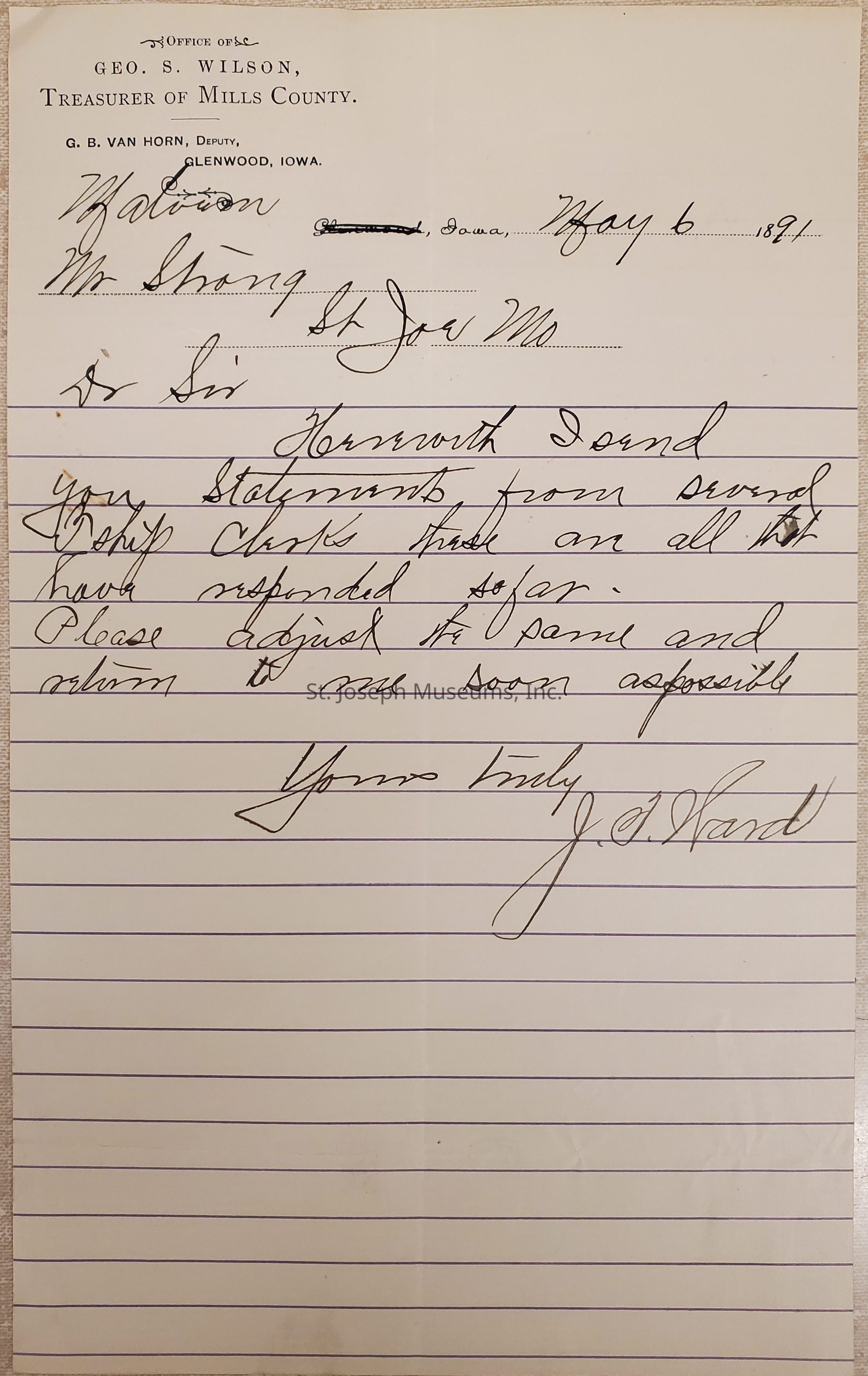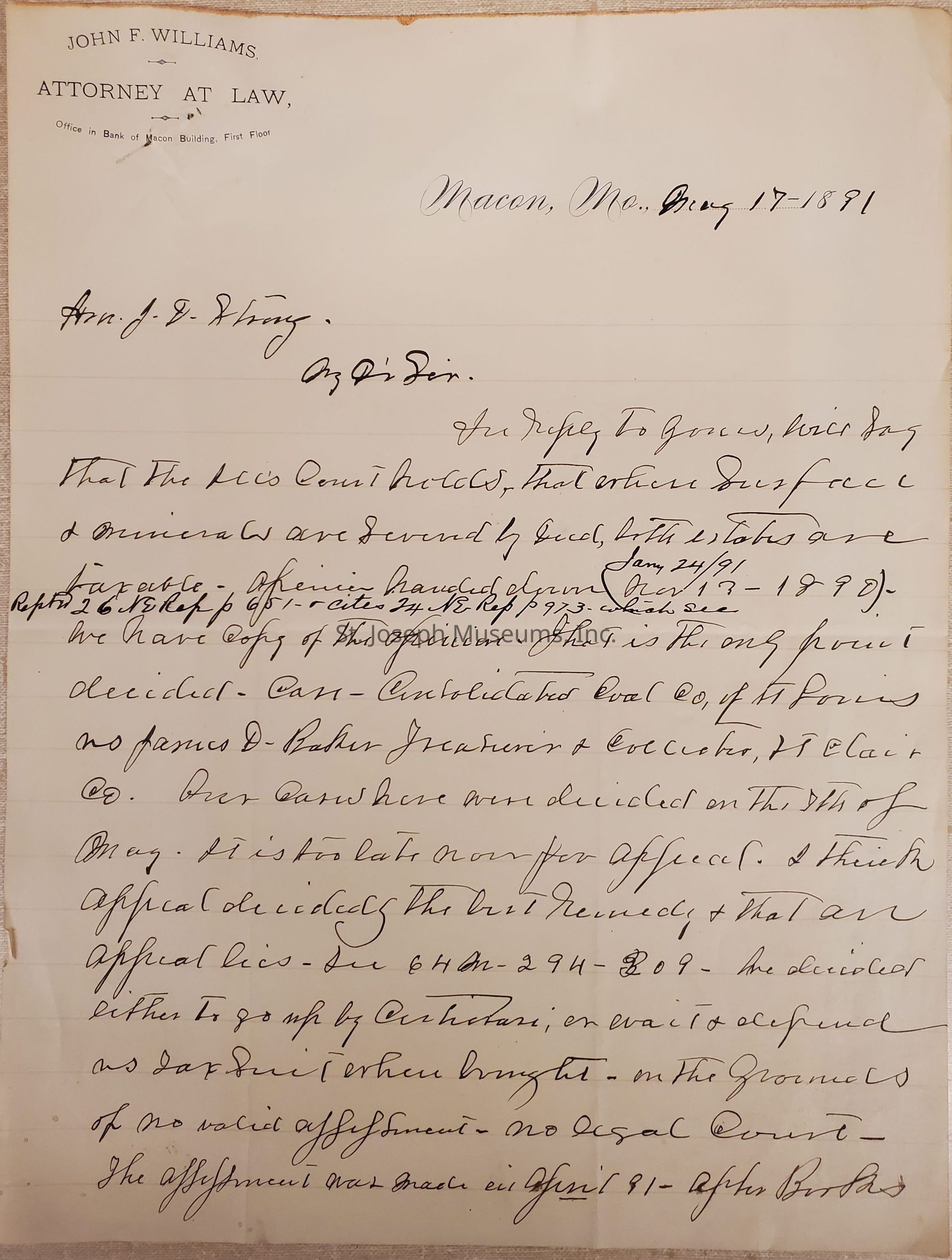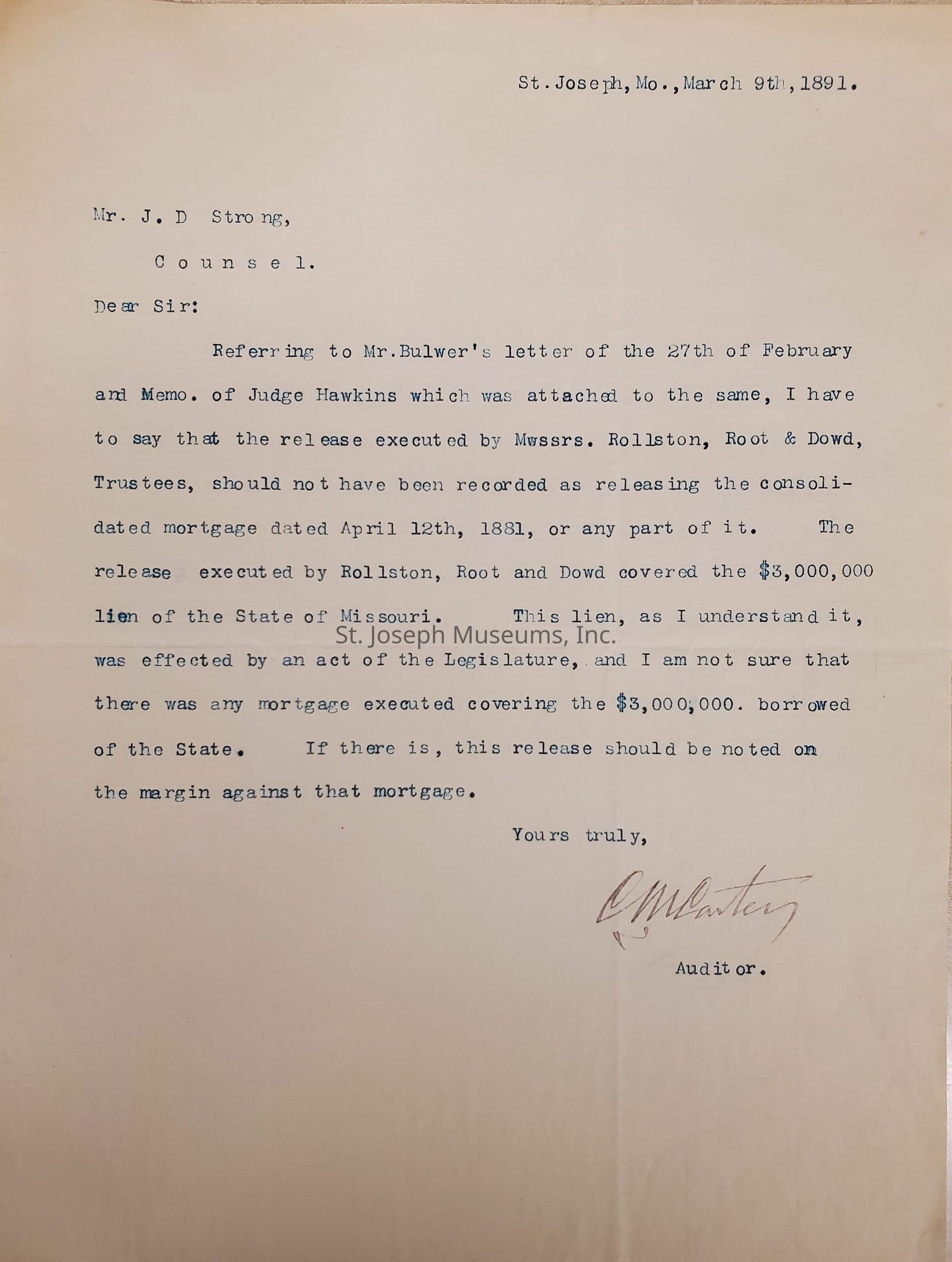 J. D. Strong was an attorney in St. Joseph. He was also a Judge, perhaps a U. S. Judge, as his cases are digested in Central Law Journal, 1880. At one time he was in the law department of the St. Joseph Kansas City and Council Bluff's Railroad. He lived on the south side of Felix Street between 13th and 14th Street. He was married to Mary E. Strong and had two sons, also lawyers, John W. and James W.